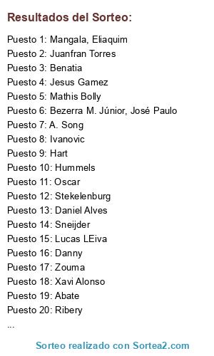 Lista de participantes: Lloris , Pisczek, Piqué, Barzagli, Criscito, Ramires, Hulk, William, Silva, Agüero, Bale, Hart, Abate, Vertonhgen, Luiz Gustavo, Lucas, Luis Suárez, Mkhitaryan, Varane, Constant, Farfán, L.Muriel, IKER CASILLAS, JOAO PEREIRA, CHIELLINI, DANTE, ASHLEY COLE, JAVI MARTINEZ, DE ROSSI, JESUS NAVAS, JUAN MATA, ASHLEY YOUNG, CAVANI, D. LOPEZ, CAMPAGNARO, ADRIANO, SANDRO, RAKITIC, MANZDUKIC, TOMAS MULLER, JOAO MOUTINHO, DIEGO MILITO, MICHAEL CARRICK, LAMELA, Akinfeed, Daniel Alves, Thiago Silva, Puyol, Marcelo, Xavi Alonso, Fabregas, Ronaldinho, Villa, Tevez, Messi, Victor Valdes, Mascherano, M.Richards, Modric, Kaka, Nani, Vela, Baines, Sakho, Borja Valero, Llorente, Thibaut Courtois, Bacary Sagna, Hummels, Kompany, Filipe Luiz, Sergio Busquets, Ángel Di Maria, Arda Turan, Mario Götze, Zlatan Ibrahimovic, Robert Lewandowski, DeGea, David Luiz, Sinji Kagawa, Karim Benzema, James Rodriguez, Diego Costa, Juanfran Torres, Anderson Hernandes (Hernanes), Dedé, Cristian Tello, Fábio Coentrao, Weidenfeller, Roman, Carvajal Ramos, Daniel, Ogbonna, Angelo, Mangala, Eliaquim, Pereira dos Santos, Eliseu, Fellaini, Marouane, Wakaso, Mubarak, Lichtsteiner, Stephan, Giovinco, Sebastian, dos Santos, Giovani, Aubameyang, Pierre-Emerick, Pacheco Antunes, Vitorino, Shaqiri, Xherdan, Doumbia, Pogba, Paul, Bezerra M. Júnior, José Paulo, Valbuena, Mathieu, Caldeira Duarte, Bernard Anício, Nunes Jesus, Juan Guilherme, Martinez Berridi, Iñigo, Sarıoğlu, Sabri, René adler, Drogba, Robben, Hazzard, Muniain, Lucas LEiva, Felipe Melo, Alaba, Vidic, Subotic, Zabaleta, Stekelenburg, Guarin , Miranda , Jesé Rodriguez , Deulefeu , Essien, M'Vila , Isco , TIote, Marquinhos, Koke, Howard, Buffon, G. Johnson, A. Koloarov, Coloccini, J. Lescott, YaYa Toure, Sahim, Ribery, Lennon, rooney, etoo, Jefferson, P. jones, B. Assou-ekotto, Rever, Ozil, Oscar, A. Pato, H. Badstuber, Beñat, Thiago, R. Palacio, Samir Handanovic, P. Lahm, J. Boateng, Ivanovic, Jordi Alba, Xavi, Pirlo, Iniesta, Diego, Jakub Błaszczykowski, Falcao, Sirigu, Benatia, Guardado, Nasrri, Matuidi, Di Natale, J. Hernandez, Marek Hamšík, Mbark Boussoufa, Valencia, Jovetik, P. Čech, G. Clichy, Sergio Ramos, D. Agger, K. Walker, S. Khedira, Santi Cazorla,, T. Kroos, M. Reus, Pedro, R. van Persie, Soldado, T. Walcott, A. Diamanti, A. Song, Alex Sandro, Y. Kaboul, F. Marchetti, Danny, Gerrard, A. Konko, A. Chedjou, Lucas Barrios, Lee Dong Gook, Thierry Henry, Mcgeady, Cuadrado, Ben Arfa, Bibiani, Eriksen, Gourfcouff, Honda, Alberto Costa, Inler, Garay, Zouma, Skrtel, Kosciielsny, Mathis Bolly, Mauricio Isla, Hugo Mallo, Edu Albacar, Ruffier, Begovic, Neuer, Srna, Pepe, Ferdinand, Evra, Lavezzi, Cristiano Ronaldo, Gundogan , Schweisteiger, Vidal, M. Gómez, Mandanda, Maicon, Godin, Marchisio, Alexissanches, Balotelli, Neymar, Sneijder, El sharaawy, Rami, Jose enrique, Jose Reina, M. Debuchy , B. Howedes, J. Terry, M. Schmelzer, F. lampard, R. Montolivo, Y. Cabaye, F. Totti, M. Klose , Bojan Krkic, F. Muslera, Jesus Gamez , Demichelis, R. Van der Vaart, A. Candreva, S. Bender, Mirco Vucinic, K Gibbs, J. Wilshere, R. Allesandrini, L. Podolsky.