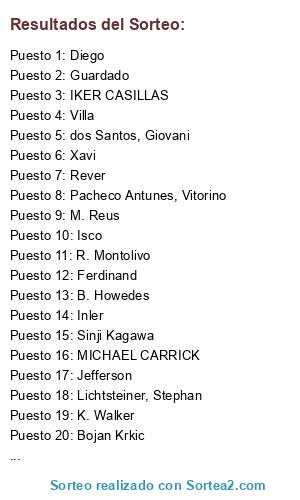 Lista de participantes: Lloris , Pisczek, Piqué, Barzagli, Criscito, Ramires, Hulk, William, Silva, Agüero, Bale, Hart, Abate, Vertonhgen, Luiz Gustavo, Lucas, Luis Suárez, Mkhitaryan, Varane, Constant, Farfán, L.Muriel, IKER CASILLAS, JOAO PEREIRA, CHIELLINI, DANTE, ASHLEY COLE, JAVI MARTINEZ, DE ROSSI, JESUS NAVAS, JUAN MATA, ASHLEY YOUNG, CAVANI, D. LOPEZ, CAMPAGNARO, ADRIANO, SANDRO, RAKITIC, MANZDUKIC, TOMAS MULLER, JOAO MOUTINHO, DIEGO MILITO, MICHAEL CARRICK, LAMELA, Akinfeed, Daniel Alves, Thiago Silva, Puyol, Marcelo, Xavi Alonso, Fabregas, Ronaldinho, Villa, Tevez, Messi, Victor Valdes, Mascherano, M.Richards, Modric, Kaka, Nani, Vela, Baines, Sakho, Borja Valero, Llorente, Thibaut Courtois, Bacary Sagna, Hummels, Kompany, Filipe Luiz, Sergio Busquets, Ángel Di Maria, Arda Turan, Mario Götze, Zlatan Ibrahimovic, Robert Lewandowski, DeGea, David Luiz, Sinji Kagawa, Karim Benzema, James Rodriguez, Diego Costa, Juanfran Torres, Anderson Hernandes (Hernanes), Dedé, Cristian Tello, Fábio Coentrao, Weidenfeller, Roman, Carvajal Ramos, Daniel, Ogbonna, Angelo, Mangala, Eliaquim, Pereira dos Santos, Eliseu, Fellaini, Marouane, Wakaso, Mubarak, Lichtsteiner, Stephan, Giovinco, Sebastian, dos Santos, Giovani, Aubameyang, Pierre-Emerick, Pacheco Antunes, Vitorino, Shaqiri, Xherdan, Doumbia, Pogba, Paul, Bezerra M. Júnior, José Paulo, Valbuena, Mathieu, Caldeira Duarte, Bernard Anício, Nunes Jesus, Juan Guilherme, Martinez Berridi, Iñigo, Sarıoğlu, Sabri, René adler, Drogba, Robben, Hazzard, Muniain, Lucas LEiva, Felipe Melo, Alaba, Vidic, Subotic, Zabaleta, Stekelenburg, Guarin , Miranda , Jesé Rodriguez , Deulefeu , Essien, M'Vila , Isco , TIote, Marquinhos, Koke, Howard, Buffon, G. Johnson, A. Koloarov, Coloccini, J. Lescott, YaYa Toure, Sahim, Ribery, Lennon, rooney, etoo, Jefferson, P. jones, B. Assou-ekotto, Rever, Ozil, Oscar, A. Pato, H. Badstuber, Beñat, Thiago, R. Palacio, Samir Handanovic, P. Lahm, J. Boateng, Ivanovic, Jordi Alba, Xavi, Pirlo, Iniesta, Diego, Jakub Błaszczykowski, Falcao, Sirigu, Benatia, Guardado, Nasrri, Matuidi, Di Natale, J. Hernandez, Marek Hamšík, Mbark Boussoufa, Valencia, Jovetik, P. Čech, G. Clichy, Sergio Ramos, D. Agger, K. Walker, S. Khedira, Santi Cazorla,, T. Kroos, M. Reus, Pedro, R. van Persie, Soldado, T. Walcott, A. Diamanti, A. Song, Alex Sandro, Y. Kaboul, F. Marchetti, Danny, Gerrard, A. Konko, A. Chedjou, Lucas Barrios, Lee Dong Gook, Thierry Henry, Mcgeady, Cuadrado, Ben Arfa, Bibiani, Eriksen, Gourfcouff, Honda, Alberto Costa, Inler, Garay, Zouma, Skrtel, Kosciielsny, Mathis Bolly, Mauricio Isla, Hugo Mallo, Edu Albacar, Ruffier, Begovic, Neuer, Srna, Pepe, Ferdinand, Evra, Lavezzi, Cristiano Ronaldo, Gundogan , Schweisteiger, Vidal, M. Gómez, Mandanda, Maicon, Godin, Marchisio, Alexissanches, Balotelli, Neymar, Sneijder, El sharaawy, Rami, Jose enrique, Jose Reina, M. Debuchy , B. Howedes, J. Terry, M. Schmelzer, F. lampard, R. Montolivo, Y. Cabaye, F. Totti, M. Klose , Bojan Krkic, F. Muslera, Jesus Gamez , Demichelis, R. Van der Vaart, A. Candreva, S. Bender, Mirco Vucinic, K Gibbs, J. Wilshere, R. Allesandrini, L. Podolsky.