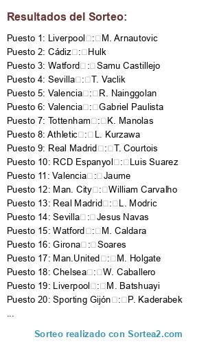 Lista de participantes: Arsenal : L. Insigne, Arsenal : A. Robben, Arsenal : Arturo Vidal, Arsenal : L. Hradecky, Arsenal : Rodrigo, Arsenal : H. Mkhitaryan, Arsenal : S. Mustafi, Arsenal : A. Ramsey, Arsenal : J. Stones, Arsenal : Fabian, Arsenal : A. Rudiger, Arsenal : M. Sanson, Arsenal : Mariano, Arsenal : C. Pavon, Arsenal : Lautaro Martinez, Arsenal : K. Asamoah, Arsenal : S. Aurier, Arsenal : A. Hurtado, Arsenal : E. Valencia, Arsenal : E. Martinez, Athletic : Neymar, Athletic : A. Griezmann, Athletic : Thiago Silva, Athletic : G. Buffon, Athletic : N. Fekir, Athletic : Paulinho Becerra, Athletic : M. Reus, Athletic : P. Kimpembe, Athletic : A. Rabiot, Athletic : G. Kondogbia, Athletic : Dani Alves, Athletic : L. Kurzawa, Athletic : F. Coquelin, Athletic : A. Golovin, Athletic : De Marcos, Athletic : Ruben Dias, Athletic : J. Roussillon, Athletic : T. Kehrer, Athletic : Yeray, Athletic : R. Ozcan, Athletic : A. Musa, Barcelona : Aleña, Barcelona : M. ter Stegen, Barcelona : B. Matuidi, Barcelona : C. Lenglet, Barcelona : Coutinho, Barcelona : K. Mbappe, Barcelona : Fabinho, Barcelona : I. Rakitic, Barcelona : R. Mahrez, Barcelona : J. Cillessen, Barcelona : H. Son, Barcelona : M. Depay, Barcelona : L. Goretzka, Barcelona : Jordi Alba, Barcelona : O. Dembele, Barcelona : Pique, Barcelona : Hector Bellerin, Barcelona : Rafinha Alcantara, Barcelona : S. Umtiti, Barcelona : Sergi Roberto, Cádiz : J. Oblak, Cádiz : R. Lukaku, Cádiz : Filipe Luis, Cádiz : J. Gimenez, Cádiz : Gabriel Jesus, Cádiz : S. Kagawa, Cádiz : Rodri, Cádiz : I. Gueye, Cádiz : T. Partey, Cádiz : A. Lallana, Cádiz : J. Milner, Cádiz : Hulk, Cádiz : R. Lewandowski, Cádiz : Juanfran, Cádiz : N. Kalinic, Cádiz : M. Hitz, Cádiz : Capa, Cádiz : Y. Mina, Cádiz : E. Badu, Chelsea : James Rodriguez, Chelsea : Willian, Chelsea : Kepa, Chelsea : A. Martial, Chelsea : Marcos Alonso, Chelsea : A. Christensen, Chelsea : Pedro, Chelsea : J. Henderson, Chelsea : Lucas Moura, Chelsea : Marlos, Chelsea : Andre Gomes, Chelsea : K. Bellarabi, Chelsea : Maximiliano Gómez, Chelsea : J. Weigl, Chelsea : N. Tagliafico, Chelsea : R. Barkley, Chelsea : S. Feghouli, Chelsea : V. Moses, Chelsea : W. Caballero, Chelsea : Merih Demiral, Chelsea : Javier Puado Díaz, Everton : Ederson, Everton : D. Alaba, Everton : S.Milinkovic-Savic, Everton : M. Skriniar, Everton : A. Di Maria, Everton : J. Pickford, Everton : L. Bailey, Everton : J. Vardy, Everton : Allan, Everton : M. Rashford, Everton : K. Balde, Everton : H. Lozano, Everton : Bruma, Everton : Lucas Paquetá, Everton : T. Ndombele, Everton : F. de Jong, Everton : M. Akanji, Everton : Dalbert, Everton : M. Antonio, Everton : Mario Hermoso, Everton : J. Sancho, Everton : N. Pepe, Everton : L. Advincula, Everton : D. Dumfries, Girona : K. De Bruyne, Girona : A. Sanchez, Girona : Naldo, Girona : M. Verratti, Girona : T. Horn, Girona : Illarramendi, Girona : Q. Promes, Girona : L. Hernandez, Girona : J. Mathieu, Girona : F. Smolov, Girona : Nelson Semedo, Girona : F. Cervi, Girona : M. Sakho, Girona : T. Walcott, Girona : Soares, Girona : A. Begovic, Girona : E. Lavezzi, Girona : J. Gbamin, Girona : G. Conti, Girona : S. Ristovski, Liverpool : E. Hazard, Liverpool : M. Salah, Liverpool : Roberto Firmino, Liverpool : T. Alderweireld, Liverpool : Alisson, Liverpool : V. van Dijk, Liverpool : Pepe, Liverpool : N. Keita, Liverpool : T. Lemar, Liverpool : G. Wijnaldum, Liverpool : M. Arnautovic, Liverpool : X. Shaqiri, Liverpool : D. Lovren, Liverpool : A. Robertson, Liverpool : A. Doucoure, Liverpool : M. Batshuayi, Liverpool : N. Clyne, Liverpool : L. Paredes, Liverpool : S. Mignolet, Liverpool : T. Alexander-Arnold, Liverpool : Vinicius Junior, Man. City : David Silva, Man. City : S. Handanovic, Man. City : N. Otamendi, Man. City : Fernandinho, Man. City : V. Kompany, Man. City : R. Sterling, Man. City : K. Walker, Man. City : Bernardo Silva, Man. City : I. Gundogan, Man. City : William Carvalho, Man. City : D. Sanchez, Man. City : Y. Carrasco, Man. City : A. Laporte, Man. City : L. Messi, Man. City : J. Lingard, Man. City : B. Mendy, Man. City : F. Delph, Man. City : A. Yarmolenko, Man. City : C. Bravo, Man. City : E. Mangala, Man.United : De Gea, Man.United : P. Pogba, Man.United : P. Aubameyang, Man.United : D. Mertens, Man.United : M. Pjanic, Man.United : N. Matic, Man.United : J. Cuadrado, Man.United : J. Draxler, Man.United : K. Coman, Man.United : E. Bailly, Man.United : Fred, Man.United : C. Smalling, Man.United : I. Piatti, Man.United : S. Kolasinac, Man.United : L. Shaw, Man.United : J. King, Man.United : K. Zouma, Man.United : R. Alessandrini, Man.United : M. Holgate, Man.United : H. Onyekuru, Man.United : C. Kouyate, Man.United : D. Yedlin, Man.United : D. Machis, Man.United : D. Amartey, Man.United : C. Vela, Man.United : S. Romero, Newcastle : Cristiano Ronaldo, Newcastle : T. Kroos, Newcastle : E. Cavani, Newcastle : G. Chiellini, Newcastle : P. Dybala, Newcastle : M. Özil, Newcastle : L. Bonucci, Newcastle : Alex Sandro, Newcastle : Douglas Costa, Newcastle : Miranda, Newcastle : W. Szcz?sny, Newcastle : Morata, Newcastle : Nacho Fernandez, Newcastle : Joao Cancelo, Newcastle : Joao Mario, Newcastle : C. Pulisic, Newcastle : M. De Sciglio, Newcastle : S. Bergwijn, RCD Espanyol : Luis Suarez, RCD Espanyol : M. Neuer, RCD Espanyol : N'Golo Kanté, RCD Espanyol : Casemiro, RCD Espanyol : M. Icardi, RCD Espanyol : T. Muller, RCD Espanyol : Azpilicueta, RCD Espanyol : Sokratis, RCD Espanyol : B. Leno, RCD Espanyol : Lucas Vazquez, RCD Espanyol : E. Banega, RCD Espanyol : S. Gnabry, RCD Espanyol : F. Bernardeschi, RCD Espanyol : S. Vrsaljko, RCD Espanyol : G. Lo Celso, RCD Espanyol : K. Vogt, RCD Espanyol : M. Politano, RCD Espanyol : Iñigo Martinez, RCD Espanyol : K. Havertz, RCD Espanyol : N. Schulz, RCD Espanyol : Juan Jesus, Real Betis Balompie : Sergio Busquets, Real Betis Balompie : K. Koulibaly, Real Betis Balompie : Koke, Real Betis Balompie : Iago Aspas, R