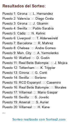 Lista de participantes: Arsenal : L. Insigne, Arsenal : A. Robben, Arsenal : Arturo Vidal, Arsenal : L. Hradecky, Arsenal : Rodrigo, Arsenal : H. Mkhitaryan, Arsenal : S. Mustafi, Arsenal : A. Ramsey, Arsenal : J. Stones, Arsenal : Fabian, Arsenal : A. Rudiger, Arsenal : M. Sanson, Arsenal : Mariano, Arsenal : C. Pavon, Arsenal : Lautaro Martinez, Arsenal : K. Asamoah, Arsenal : S. Aurier, Arsenal : A. Hurtado, Arsenal : E. Valencia, Arsenal : E. Martinez, Athletic : Neymar, Athletic : A. Griezmann, Athletic : Thiago Silva, Athletic : G. Buffon, Athletic : N. Fekir, Athletic : Paulinho Becerra, Athletic : M. Reus, Athletic : P. Kimpembe, Athletic : A. Rabiot, Athletic : G. Kondogbia, Athletic : Dani Alves, Athletic : L. Kurzawa, Athletic : F. Coquelin, Athletic : A. Golovin, Athletic : De Marcos, Athletic : Ruben Dias, Athletic : J. Roussillon, Athletic : T. Kehrer, Athletic : Yeray, Athletic : R. Ozcan, Athletic : A. Musa, Barcelona : Aleña, Barcelona : M. ter Stegen, Barcelona : B. Matuidi, Barcelona : C. Lenglet, Barcelona : Coutinho, Barcelona : K. Mbappe, Barcelona : Fabinho, Barcelona : I. Rakitic, Barcelona : R. Mahrez, Barcelona : J. Cillessen, Barcelona : H. Son, Barcelona : M. Depay, Barcelona : L. Goretzka, Barcelona : Jordi Alba, Barcelona : O. Dembele, Barcelona : Pique, Barcelona : Hector Bellerin, Barcelona : Rafinha Alcantara, Barcelona : S. Umtiti, Barcelona : Sergi Roberto, Cádiz : J. Oblak, Cádiz : R. Lukaku, Cádiz : Filipe Luis, Cádiz : J. Gimenez, Cádiz : Gabriel Jesus, Cádiz : S. Kagawa, Cádiz : Rodri, Cádiz : I. Gueye, Cádiz : T. Partey, Cádiz : A. Lallana, Cádiz : J. Milner, Cádiz : Hulk, Cádiz : R. Lewandowski, Cádiz : Juanfran, Cádiz : N. Kalinic, Cádiz : M. Hitz, Cádiz : Capa, Cádiz : Y. Mina, Cádiz : E. Badu, Chelsea : James Rodriguez, Chelsea : Willian, Chelsea : Kepa, Chelsea : A. Martial, Chelsea : Marcos Alonso, Chelsea : A. Christensen, Chelsea : Pedro, Chelsea : J. Henderson, Chelsea : Lucas Moura, Chelsea : Marlos, Chelsea : Andre Gomes, Chelsea : K. Bellarabi, Chelsea : Maximiliano Gómez, Chelsea : J. Weigl, Chelsea : N. Tagliafico, Chelsea : R. Barkley, Chelsea : S. Feghouli, Chelsea : V. Moses, Chelsea : W. Caballero, Chelsea : Merih Demiral, Chelsea : Javier Puado Díaz, Everton : Ederson, Everton : D. Alaba, Everton : S.Milinkovic-Savic, Everton : M. Skriniar, Everton : A. Di Maria, Everton : J. Pickford, Everton : L. Bailey, Everton : J. Vardy, Everton : Allan, Everton : M. Rashford, Everton : K. Balde, Everton : H. Lozano, Everton : Bruma, Everton : Lucas Paquetá, Everton : T. Ndombele, Everton : F. de Jong, Everton : M. Akanji, Everton : Dalbert, Everton : M. Antonio, Everton : Mario Hermoso, Everton : J. Sancho, Everton : N. Pepe, Everton : L. Advincula, Everton : D. Dumfries, Girona : K. De Bruyne, Girona : A. Sanchez, Girona : Naldo, Girona : M. Verratti, Girona : T. Horn, Girona : Illarramendi, Girona : Q. Promes, Girona : L. Hernandez, Girona : J. Mathieu, Girona : F. Smolov, Girona : Nelson Semedo, Girona : F. Cervi, Girona : M. Sakho, Girona : T. Walcott, Girona : Soares, Girona : A. Begovic, Girona : E. Lavezzi, Girona : J. Gbamin, Girona : G. Conti, Girona : S. Ristovski, Liverpool : E. Hazard, Liverpool : M. Salah, Liverpool : Roberto Firmino, Liverpool : T. Alderweireld, Liverpool : Alisson, Liverpool : V. van Dijk, Liverpool : Pepe, Liverpool : N. Keita, Liverpool : T. Lemar, Liverpool : G. Wijnaldum, Liverpool : M. Arnautovic, Liverpool : X. Shaqiri, Liverpool : D. Lovren, Liverpool : A. Robertson, Liverpool : A. Doucoure, Liverpool : M. Batshuayi, Liverpool : N. Clyne, Liverpool : L. Paredes, Liverpool : S. Mignolet, Liverpool : T. Alexander-Arnold, Liverpool : Vinicius Junior, Man. City : David Silva, Man. City : S. Handanovic, Man. City : N. Otamendi, Man. City : Fernandinho, Man. City : V. Kompany, Man. City : R. Sterling, Man. City : K. Walker, Man. City : Bernardo Silva, Man. City : I. Gundogan, Man. City : William Carvalho, Man. City : D. Sanchez, Man. City : Y. Carrasco, Man. City : A. Laporte, Man. City : L. Messi, Man. City : J. Lingard, Man. City : B. Mendy, Man. City : F. Delph, Man. City : A. Yarmolenko, Man. City : C. Bravo, Man. City : E. Mangala, Man.United : De Gea, Man.United : P. Pogba, Man.United : P. Aubameyang, Man.United : D. Mertens, Man.United : M. Pjanic, Man.United : N. Matic, Man.United : J. Cuadrado, Man.United : J. Draxler, Man.United : K. Coman, Man.United : E. Bailly, Man.United : Fred, Man.United : C. Smalling, Man.United : I. Piatti, Man.United : S. Kolasinac, Man.United : L. Shaw, Man.United : J. King, Man.United : K. Zouma, Man.United : R. Alessandrini, Man.United : M. Holgate, Man.United : H. Onyekuru, Man.United : C. Kouyate, Man.United : D. Yedlin, Man.United : D. Machis, Man.United : D. Amartey, Man.United : C. Vela, Man.United : S. Romero, Newcastle : Cristiano Ronaldo, Newcastle : T. Kroos, Newcastle : E. Cavani, Newcastle : G. Chiellini, Newcastle : P. Dybala, Newcastle : M. Özil, Newcastle : L. Bonucci, Newcastle : Alex Sandro, Newcastle : Douglas Costa, Newcastle : Miranda, Newcastle : W. Szcz?sny, Newcastle : Morata, Newcastle : Nacho Fernandez, Newcastle : Joao Cancelo, Newcastle : Joao Mario, Newcastle : C. Pulisic, Newcastle : M. De Sciglio, Newcastle : S. Bergwijn, RCD Espanyol : Luis Suarez, RCD Espanyol : M. Neuer, RCD Espanyol : N'Golo Kanté, RCD Espanyol : Casemiro, RCD Espanyol : M. Icardi, RCD Espanyol : T. Muller, RCD Espanyol : Azpilicueta, RCD Espanyol : Sokratis, RCD Espanyol : B. Leno, RCD Espanyol : Lucas Vazquez, RCD Espanyol : E. Banega, RCD Espanyol : S. Gnabry, RCD Espanyol : F. Bernardeschi, RCD Espanyol : S. Vrsaljko, RCD Espanyol : G. Lo Celso, RCD Espanyol : K. Vogt, RCD Espanyol : M. Politano, RCD Espanyol : Iñigo Martinez, RCD Espanyol : K. Havertz, RCD Espanyol : N. Schulz, RCD Espanyol : Juan Jesus, Real Betis Balompie : Sergio Busquets, Real Betis Balompie : K. Koulibaly, Real Betis Balompie : Koke, Real Betis Balompie : Iago Aspas, R