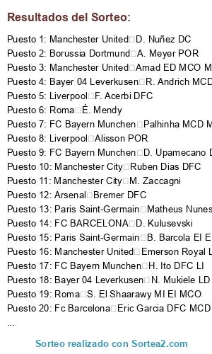 Lista de participantes: Real Madrid E. Haaland DC, Liverpool Rodri MCD MC, Roma M. Salah, Real Madrid J. Bellingham MCO MC, Real Madrid Vini Jr. EI DC, FC Bayern Munchen K. Mbappe DC EI, FC Bayern Munchen H. Kane DC, Manchester City K. De Bruyne MC MCO, Bayer 04 Leverkusen F. Wirtz MCO, Real Madrid T. Courtois POR, Manchester United R. Lewandowski DC, Fc Barcelona M. ter Stegen POR, Liverpool Alisson POR, Real Madrid F. Valverde MC MD, Manchester City C. Palmer MCO MD, Bayer 04 Leverkusen A. Rüdiger DFC, Arsenal B. Saka ED MD, Arsenal M. Ødegaard MC, Manchester City P. Foden ED EI MCO, Paris Saint-Germain W. Saliba DFC, FC Bayern Munchen D. Rice, Manchester City Ruben Dias DFC, Manchester City Theo Bernard François Hernandez, Paris Saint-Germain G. Donnarumma POR, Paris Saint-Germain Marquinhos DFC, Arsenal Gabriel DFC, Paris Saint-Germain N. Barella MC MCD, Fc Barcelona J. Musiala MCO MI MC, Real Madrid J. Tah DFC, Manchester City Ederson POR, AC Milan M. Maignan POR, FC Bayern Munchen J. Kimmich MCD LD, Real Madrid Rodrygo ED DC, Fc Barcelona Pedri MC EI, Manchester City A. Isak, Fc Barcelona J. Kounde LD DFC, Fc Barcelona F. de Jong MC MCD, Liverpool A. Mac Allister MC MCD, Liverpool T. Alexander-Arnold LD, Manchester City Bernardo Silva MC ED, Arsenal Bremer DFC, Borussia Dortmund G. Kobel POR, Borussia Dortmund L. Modric MC MCO MCD, Manchester City Heung-Min Son, Bayer 04 Leverkusen Grimaldo MI LI, AC Milan P. Dybala MCO DC, Real Madrid Carvajal LD, Paris Saint-Germain O. Dembele ED MCO, Fc Barcelona Raphinha ED EI MD, AC Milan K. Kvaratskhelia, Paris Saint-Germain Vitinha MC MCD, Fc Barcelona R. Araujo DFC LD, Real Madrid A. Tchouameni MCD MC DFC, Real Madrid eder Militao DFC, Roma L. Openda, Paris Saint-Germain A. Hakimi LD, Borussia Dortmund N. Schlotterbeck DFC, Arsenal Bruno Guimaraes, Liverpool Dani Olmo, Bayer 04 Leverkusen Diogo Jota DC EI, Liverpool L. Diaz MI EI, Liverpool Rafael Leao EI MI DC, Arsenal David Raya POR, FC Bayern Munchen Palhinha MCD MC, Real Madrid D. Alaba DFC LI, AC Milan Cristiano Ronaldo, Borussia Dortmund N. Kanté, Borussia Dortmund R. Mahrez, FC Bayern Munchen M. Neuer POR, Bayer 04 Leverkusen S. Tonali, Real Madrid J. Frimpong, FC Bayern Munchen M. Olise MD ED, Manchester City J. Gvardiol LI DFC, FC Bayern Munchen L. Sane MD MI ED, Bayer 04 Leverkusen E. Palacios MC MCD, Liverpool I. Konate DFC, AC Milan C. Pulisic ED MD EI, Paris Saint-Germain A. Lookman, Arsenal B. White LD, Paris Saint-Germain M. Thuram DC, Arsenal Mikel Merino MC MCO, Manchester City M. Akanji DFC, Manchester City N. Ake DFC LI, AC Milan S. Guirassy DC, Paris Saint-Germain J. Brandt MCO MD MC, Manchester City J. Stones DFC MCD LD, Real Madrid K. Coman MI MD, Manchester United A. Onana POR, Manchester City İ. Gündoğan MC MCD, Roma M. Hummels DFC, Liverpool F. Acerbi DFC, FC BARCELONA D. Kulusevski, Borussia Dortmund Pedro Gonçalves, Fc Barcelona Lamine Yamal ED EI, Real Madrid E. Camavinga MC MCD LI, Roma C. Nkunku MCO DC, Paris Saint-Germain Nuno Mendes LI, Liverpool C. Gakpo MI EI DC, Bayer 04 Leverkusen Pedro Porro, AC Milan T. Reijnders MC MCD MCO, Fc Barcelona B. Kamara MCD MC, FC Bayern Munchen A. Davies LI MI, Manchester United M. de Ligt DFC, FC BARCELONA Marc Cucurella LI, AC Milan A. Christensen DFC MCD, Arsenal A. Dovbyk DC, Bayer 04 Leverkusen T. Koopmeiners MC MCO, FC Bayern Munchen D. Upamecano DFC, Manchester United L. Martinez DFC, Real Madrid R. De Paul MC MCD, Bayer 04 Leverkusen Aleix Garcia MC MCD, Arsenal L. Trossard EI DC, FC Bayern Munchen K. Laimer LD MCD MC, Real Madrid F. Mendy LI, Manchester City M. Kovačic MC MCD, FC Bayern Munchen Kim Min Jae DFC, Bayer 04 Leverkusen P. Schick DC, Manchester United L. Torreira, FC Bayern Munchen F. Chiesa MD MI DC, Borussia Dortmund M. Sabitzer MC MCO MCD, Liverpool A. Robertson LI, Borussia Dortmund G. Di Lorenzo LD DFC, Roma G. Mancini DFC, Bayer 04 Leverkusen R. Andrich MCD MC DFC, Arsenal T. Partey MCD MC LD, Bayer 04 Leverkusen L. Hradecký POR, Bayer 04 Leverkusen A. Gordon, Liverpool M. van de Ven, Arsenal Sancet, Arsenal M. Diaby, Borussia Dortmund Y. En-Nesyri, Manchester City M. Zaccagni, Fc Barcelona Savinho EI ED, Paris Saint-Germain B. Barcola EI ED, Fc Barcelona Balde LI LD MI, AC Milan Brahim MCO ED EI, Fc Barcelona J. David, Liverpool R. Gravenberch MCD MC, Borussia Dortmund D. Udogie, Arsenal Gabriel Martinelli EI MI, Manchester United D. Nuñez DC, Arsenal P. Hincapie DFC LI, Manchester United Diogo Dalot LI LD, Real Madrid A. Correa DC MD, AC Milan F. Tomori DFC, Bayer 04 Leverkusen E. Tapsoba DFC, AC Milan J. Grealish EI MI, Manchester City K. Walker LD, Roma S. Gnabry MD MI DC, FC Bayern Munchen L. Goretzka MC MCD, Borussia Dortmund D. Zapata, AC Milan A. Robinson, Liverpool B. Mbeumo, Paris Saint-Germain Joao Neves MC MCD, Fc Barcelona F. Kadıoğlu, Paris Saint-Germain R. Kolo Muani DC, Liverpool D. Szoboszlai MCO MC, Real Madrid A. Lunin POR, Manchester United A. Saint-Maximin, AC Milan Y. Fofana MCD MC, Manchester United N. Mazraoui LD LI, Manchester United Casemiro MCD MC, Arsenal Gabriel Jesus DC, Borussia Dortmund W. Anton DFC, Borussia Dortmund N. Süle DFC LD, FC BARCELONA Jorginho MCD MC, Manchester City S. Ortega POR, Paris Saint-Germain D. Malen, Roma F. Kessié, Manchester City W. Zaïre-Emery MC MCD, Real Madrid J. Doku EI ED, Paris Saint-Germain W. Pacho DFC, Liverpool C. Jones MC MCO MCD, Roma J. Timber LD LI DFC, Borussia Dortmund F. Nmecha MCD MC, AC Milan S. Chukwueze MD ED, Manchester United L. Shaw LI DFC, Manchester United H. Maguire DFC, Arsenal Javi Galan LI MI, Bayer 04 Leverkusen J. Hofmann MCO DC, Roma É. Mendy, Borussia Dortmund J. Gittens EI MI, Arsenal J. Musso POR, Manchester United Amad ED MCO MD, Manchester City Samuel Lino MI EI, AC Milan M. Thiaw DFC, Bayer 04 Leverkusen D. Lukebakio ED MD DC, Roma E. Ndicka DFC, FC Bayern Munchen S. Boey LD, FC Bayern Munchen H. Ito DFC LI, Borussia Dortmund J. Ryerson LD LI, AC Milan Robert Sanchez POR, Bayer 04 Leverk