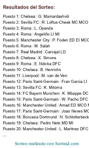 Lista de participantes: Real Madrid E. Haaland DC, Liverpool Rodri MCD MC, Roma M. Salah, Real Madrid J. Bellingham MCO MC, Real Madrid Vini Jr. EI DC, FC Bayern Munchen K. Mbappe DC EI, FC Bayern Munchen H. Kane DC, Manchester City K. De Bruyne MC MCO, Real Madrid T. Courtois POR, Chelsea V. van Dijk DFC, Manchester United R. Lewandowski DC, Liverpool Alisson POR, Real Madrid F. Valverde MC MD, Manchester City C. Palmer MCO MD, Arsenal B. Saka ED MD, Arsenal M. Ødegaard MC, Manchester City P. Foden ED EI MCO, Paris Saint-Germain W. Saliba DFC, FC Bayern Munchen D. Rice, Manchester City Ruben Dias DFC, Manchester City Theo Bernard François Hernandez, Paris Saint-Germain G. Donnarumma POR, Paris Saint-Germain Marquinhos DFC, Arsenal Gabriel DFC, Paris Saint-Germain N. Barella MC MCD, Real Madrid J. Tah DFC, Manchester City Ederson POR, AC Milan M. Maignan POR, FC Bayern Munchen J. Kimmich MCD LD, Chelsea V. Osimhen, Real Madrid Rodrygo ED DC, Manchester City A. Isak, Liverpool A. Mac Allister MC MCD, Liverpool T. Alexander-Arnold LD, Manchester City Bernardo Silva MC ED, Arsenal Bremer DFC, Borussia Dortmund G. Kobel POR, Borussia Dortmund L. Modric MC MCO MCD, Manchester City Heung-Min Son, AC Milan P. Dybala MCO DC, Real Madrid Carvajal LD, Sevilla FC K. Benzema, Paris Saint-Germain O. Dembele ED MCO, AC Milan K. Kvaratskhelia, Paris Saint-Germain Vitinha MC MCD, Real Madrid A. Tchouameni MCD MC DFC, Chelsea M. Caicedo MCD, Real Madrid eder Militao DFC, Roma L. Openda, Paris Saint-Germain A. Hakimi LD, Borussia Dortmund N. Schlotterbeck DFC, Arsenal Bruno Guimaraes, Liverpool Dani Olmo, Liverpool L. Diaz MI EI, Liverpool Rafael Leao EI MI DC, Arsenal David Raya POR, Chelsea G. Mamardashvili, FC Bayern Munchen Palhinha MCD MC, Real Madrid D. Alaba DFC LI, AC Milan Cristiano Ronaldo, Borussia Dortmund N. Kanté, Borussia Dortmund R. Mahrez, FC Bayern Munchen M. Neuer POR, Real Madrid J. Frimpong, FC Bayern Munchen M. Olise MD ED, Manchester City J. Gvardiol LI DFC, FC Bayern Munchen L. Sane MD MI ED, Liverpool I. Konate DFC, AC Milan C. Pulisic ED MD EI, Paris Saint-Germain A. Lookman, Arsenal B. White LD, Paris Saint-Germain M. Thuram DC, Arsenal Mikel Merino MC MCO, Manchester City M. Akanji DFC, Manchester City N. Ake DFC LI, AC Milan S. Guirassy DC, Paris Saint-Germain J. Brandt MCO MD MC, Manchester City J. Stones DFC MCD LD, Real Madrid K. Coman MI MD, Manchester United A. Onana POR, Manchester City İ. Gündoğan MC MCD, Roma M. Hummels DFC, Liverpool F. Acerbi DFC, Sevilla FC Iago Aspas, Chelsea X. Simons, Borussia Dortmund Pedro Gonçalves, Real Madrid E. Camavinga MC MCD LI, Roma C. Nkunku MCO DC, Paris Saint-Germain Nuno Mendes LI, Liverpool C. Gakpo MI EI DC, AC Milan T. Reijnders MC MCD MCO, FC Bayern Munchen A. Davies LI MI, Manchester United M. de Ligt DFC, AC Milan A. Christensen DFC MCD, Arsenal A. Dovbyk DC, FC Bayern Munchen D. Upamecano DFC, Manchester United L. Martinez DFC, Real Madrid R. De Paul MC MCD, Arsenal L. Trossard EI DC, FC Bayern Munchen K. Laimer LD MCD MC, Real Madrid F. Mendy LI, Manchester City M. Kovačic MC MCD, FC Bayern Munchen Kim Min Jae DFC, Manchester United L. Torreira, FC Bayern Munchen F. Chiesa MD MI DC, Chelsea K. Koulibaly, Borussia Dortmund M. Sabitzer MC MCO MCD, Liverpool A. Robertson LI, Borussia Dortmund G. Di Lorenzo LD DFC, Roma G. Mancini DFC, Arsenal T. Partey MCD MC LD, Liverpool M. van de Ven, Arsenal Sancet, Arsenal M. Diaby, Borussia Dortmund Y. En-Nesyri, Manchester City M. Zaccagni, Paris Saint-Germain B. Barcola EI ED, AC Milan Brahim MCO ED EI, Chelsea E. Fernandez MC MCD, Liverpool R. Gravenberch MCD MC, Borussia Dortmund D. Udogie, Arsenal Gabriel Martinelli EI MI, Manchester United D. Nuñez DC, Arsenal P. Hincapie DFC LI, Chelsea R. James LD, Manchester United Diogo Dalot LI LD, Real Madrid A. Correa DC MD, AC Milan F. Tomori DFC, Sevilla FC L. Pellegrini MCO MC, AC Milan J. Grealish EI MI, Manchester City K. Walker LD, Roma S. Gnabry MD MI DC, FC Bayern Munchen L. Goretzka MC MCD, Borussia Dortmund D. Zapata, Sevilla FC Iñigo Martinez DFC, Sevilla FC K. Mitoma, AC Milan A. Robinson, Liverpool B. Mbeumo, Paris Saint-Germain Joao Neves MC MCD, Sevilla FC D. Frattesi MC MCO, Paris Saint-Germain R. Kolo Muani DC, Liverpool D. Szoboszlai MCO MC, Chelsea Joao Felix MCO MI DC, Real Madrid A. Lunin POR, Manchester United A. Saint-Maximin, Sevilla FC R. Loftus-Cheek MC MCO, AC Milan Y. Fofana MCD MC, Manchester United N. Mazraoui LD LI, Manchester United Casemiro MCD MC, Arsenal Gabriel Jesus DC, Borussia Dortmund W. Anton DFC, Borussia Dortmund N. Süle DFC LD, Chelsea B. Henrichs, Manchester City S. Ortega POR, Paris Saint-Germain D. Malen, Roma F. Kessié, Manchester City W. Zaïre-Emery MC MCD, Real Madrid J. Doku EI ED, Chelsea M. Gusto LD, Paris Saint-Germain W. Pacho DFC, Liverpool C. Jones MC MCO MCD, Roma J. Timber LD LI DFC, Borussia Dortmund F. Nmecha MCD MC, AC Milan S. Chukwueze MD ED, Manchester United L. Shaw LI DFC, Sevilla FC Suso MD MCO MC, Manchester United H. Maguire DFC, Arsenal Javi Galan LI MI, Chelsea T. Kleindienst, Sevilla FC J. Gomez DFC LD LI, Roma É. Mendy, Sevilla FC Mario Hermoso DFC, Sevilla FC M. Taremi DC, Borussia Dortmund J. Gittens EI MI, Sevilla FC D. Doue EI MC, Arsenal J. Musso POR, Manchester United Amad ED MCO MD, Chelsea L. Colwill DFC, Chelsea N. Madueke MD, Manchester City Samuel Lino MI EI, Chelsea Pedro Neto MD MI, AC Milan M. Thiaw DFC, Chelsea W. Fofana DFC, Roma E. Ndicka DFC, FC Bayern Munchen S. Boey LD, FC Bayern Munchen H. Ito DFC LI, Borussia Dortmund J. Ryerson LD LI, AC Milan Robert Sanchez POR, AC Milan D. Calabria LD, Borussia Dortmund R. Bensebaini LI DFC, Arsenal R. Sterling MI MD, Roma S. El Shaarawy MI EI MCO, Liverpool M. Perin POR, Sevilla FC F. Muslera, Chelsea Alejandro Garnacho EI MI MD, Liverpool H. Elliott MCO MC ED, Sevilla FC D. Sow MC MCD, Liverpool K. Mainoo MCD MC, Borussia Dortmund M. Beier DC MD ED, Chelsea R. Lavia MCD MC, Paris Saint-Germain Fr