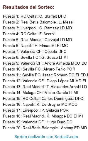 Lista de participantes: Real Madrid M. Salah MD ED, Real Madrid K. Mbappé DC EI MI, Liverpool V. van Dijk DFC, Real Madrid J. Bellingham MCO MC, Liverpool O. Dembele, Liverpool Alisson POR, Liverpool F. Wirtz MCO DC MC, Real Madrid T. Courtois POR, Real Madrid Vini Jr. EI DC MI, Real Madrid F. Valverde MC MCD LD, Arsenal B. Saka ED MD, Arsenal Gabriel DFC, Liverpool A. Isak DC, Arsenal M. Ødegaard MC MCO, Arsenal V. Gyökeres DC, Arsenal W. Saliba DFC, Arsenal D. Rice MCD MC, Arsenal David Raya POR, Liverpool A. Mac Allister MC MCD, Napoli K. De Bruyne MC MCO, Liverpool I. Konaté DFC, Real Madrid A. Rüdiger DFC, Real Madrid T. Alexander-Arnold LD MD, Arsenal P. Dybala, Real Betis Balompie L. Messi, Liverpool R. Gravenberch MCD MC, Napoli S. McTominay MC MCO MI, Real Madrid Carvajal LD MD, Real Madrid Rodrygo ED DC MD, Real Betis Balompie A. Griezmann, Arsenal H. Son, Liverpool P. Gulácsi POR, Liverpool N. Kanté, SL Benfica B. Mbeumo, Liverpool C. Gakpo MI EI, Napoli R. Lukaku DC, Real Betis Balompie Isco MCO MI MC, Real Madrid A. Tchouaméni MCD MC DFC, Real Madrid Éder Militão DFC, Real Betis Balompie T. Hernández, Real Betis Balompie M. Neuer POR, Valencia CF Rafael Leão, Napoli Marcos Llorente, RC Celta F. Acerbi, Liverpool M. Zaccagni, Arsenal P. Hincapié DFC LI MI, Arsenal Zubimendi MCD MC, Sevilla FC E. Eze MCO EI DC, Arsenal Mikel Merino MC DC, Arsenal B. White LD, Arsenal L. Trossard EI DC MI, Liverpool D. Szoboszlai MCO MC, Liverpool J. Frimpong LD MD ED, Liverpool H. Ekitiké DC MCO, Napoli S. Lobotka MC MCD, Napoli G. Di Lorenzo LD DFC MD, Napoli A. Rrahmani DFC, RC Celta Iago Aspas ED DC MD, Real Madrid E. Camavinga MC MCD LI, Valencia CF Ayoze, Napoli R. Araujo, Arsenal J. Timber LD LI DFC MD, Arsenal K. Havertz DC MC MCO, Liverpool M. Kerkez LI MI, Liverpool A. Robertson LI MI, Napoli A. Buongiorno DFC, Napoli A. Zambo Anguissa MC MCO, Napoli A. Meret POR, Real Betis Balompie G. Lo Celso MCO MC MCD, Real Madrid Brahim MD MI MCO ED, Real Madrid D. Alaba DFC LI MI, Real Madrid D. Huijsen DFC, SL Benfica V. Pavlidis DC MCO, SL Benfica D. Lukébakio MD ED DC, SL Benfica N. Otamendi DFC, Sevilla FC Malcom, Sevilla FC K. Koulibaly, SL Benfica Y. Bounou POR, RC Celta Á. Di María, Napoli Miguel Gutiérrez LI MI, Napoli David Neres EI MI, Napoli M. Politano ED MD, Real Betis Balompie Antony ED MD, Real Madrid A. Lunin POR, Real Madrid F. Mendy LI MI, Real Madrid A. Güler MD MCO ED, Valencia CF Gayà LI MI, Malaga CF Sergi Darder, Arsenal N. Madueke ED MD, Arsenal Gabriel Jesus DC MCO, Liverpool C. Jones MCO MC MCD, Napoli N. Lang EI MI, RC Celta Mingueza LD MD MI, RC Celta Borja Iglesias DC, Real Betis Balompie Fornals MCD MCO MD MC, Real Betis Balompie Diego Llorente DFC, Real Madrid Álvaro Carreras LI MI, SL Benfica G. Sudakov MCO MC MCD, SL Benfica A. Trubin POR, SL Benfica F. Aursnes MC LD MD MCO, Arsenal Kepa POR, Liverpool J. Gomez DFC LD LI MD, Napoli V. Milinković-Savić POR, RC Celta Marcos Alonso DFC LI, Real Betis Balompie Álvaro Valles POR, Real Betis Balompie Pau López POR, Real Betis Balompie Bartra DFC, Real Madrid Fran García LI MI, SL Benfica R. Ríos MC MCD, Valencia CF S. Dimitrievski POR, Arsenal M. Lewis-Skelly LI MC, Arsenal R. Calafiori LI DFC, Liverpool C. Bradley LD MD, Napoli S. Beukema DFC, Napoli L. Spinazzola LI MI, RC Celta I. Moriba MC, RC Celta Fran Beltrán MC MCD, RC Celta C. Starfelt DFC, Real Betis Balompie S. Amrabat MCD MC DFC, Real Betis Balompie Abde MI EI, Real Betis Balompie Natan DFC, Real Betis Balompie Cucho Hernández DC MCO, Real Betis Balompie Marc Roca MCD MC, Sevilla FC Azpilicueta DFC LD, Sevilla FC C. Ejuke MI MD EI, SL Benfica António Silva DFC, SL Benfica Tomás Araújo DFC LD MD, SL Benfica A. Bah LD MD, SL Benfica Bruma EI MI MCO, Valencia CF Diego López MI MD EI, Valencia CF Hugo Duro DC, Valencia CF Luis Rioja MD MI ED, Arsenal Mosquera DFC, Napoli E. Elmas MI EI MC, RC Celta Bryan Zaragoza MI EI MD, Real Betis Balompie Altimira MCD MC, Real Betis Balompie Aitor Ruibal MD LD DC ED, Sevilla FC Endrick DC, Real Madrid F. Mastantuono MCO MD ED DC, Sevilla FC N. Gudelj DFC MCD, SL Benfica E. Barrenechea MC MCD, SL Benfica L. Barreiro MC MCD MCO, Valencia CF Javi Guerra MC MCD, Valencia CF Pepelu MC MCD, Napoli R. Højlund DC, RC Celta Hugo Álvarez MI MD EI, Real Betis Balompie C. Bakambu DC, Real Betis Balompie V. Gómez DFC LI, Real Betis Balompie Riquelme MI MD LI EI, Real Betis Balompie Héctor Bellerín LD MD, Sevilla FC B. Mendy MCD MC DFC, RC Celta A. Sanchez DC ED MCO, Sevilla FC Carmona LD MD ED, Sevilla FC Ø. Nyland POR, Sevilla FC Alfon MI EI MCO, Sevilla FC R. Vargas MI MCO EI, Sevilla FC D. Sow MC MCD, Valencia CF Agirrezabala POR, Valencia CF Thierry Correia LD LI MD, Valencia CF M. Diakhaby DFC, Valencia CF Dani Raba MD DC ED, Valencia CF B. Santamaria MCD MC, RC Celta J. Aidoo DFC, RC Celta Carreira MD LD MI, RC Celta Ferran Jutglà DC, Sevilla FC Fábio Cardoso DFC, Sevilla FC L. Agoumé MCD MC DFC, Sevilla FC Juanlu Sánchez LD MCO MD, Sevilla FC Kike Salas DFC LI, SL Benfica A. Schjelderup EI MCO MI, SL Benfica F. Ivanović DC MCO, Valencia CF César Tárrega DFC, Valencia CF Copete DFC, Valencia CF André Almeida MCO DC MC, Valencia CF F. Ugrinić MC MCO MCD, Valencia CF A. Danjuma MI DC EI, Malaga CF Alfonso Herrero POR, Napoli B. Gilmour MC MCD, RC Celta I. Radu POR, RC Celta W. Swedberg EI MC MI, RC Celta Hugo Sotelo MC MCD, RC Celta Pablo Durán DC MI MCO, RC Celta Carlos Domínguez DFC, Sevilla FC O. Vlachodimos POR, Sevilla FC Álvaro Ferllo POR, Sevilla FC G. Suazo LI MI, Sevilla FC A. Januzaj ED MD MI, Sevilla FC Isaac Romero DC EI ED MI, SL Benfica A. Dedić LD LI MD, Valencia CF L. Ramazani MI MD DC EI, Valencia CF D. Foulquier LD LI MD, Malaga CF Roberto Fernández, RC Celta Iván Villar POR, RC Celta M. Ristić LI MI, Sevilla FC A. Adams DC, SL Benfica S. Dahl LI MI, Malaga CF Ontiveros, Napoli P. Mazzocchi LD MD, SL Benfica Manu Silva MCD DFC, Liverpool F. Woodman POR, SL Ben
