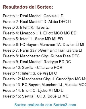 Lista de participantes: Manchester City E. Haaland DC, Manchester City Rodri MCD MC, Real Madrid J. Bellingham MCO MC, Real Madrid Vini Jr. EI DC, Real Madrid K. Mbappe DC EI, FC Bayern Munchen H. Kane DC, Manchester City K. De Bruyne MC MCO, Inter L. Martinez DC, Real Madrid T. Courtois POR, Liverpool V. van Dijk DFC, Fc Barcelona M. ter Stegen POR, Liverpool Alisson POR, Real Madrid F. Valverde MC MD, Atletico Madrid A. Griezmann DC MI, Real Madrid A. Rüdiger DFC, Atletico Madrid J. Oblak POR, FC Bayern Munchen J. Musiala MCO MI MC, Manchester City P. Foden ED EI MCO, FC Bayern Munchen D. Rice, Manchester City Ruben Dias DFC, Inter A. Bastoni DFC, Manchester City Theo Bernard François Hernandez, Paris Saint-Germain G. Donnarumma POR, Paris Saint-Germain Marquinhos DFC, Inter N. Barella MC MCD, Manchester City Ederson POR, FC Bayern Munchen J. Kimmich MCD LD, Inter Y. Sommer POR, Real Madrid Rodrygo ED DC, Fc Barcelona Pedri MC EI, Fc Barcelona J. Kounde LD DFC, Fc Barcelona F. de Jong MC MCD, Liverpool A. Mac Allister MC MCD, Liverpool T. Alexander-Arnold LD, Manchester City Bernardo Silva MC ED, Juventus Bremer DFC, Paris Saint-Germain Heung-Min Son, Real Madrid Carvajal LD, Inter H. Çalhanoğlu MCD MC, Atletico Madrid L. Modric MC MCO MCD, Paris Saint-Germain O. Dembele ED MCO, Fc Barcelona Dani Olmo, Atletico Madrid Nico Williams, Fc Barcelona Raphinha ED EI MD, Paris Saint-Germain Vitinha MC MCD, Fc Barcelona R. Araujo DFC LD, Real Madrid A. Tchouameni MCD MC DFC, Real Madrid eder Militao DFC, Paris Saint-Germain A. Hakimi LD, Liverpool Diogo Jota DC EI, Liverpool L. Diaz MI EI, FC Bayern Munchen Palhinha MCD MC, Real Madrid D. Alaba DFC LI, Real Madrid Cristiano Ronaldo, Paris Saint-Germain N. Kanté, Fc Barcelona W. Szczesny POR, FC Bayern Munchen M. Neuer POR, Atletico Madrid J. Alvarez DC MCO, Real Madrid J. Frimpong, FC Bayern Munchen M. Olise MD ED, Manchester City J. Gvardiol LI DFC, Liverpool I. Konate DFC, Paris Saint-Germain A. Lookman, Inter M. Thuram DC, Juventus J. Maddison, Inter F. Dimarco LI MI, Manchester City M. Akanji DFC, Manchester City N. Ake DFC LI, FC Bayern Munchen K. Coman MI MD, Inter L. Sane MD MI ED, Manchester City J. Stones DFC MCD LD, Inter B. Pavard DFC LD, Manchester City İ. Gündoğan MC MCD, Liverpool F. Acerbi DFC, Fc Barcelona Lamine Yamal ED EI, Real Madrid E. Camavinga MC MCD LI, Juventus Gavi MC EI, Paris Saint-Germain Nuno Mendes LI, Liverpool C. Gakpo MI EI DC, Inter K. Havertz, Fc Barcelona B. Kamara MCD MC, FC Bayern Munchen A. Davies LI MI, Atletico Madrid R. Le Normand DFC, Atletico Madrid O. Marmoush, Juventus Douglas Luiz MC MCD, Juventus M. Locatelli MCD MC, Juventus T. Koopmeiners MC MCO, Atletico Madrid C. Nkunku MCO DC, Atletico Madrid Marcos Llorente MD LD MC, FC Bayern Munchen D. Upamecano DFC, Manchester City F. Chiesa MD MI DC, Atletico Madrid J. Gimenez DFC, Real Madrid R. De Paul MC MCD, FC Bayern Munchen K. Laimer LD MCD MC, Real Madrid F. Mendy LI, Manchester City M. Kovačic MC MCD, FC Bayern Munchen Kim Min Jae DFC, Liverpool A. Robertson LI, Atletico Madrid Koke MCD MC, Inter S. de Vrij DFC, FC Bayern Munchen K. Koulibaly, Inter H. Mkhitaryan MC MCO, Fc Barcelona Savinho EI ED, Paris Saint-Germain B. Barcola EI ED, Fc Barcelona Balde LI LD MI, Fc Barcelona J. David, Liverpool R. Gravenberch MCD MC, Atletico Madrid N. Molina LD, Atletico Madrid A. Sørloth DC, Liverpool Iñaki Williams, Real Madrid J. Grealish EI MI, Manchester City K. Walker LD, Real Madrid S. Gnabry MD MI DC, Juventus D. Hancko, FC Bayern Munchen L. Goretzka MC MCD, Inter D. Dumfries LD MD, Sevilla FC Iñigo Martinez DFC, Atletico Madrid T. Müller MCO DC MD, Paris Saint-Germain Joao Neves MC MCD, Fc Barcelona F. Kadıoğlu, Paris Saint-Germain R. Kolo Muani DC, Liverpool D. Szoboszlai MCO MC, Real Madrid A. Lunin POR, Sevilla FC D. Frattesi MC MCO, Juventus A. Milik DC, Juventus B. Henrichs, Inter P. Zieliński MC MCD, Manchester City S. Ortega POR, Inter M. Darmian LD DFC MD, Paris Saint-Germain W. Zaïre-Emery MC MCD, Manchester City J. Doku EI ED, Paris Saint-Germain W. Pacho DFC, Liverpool C. Jones MC MCO MCD, Sevilla FC M. Rashford, Sevilla FC Suso MD MCO MC, Sevilla FC J. Gomez DFC LD LI, Juventus N. Gonzalez ED MD EI, Juventus M. Di Gregorio POR, Juventus Marco Asensio ED DC MC, Atletico Madrid Reinildo LI DFC, Sevilla FC M. Taremi DC, Sevilla FC N. Gudelj DFC MCD, Liverpool W. Endo MCD MC, Atletico Madrid A. Witsel DFC, Atletico Madrid Samuel Lino MI EI, FC Bayern Munchen S. Boey LD, FC Bayern Munchen H. Ito DFC LI, Liverpool C. Kelleher POR, Paris Saint-Germain P. Kimpembe DFC, Inter M. Lazzari, Atletico Madrid J. Musso POR, Juventus M. Perin POR, Inter M. Arnautovic DC, Liverpool H. Elliott MCO MC ED, Liverpool K. Mainoo MCD MC, Sevilla FC A. Adli DC MI MCO, Atletico Madrid Riquelme MI, Paris Saint-Germain Fran Garcia LI, Fc Barcelona Eric Garcia DFC MCD LD, FC Bayern Munchen Francisco Conceiçao MD ED, Juventus P. Kalulu DFC LD, Juventus A. Cambiaso LD LI MD, Manchester City Matheus Nunes MC MI, Inter C. Ejuke MI MD EI, Juventus F. Gatti DFC, Juventus W. McKennie MC MCD, Liverpool T. Tomiyasu LD LI, Sevilla FC T. Werner, Fc Barcelona Ansu Fati MCO MI DC, Sevilla FC D. Doue EI MC, Paris Saint-Germain Lucas Beraldo DFC LI, FC Bayern Munchen M. Tel DC MI MD, Paris Saint-Germain M. Safonov POR, Inter Y. Bisseck DFC, Juventus Arthur MCD MC, Fc Barcelona Fermin MC EI MCO, Liverpool C. Bradley LD, Fc Barcelona A. Hložek, FC Bayern Munchen A. Pavlovic MCD MC, Sevilla FC Adria Pedrosa LI, Sevilla FC G. Montiel LD, Sevilla FC Ø. Nyland POR, Sevilla FC A. Sambi Lokonga MC MCD, Inter Josep Martinez POR, Fc Barcelona Pau Cubarsi DFC, Atletico Madrid G. Simeone DC MD MI, Sevilla FC Carmona LD MD, Manchester City R. Vargas, Sevilla FC alvaro POR, FC Bayern Munchen S. Ulreich POR, Juventus K. Yildiz EI MI DC, Sevilla FC V. Barco LI MI, Real Madrid Vallejo DFC, Fc Barcelona Marc Casado.