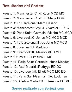 Lista de participantes: Manchester City E. Haaland DC, Manchester City Rodri MCD MC, Real Madrid J. Bellingham MCO MC, Real Madrid Vini Jr. EI DC, Real Madrid K. Mbappe DC EI, FC Bayern Munchen H. Kane DC, Manchester City K. De Bruyne MC MCO, Inter L. Martinez DC, Real Madrid T. Courtois POR, Liverpool V. van Dijk DFC, Fc Barcelona M. ter Stegen POR, Liverpool Alisson POR, Real Madrid F. Valverde MC MD, Atletico Madrid A. Griezmann DC MI, Real Madrid A. Rüdiger DFC, Atletico Madrid J. Oblak POR, Paris Saint-Germain L. Messi, FC Bayern Munchen J. Musiala MCO MI MC, Manchester City P. Foden ED EI MCO, FC Bayern Munchen D. Rice, Manchester City Ruben Dias DFC, Inter A. Bastoni DFC, Manchester City Theo Bernard François Hernandez, Paris Saint-Germain G. Donnarumma POR, Paris Saint-Germain Marquinhos DFC, Inter N. Barella MC MCD, Manchester City Ederson POR, FC Bayern Munchen J. Kimmich MCD LD, Inter Y. Sommer POR, Real Madrid Rodrygo ED DC, Fc Barcelona Pedri MC EI, Fc Barcelona J. Kounde LD DFC, Fc Barcelona F. de Jong MC MCD, Liverpool A. Mac Allister MC MCD, Liverpool T. Alexander-Arnold LD, Manchester City Bernardo Silva MC ED, Juventus Bremer DFC, Paris Saint-Germain Heung-Min Son, Real Madrid Carvajal LD, Inter H. Çalhanoğlu MCD MC, Atletico Madrid L. Modric MC MCO MCD, Paris Saint-Germain O. Dembele ED MCO, Fc Barcelona Dani Olmo, Atletico Madrid Nico Williams, Fc Barcelona Raphinha ED EI MD, Paris Saint-Germain Vitinha MC MCD, Fc Barcelona R. Araujo DFC LD, Real Madrid A. Tchouameni MCD MC DFC, Real Madrid eder Militao DFC, Paris Saint-Germain A. Hakimi LD, Liverpool Diogo Jota DC EI, Liverpool L. Diaz MI EI, FC Bayern Munchen Palhinha MCD MC, Real Madrid D. Alaba DFC LI, Real Madrid Cristiano Ronaldo, Paris Saint-Germain N. Kanté, Fc Barcelona W. Szczesny POR, FC Bayern Munchen M. Neuer POR, Atletico Madrid J. Alvarez DC MCO, Real Madrid J. Frimpong, FC Bayern Munchen M. Olise MD ED, Manchester City J. Gvardiol LI DFC, Juventus D. Vlahovic DC, Liverpool I. Konate DFC, Paris Saint-Germain A. Lookman, Inter M. Thuram DC, Juventus J. Maddison, Inter F. Dimarco LI MI, Manchester City M. Akanji DFC, Manchester City N. Ake DFC LI, FC Bayern Munchen K. Coman MI MD, Inter L. Sane MD MI ED, Manchester City J. Stones DFC MCD LD, Inter B. Pavard DFC LD, Manchester City İ. Gündoğan MC MCD, Liverpool F. Acerbi DFC, Fc Barcelona Lamine Yamal ED EI, Real Madrid E. Camavinga MC MCD LI, Juventus Gavi MC EI, Paris Saint-Germain Nuno Mendes LI, Liverpool C. Gakpo MI EI DC, Inter K. Havertz, Fc Barcelona B. Kamara MCD MC, FC Bayern Munchen A. Davies LI MI, Atletico Madrid R. Le Normand DFC, Atletico Madrid O. Marmoush, Juventus Douglas Luiz MC MCD, Juventus M. Locatelli MCD MC, Juventus T. Koopmeiners MC MCO, Atletico Madrid C. Nkunku MCO DC, Atletico Madrid Marcos Llorente MD LD MC, FC Bayern Munchen D. Upamecano DFC, Manchester City F. Chiesa MD MI DC, Atletico Madrid J. Gimenez DFC, Real Madrid R. De Paul MC MCD, FC Bayern Munchen K. Laimer LD MCD MC, Real Madrid F. Mendy LI, Manchester City M. Kovačic MC MCD, FC Bayern Munchen Kim Min Jae DFC, Liverpool A. Robertson LI, Atletico Madrid Koke MCD MC, Inter S. de Vrij DFC, FC Bayern Munchen K. Koulibaly, Inter H. Mkhitaryan MC MCO, Fc Barcelona Savinho EI ED, Paris Saint-Germain B. Barcola EI ED, Fc Barcelona Balde LI LD MI, Fc Barcelona J. David, Liverpool R. Gravenberch MCD MC, Atletico Madrid N. Molina LD, Atletico Madrid A. Sørloth DC, Liverpool Iñaki Williams, Real Madrid J. Grealish EI MI, Manchester City K. Walker LD, Real Madrid S. Gnabry MD MI DC, Juventus D. Hancko, FC Bayern Munchen L. Goretzka MC MCD, Inter D. Dumfries LD MD, Sevilla FC Iñigo Martinez DFC, Atletico Madrid T. Müller MCO DC MD, Paris Saint-Germain Joao Neves MC MCD, Fc Barcelona F. Kadıoğlu, Paris Saint-Germain R. Kolo Muani DC, Liverpool D. Szoboszlai MCO MC, Real Madrid A. Lunin POR, Sevilla FC D. Frattesi MC MCO, Juventus A. Milik DC, Juventus B. Henrichs, Inter P. Zieliński MC MCD, Manchester City S. Ortega POR, Inter M. Darmian LD DFC MD, Paris Saint-Germain W. Zaïre-Emery MC MCD, Manchester City J. Doku EI ED, Paris Saint-Germain W. Pacho DFC, Liverpool C. Jones MC MCO MCD, Sevilla FC M. Rashford, Sevilla FC Suso MD MCO MC, Sevilla FC J. Gomez DFC LD LI, Juventus N. Gonzalez ED MD EI, Juventus M. Di Gregorio POR, Juventus Marco Asensio ED DC MC, Atletico Madrid Reinildo LI DFC, Sevilla FC Mario Hermoso DFC, Sevilla FC M. Taremi DC, Sevilla FC N. Gudelj DFC MCD, Liverpool W. Endo MCD MC, Atletico Madrid A. Witsel DFC, Atletico Madrid Samuel Lino MI EI, Sevilla FC D. Lukebakio ED MD DC, FC Bayern Munchen S. Boey LD, FC Bayern Munchen H. Ito DFC LI, Liverpool C. Kelleher POR, Paris Saint-Germain P. Kimpembe DFC, Inter M. Lazzari, Atletico Madrid J. Musso POR, Juventus M. Perin POR, Inter M. Arnautovic DC, Liverpool H. Elliott MCO MC ED, Liverpool K. Mainoo MCD MC, Sevilla FC A. Adli DC MI MCO, Atletico Madrid Riquelme MI, Paris Saint-Germain Fran Garcia LI, Fc Barcelona Eric Garcia DFC MCD LD, FC Bayern Munchen Francisco Conceiçao MD ED, Juventus P. Kalulu DFC LD, Juventus A. Cambiaso LD LI MD, Sevilla FC D. Sow MC MCD, Manchester City Matheus Nunes MC MI, Inter C. Ejuke MI MD EI, Juventus F. Gatti DFC, Juventus W. McKennie MC MCD, Liverpool T. Tomiyasu LD LI, Sevilla FC T. Werner, Fc Barcelona Ansu Fati MCO MI DC, Sevilla FC D. Doue EI MC, Paris Saint-Germain Lucas Beraldo DFC LI, FC Bayern Munchen M. Tel DC MI MD, Paris Saint-Germain M. Safonov POR, Inter Y. Bisseck DFC, Juventus Arthur MCD MC, Fc Barcelona Fermin MC EI MCO, Liverpool C. Bradley LD, Fc Barcelona A. Hložek, FC Bayern Munchen A. Pavlovic MCD MC, Sevilla FC Adria Pedrosa LI, Sevilla FC G. Montiel LD, Sevilla FC Ø. Nyland POR, Sevilla FC A. Sambi Lokonga MC MCD, Inter Josep Martinez POR, Fc Barcelona Pau Cubarsi DFC, Atletico Madrid G. Simeone DC MD MI, Sevilla FC Carmona LD MD, Manchester City R. Vargas, Sevilla FC alvaro POR, FC Bayern Munchen S. Ulreich POR, Juventus K. Yildiz EI MI D