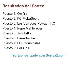 Lista de participantes: Blue Crystal Meth, FC MeLaSopla, FC. Industriales, FoFiTos, Los Grijanders, Los Verracos Powaah F.C, Nottingham Prisa, On fire, Penerbache, Pepe Mel forever, Shaolin Soccer, TiKi TaKa, .