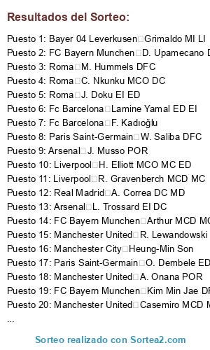 Lista de participantes: Real Madrid E. Haaland DC, Liverpool Rodri MCD MC, Roma M. Salah, Real Madrid J. Bellingham MCO MC, Real Madrid Vini Jr. EI DC, FC Bayern Munchen K. Mbappe DC EI, FC Bayern Munchen H. Kane DC, Manchester United K. De Bruyne MC MCO, Bayer 04 Leverkusen F. Wirtz MCO, Real Madrid T. Courtois POR, Manchester United R. Lewandowski DC, Fc Barcelona M. ter Stegen POR, Liverpool Alisson POR, Real Madrid F. Valverde MC MD, Manchester City C. Palmer MCO MD, Bayer 04 Leverkusen A. Rüdiger DFC, Arsenal B. Saka ED MD, Paris Saint-Germain A. Griezmann DC MI, Manchester City M.Odegaard MC, Manchester City P. Foden ED EI MCO, Paris Saint-Germain W. Saliba DFC, FC Bayern Munchen D. Rice, Manchester City Ruben Dias DFC, Borussia Dortmund A. Bastoni DFC, Manchester City Theo Bernard François Hernandez, Paris Saint-Germain G. Donnarumma POR, Paris Saint-Germain Marquinhos DFC, Arsenal Gabriel DFC, Paris Saint-Germain N. Barella MC MCD, Fc Barcelona J. Musiala MCO MI MC, Real Madrid J. Tah DFC, Manchester City Ederson POR, AC Milan M. Maignan POR, FC Bayern Munchen J. Kimmich MCD LD, Real Madrid Rodrygo ED DC, Fc Barcelona Pedri MC EI, Manchester City A. Isak, Fc Barcelona J. Kounde LD DFC, Fc Barcelona F. de Jong MC MCD, Liverpool A. Mac Allister MC MCD, Liverpool T. Alexander-Arnold LD, Manchester City Bernardo Silva MC ED, Arsenal Bremer DFC, Borussia Dortmund G. Kobel POR, Borussia Dortmund L. Modric MC MCO MCD, Borussia Dortmund Bruno Fernandes MCO EI MC, Manchester City Heung-Min Son, Bayer 04 Leverkusen Grimaldo MI LI, AC Milan P. Dybala MCO DC, Real Madrid Carvajal LD, Paris Saint-Germain O. Dembele ED MCO, Fc Barcelona Raphinha ED EI MD, AC Milan K. Kvaratskhelia, AC Milan Vitinha MC MCD, Fc Barcelona R. Araujo DFC LD, Real Madrid A. Tchouameni MCD MC DFC, Real Madrid eder Militao DFC, Roma L. Openda, Paris Saint-Germain A. Hakimi LD, Borussia Dortmund N. Schlotterbeck DFC, Arsenal Bruno Guimaraes, Liverpool L. Diaz MI EI, Liverpool Rafael Leao EI MI DC, Arsenal Joao Cancelo, Arsenal David Raya POR, FC Bayern Munchen Palhinha MCD MC, Real Madrid D. Alaba DFC LI, AC Milan Cristiano Ronaldo, Borussia Dortmund N. Kanté, Borussia Dortmund R. Mahrez, FC Bayern Munchen M. Neuer POR, Bayer 04 Leverkusen S. Tonali, FC BARCELONA J. Alvarez DC MCO, Real Madrid J. Frimpong, FC Bayern Munchen M. Olise MD ED, Manchester City J. Gvardiol LI DFC, FC Bayern Munchen L. Sane MD MI ED, Bayer 04 Leverkusen E. Palacios MC MCD, Liverpool I. Konate DFC, AC Milan C. Pulisic ED MD EI, Paris Saint-Germain A. Lookman, Arsenal B. White LD, Paris Saint-Germain M. Thuram DC, Arsenal Mikel Merino MC MCO, Manchester City M. Akanji DFC, Manchester City N. Ake DFC LI, AC Milan S. Guirassy DC, Paris Saint-Germain J. Brandt MCO MD MC, Manchester City J. Stones DFC MCD LD, Real Madrid K. Coman MI MD, Manchester United A. Onana POR, Manchester City İ. Gündoğan MC MCD, Roma M. Hummels DFC, Liverpool F. Acerbi DFC, FC BARCELONA D. Kulusevski, Borussia Dortmund Pedro Gonçalves, Fc Barcelona Lamine Yamal ED EI, Real Madrid E. Camavinga MC MCD LI, Roma C. Nkunku MCO DC, Paris Saint-Germain Nuno Mendes LI, Liverpool C. Gakpo MI EI DC, Bayer 04 Leverkusen Pedro Porro, Arsenal T. Reijnders MC MCD MCO, Fc Barcelona B. Kamara MCD MC, FC Bayern Munchen A. Davies LI MI, Bayer 04 Leverkusen O. Marmoush, Manchester United M. de Ligt DFC, FC BARCELONA Marc Cucurella LI, AC Milan A. Christensen DFC MCD, Arsenal A. Dovbyk DC, Bayer 04 Leverkusen T. Koopmeiners MC MCO, FC Bayern Munchen D. Upamecano DFC, Manchester United L. Martinez DFC, Real Madrid R. De Paul MC MCD, Bayer 04 Leverkusen Aleix Garcia MC MCD, Arsenal L. Trossard EI DC, FC Bayern Munchen K. Laimer LD MCD MC, Real Madrid F. Mendy LI, Manchester City M. Kovačic MC MCD, FC Bayern Munchen Kim Min Jae DFC, Manchester United L. Torreira, FC Bayern Munchen F. Chiesa MD MI DC, Bayer 04 Leverkusen M. Sabitzer MC MCO MCD, Liverpool A. Robertson LI, Borussia Dortmund G. Di Lorenzo LD DFC, Roma G. Mancini DFC, Bayer 04 Leverkusen R. Andrich MCD MC DFC, Borussia Dortmund T. Partey MCD MC LD, Bayer 04 Leverkusen L. Hradecký POR, Bayer 04 Leverkusen A. Gordon, Liverpool M. van de Ven, Arsenal Sancet, Arsenal M. Diaby, Borussia Dortmund Y. En-Nesyri, Manchester City M. Zaccagni, Fc Barcelona Savinho EI ED, Paris Saint-Germain B. Barcola EI ED, Fc Barcelona Balde LI LD MI, AC Milan Brahim MCO ED EI, Fc Barcelona J. David, Liverpool R. Gravenberch MCD MC, Arsenal Gabriel Martinelli EI MI, Manchester United D. Nuñez DC, Arsenal P. Hincapie DFC LI, Manchester United Diogo Dalot LI LD, Real Madrid A. Correa DC MD, AC Milan F. Tomori DFC, Bayer 04 Leverkusen E. Tapsoba DFC, AC Milan J. Grealish EI MI, Manchester City K. Walker LD, Roma S. Gnabry MD MI DC, FC Bayern Munchen L. Goretzka MC MCD, Borussia Dortmund D. Zapata, AC Milan A. Robinson, Liverpool B. Mbeumo, Paris Saint-Germain Joao Neves MC MCD, Fc Barcelona F. Kadıoğlu, Paris Saint-Germain R. Kolo Muani DC, Liverpool D. Szoboszlai MCO MC, Real Madrid A. Lunin POR, Manchester United A. Saint-Maximin, AC Milan Y. Fofana MCD MC, Manchester United N. Mazraoui LD LI, Manchester United Casemiro MCD MC, Arsenal Gabriel Jesus DC, Borussia Dortmund N. Süle DFC LD, FC BARCELONA Jorginho MCD MC, Manchester City S. Ortega POR, Paris Saint-Germain D. Malen, Roma F. Kessié, Manchester City W. Zaïre-Emery MC MCD, Roma J. Doku EI ED, Paris Saint-Germain W. Pacho DFC, Liverpool C. Jones MC MCO MCD, Roma J. Timber LD LI DFC, Borussia Dortmund F. Nmecha MCD MC, AC Milan S. Chukwueze MD ED, Manchester United L. Shaw LI DFC, Arsenal Javi Galan LI MI, Bayer 04 Leverkusen J. Hofmann MCO DC, Roma É. Mendy, Borussia Dortmund J. Gittens EI MI, Arsenal J. Musso POR, Manchester United Amad ED MCO MD, Manchester City Samuel Lino MI EI, AC Milan M. Thiaw DFC, Bayer 04 Leverkusen D. Lukebakio ED MD DC, Roma E. Ndicka DFC, FC Bayern Munchen S. Boey LD, FC Bayern Munchen H. Ito DFC LI, Borussia Dortmund J. Ryerson LD LI, AC Milan Robert Sanchez P
