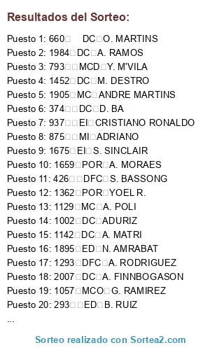 Lista de participantes: 345 EI A. YOUNG, 1500 POR M. PERIN, 747 MCD C. KABORE, 1499 LD L. YOUNG, 1005 POR DIEGO LOPEZ, 1980 DFC T. ALDERWEIRELD, 1936 POR DIDA, 1935 EI BRUMA, 1937 POR ROBERTO, 1504 MC F. DELPH, 181 DFC FELIPE MELO, 452 DFC R. DUNNE, 27 DFC O. TOPRAK, 46 MCD LUIZ GUSTAVO, 261 ED S. KALOU, 1113 DFC W. SAMUEL, 21 DC C. OBASI, 321 MCO DAVID SILVA, 1184 EI E. LAVEZZI, 1701 POR RAFAEL, 116 MCO JURADO, 875 MI ADRIANO, 796 ED J. PITROIPA, 333 LD N. ONUOHA, 1812 MI J. DRAXLER, 268 DFC P. JAGIELKA, 325 DFC K. TOURE, 211 POR K. VERMEER, 1542 LD L. DE SILVESTRI, 844 DC FALCAO, 1243 POR S. ROMERO, 624 MI Y. ZHIRKOV, 61 DFC N. SUBOTIC, 1118 MCO W. SNEIJDER, 1238 DC A. DI NATALE, 865 MCO CESC FABREGAS, 414 MCO L. MODRIC, 1149 DFC L. BONUCCI, 471 MC A. RAMSEY, 349 MC D. FLETCHER, 1215 MCD D. DE ROSSI, 294 DC M. DEMBELE, 327 MC J. MILNER, 1126 DC D. MILITO, 1257 EI VARELA, 54 MCD A. TYMOSHCHUK, 827 DFC MIKEL SAN JOSE, 1979 DFC M. CIANI, 742 MI A. AYEW, 1522 MD DE MARCOS, 949 MCD L. DIARRA, 317 DFC J. LESCOTT, 929 POR CASILLAS, 884 EI DIEGO CASTRO, 745 LD R. FANNI, 931 DFC PEPE, 843 ED REYES, 323 DC S. AGÜERO, 967 DFC M. CACERES, 1314 ED C. DELGADO, 1020 DFC G. RODRIGUEZ, 402 MI K. RICHARDSON, 172 MI V. STOCKER, 216 MCO C. ERIKSEN, 29 LI M. KADLEC, 1471 MCO S. FEGHOULI, 370 LI D. SANTON, 404 DC N. BENDTNER, 1919 DFC MANOEL MESSIAS, 1987 EI F. THAUVIN, 225 DFC DOUGLAS, 28 DFC S. REINARTZ, 1292 LI H. BEDIMO, 456 DC G. AGBONLAHOR, 1610 MC N. MATIC, 51 DC M. GOMEZ, 311 LI FABIO AURELIO, 41 POR M. NEUER, 1285 DC J. SAVIOLA, 677 DFC N. LOMBAERTS, 53 DFC D. VAN BUYTEN, 799 MCD E. CAPOUE, 746 DC A. GIGNAC, 1114 LD MAICON, 410 DFC M. DAWSON, 1358 LI C. RODRIGUEZ, 886 MCO CARLOS MARTINS, 285 LI J. RIISE, 640 POR I. AKINFEEV, 1167 DC M. KLOSE, 45 LD P. LAHM, 1299 EI DIEGO CAPEL, 972 MCD G. MEDEL, 1354 DFC G. PALETTA, 407 POR B. FRIEDEL, 1362 POR YOEL R., 1165 MCO HERNANES, 1364 MCO Z. JUNUZOVIC, 6 LD S. RIETHER, 1162 MC C. LEDESMA, 679 MCD I. DENISOV, 915 LTD SRNA, 1943 POR B.COSTIL, 1944 LI L. MELGAREJO, 1945 MC E. PEREZ, 1946 MI KOSECKI, 1947 MD NSUE, 1948 DC RUSSELL, 1949 MD M. SALAH, 1950 DC D. PABON, 1951 DC A. KOKORIN, 1952 LTD SILVIO, 1953 ED Y. MOLLO, 1954 MCO TAISON, 1955 EI T. ELYOUNOUSSI, 1956 MCO L. PAREDES, 1957 MD D. EBERT, 1958 MCO R. BARKLEY, 1959 DC D. MORENO, 1960 LI A. MORENO, 1961 DC THIEVY, 1962 DC P. DIAWARA, 1963 LD ROSE, 1964 DC CARLOS LUQUE, 1965 MCD J. MALANDA, 1966 ED Z. BAKKALI, 1967 MCO A. TEIXEIRA, 1968 MCD J. GUILAVOGUI, 1969 MCO DOUGLAS COSTA, 1970 MCO QUINTERO, 1971 DC ICARDI, 1972 DFC T. HUBOCAN, 1973 DC LIMA, 1974 MC RAFINHA, 1975 MI A. CENTURION, 566 DFC ADILSON, 656 MC C. NOBOA, 1283 DC O. CARDOZO, 503 DFC G. CAHILL, 1034 DC A. CASSANO, 1628 LI C. M'BENGUE, 1141 MI E. ELIA, 227 DC L. DE JONG, 584 MCO OSCAR, 808 POR U. RAME, 35 DC S. KIEBLING, 266 POR T. HOWARD, 1006 DFC C. ZAPATA, 316 DFC V. KOMPANY, 1062 MC R. NAINGGOLAN, 9 MCD O. AHMEDOV, 1560 DC A. KONE, 1366 DFC L. RINAUDO, 896 ED JOAQUIN, 786 MI B. SAKO, 1341 MCO A. LJAJIC, 990 ED PABLO HERNANDEZ, 722 MCD R. MAVUBA, 324 DC C. TEVEZ, 734 LD AZPILICUETA, 1 POR K. TRAPP, 777 DC K. GAMEIRO, 408 LD K. WALKER, 1161 LI S. RADU, 1230 POR S. HANDANOVIC, 631 MC P. MAMAEV, 1176 DFC H. CAMPAGNARO, 1002 DC ADURIZ, 1374 MD D. SALPINGIDIS, 161 DC C. PIZARRO, 1284 POR EDUARDO, 1372 LI GARRIDO, 165 LI M. SILVESTRE, 1177 DFC P. CANNAVARO, 382 DFC R. SHAWCROSS, 210 MCO VIEIRINHA, 319 MC Y. TOURE, 925 EI G. CASTRO, 1048 DFC D. BONERA, 417 DC E. ADEBAYOR, 470 MCD A. SONG, 735 DFC S. DIAWARA, 374 DC D. BA, 248 LI A. COLE, 632 MCO A. DZAGOEV, 862 LI E. ABIDAL, 111 MCO L. HOLTBY, 193 LD V. TOROSIDIS, 938 MCO M. OZIL, 760 DC J. BRIAND, 1133 POR G. BUFFON, 64 MCD S. BENDER, 689 MD V. BYSTROV, 346 DC W. ROONEY, 68 MI K. GROBKREUTZ, 1119 DC G. PAZZINI, 509 MCO M. DAVIES, 296 LD M. KELLY, 343 MCO T. CLEVERLEY, 326 MCD N. DE JONG, 231 POR A. ISAKSSON, 291 DC A. JOHNSON, 466 LD B. SAGNA, 1252 LI A. PEREIRA, 457 DC D. BENT, 652 DC F. CAICEDO, 839 LI FILIPE, 1011 MD CANI, 549 MC PAULINHO, 850 DFC MIRANDA, 278 MI D. BILYALETDINOV, 676 DFC BRUNO ALVES, 937 EI CRISTIANO RONALDO, 1218 DC F. TOTTI, 233 MCO G. WIJNALDUM, 355 LD RAFAEL, 985 POR GUAITA, 1207 MCO S. GIOVINCO, 939 DC K. BENZEMA, 486 MC A. DIABY, 782 MCD M. SISSOKO, 1240 DFC A. OGBONNA, 604 DC NEYMAR, 1597 MCD M. WAKASO, 262 DFC ALEX, 945 DFC RAUL ALBIOL, 26 LD G. CASTRO, 700 POR C. CARRASSO, 1249 LD C. SAPUNARU, 868 EI DAVID VILLA, 114 DC K. HUNTELAAR, 1261 EI C. RODRIGUEZ, 1233 DFC M. DOMIZZI, 1442 MCD SOUZA, 1032 MC A. AQUILANI, 1251 DFC N. OTAMENDI, 986 LD BRUNO, 1212 POR M. STEKELENBURG, 467 DFC P. MERTESACKER, 279 MCD P. POGBA, 71 MCD S. KEHL, 412 MD A. LENNON, 572 DC FRED, 1590 LD S. SARIOGLU, 1209 DFC F. SANTACROCE, 1593 DFC HILTON, 295 POR PEPE REINA, 1028 DFC THIAGO SILVA, 1464 MD N. EL ZHAR, 673 MD A. MCGEADY, 655 LI C. ANSALDI, 1036 POR M. AMELIA, 997 DFC RICARDO COSTA, 347 DC J. HERNANDEZ, 125 DFC S. TASCI, 186 MI RIERA, 1172 SD L. INSIGNE, 898 MI DUDA, 1096 MD G. MESTO, 846 DFC D. GODIN, 7 DC L. PODOLSKI, 1279 MCD JAVI GARCIA, 880 DFC D. DIAZ, 1239 DC A. FLORO FLORES, 727 EI E. HAZARD, 223 MCO D. TADIC, 893 LD JESUS GAMEZ, 305 DC L. SUAREZ, 778 POR S. SIRIGU, 331 LI A. KOLAROV, 514 MD LEE CHUNG-YONG, 1303 DFC DANIEL CARRIÇO, 1010 MCO BORJA VALERO, 737 MCD A. DIARRA, 491 DFC C. SAMBA, 84 LI D. AOGO, 914 MCO VERDU, 67 MCO S. KAGAWA, 1021 POR ARANZUBIA, 832 EI MUNIAIN, 1918 LI SIQUEIRA, 1921 MI CEDRICK, 1920 MCO NOSA, 1922 EI M. STOCH, 1923 DFC V. CHIRICHES, 1480 LI KLEBER, 1219 DC BOJAN, 754 POR H. LLORIS, 44 DFC H. BADSTUBER, 1066 DFC N. LEGROTTAGLIE, 269 DFC S. DISTIN, 864 MC XAVI, 47 MC B. SCHWEINSTEIGER, 683 MCO DANNY, 1289 LI CAPDEVILA, 358 DC D. BERBATOV, 1630 LI M. OLSSON, 219 DC M. EL HAMDAOUI, 1631 ED MAIKON LEITE, 20 MCO ROBERTO FIRMINO, 244 POR P. CECH, 1629 POR S. ULREICH, 1134 LD S. LICHSTEINER, 236 ED J. LENS, 837 DFC L. PEREA, 544 DC LEO BAPTISTAO, 992 MC E. BANEGA, 1135 DFC A. BARZAGLI, 1259 EI J. RODRIGUEZ, 1131 POR E. VIVIANO, 364 DFC F. COLOCCINI, 994 
