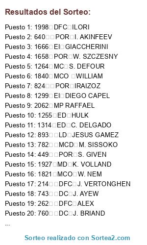 Lista de participantes: 345 EI A. YOUNG, 1500 POR M. PERIN, 747 MCD C. KABORE, 1499 LD L. YOUNG, 1005 POR DIEGO LOPEZ, 1980 DFC T. ALDERWEIRELD, 1936 POR DIDA, 1935 EI BRUMA, 1937 POR ROBERTO, 1504 MC F. DELPH, 181 DFC FELIPE MELO, 452 DFC R. DUNNE, 27 DFC O. TOPRAK, 46 MCD LUIZ GUSTAVO, 261 ED S. KALOU, 1113 DFC W. SAMUEL, 21 DC C. OBASI, 321 MCO DAVID SILVA, 1184 EI E. LAVEZZI, 1701 POR RAFAEL, 116 MCO JURADO, 875 MI ADRIANO, 701 DFC M. CIANI, 796 ED J. PITROIPA, 333 LD N. ONUOHA, 1812 MI J. DRAXLER, 268 DFC P. JAGIELKA, 325 DFC K. TOURE, 1545 LI E. PIETERS, 211 POR K. VERMEER, 1542 LD L. DE SILVESTRI, 844 DC FALCAO, 1243 POR S. ROMERO, 624 MI Y. ZHIRKOV, 667 MC D. DE ZEEUW, 61 DFC N. SUBOTIC, 1118 MCO W. SNEIJDER, 1238 DC A. DI NATALE, 865 MCO CESC FABREGAS, 1548 LD PEDRO SILVA, 1166 MCO S. MAURI, 414 MCO L. MODRIC, 1149 DFC L. BONUCCI, 471 MC A. RAMSEY, 1182 MI A. DOSSENA, 349 MC D. FLETCHER, 1215 MCD D. DE ROSSI, 294 DC M. DEMBELE, 327 MC J. MILNER, 1126 DC D. MILITO, 1257 EI VARELA, 54 MCD A. TYMOSHCHUK, 827 DFC MIKEL SAN JOSE, 1979 DFC M. CIANI, 742 MI A. AYEW, 1522 MD DE MARCOS, 949 MCD L. DIARRA, 317 DFC J. LESCOTT, 929 POR CASILLAS, 884 EI DIEGO CASTRO, 553 DC LIEDSON, 745 LD R. FANNI, 1047 LI T. TAIWO, 1106 DC ZE EDUARDO, 931 DFC PEPE, 843 ED REYES, 323 DC S. AGÜERO, 967 DFC M. CACERES, 1314 ED C. DELGADO, 1020 DFC G. RODRIGUEZ, 402 MI K. RICHARDSON, 172 MI V. STOCKER, 216 MCO C. ERIKSEN, 29 LI M. KADLEC, 1471 MCO S. FEGHOULI, 370 LI D. SANTON, 404 DC N. BENDTNER, 1919 DFC MANOEL MESSIAS, 1987 EI F. THAUVIN, 225 DFC DOUGLAS, 28 DFC S. REINARTZ, 1292 LI H. BEDIMO, 1229 MC G. D'AGOSTINO, 456 DC G. AGBONLAHOR, 1610 MC N. MATIC, 51 DC M. GOMEZ, 1527 LD C. LELL, 311 LI FABIO AURELIO, 396 LD J. O'SHEA, 41 POR M. NEUER, 1285 DC J. SAVIOLA, 776 MI NENE, 677 DFC N. LOMBAERTS, 53 DFC D. VAN BUYTEN, 799 MCD E. CAPOUE, 460 MC J. JENAS, 746 DC A. GIGNAC, 1114 LD MAICON, 410 DFC M. DAWSON, 1358 LI C. RODRIGUEZ, 886 MCO CARLOS MARTINS, 285 LI J. RIISE, 640 POR I. AKINFEEV, 1167 DC M. KLOSE, 1551 LI A. TRAORE, 45 LD P. LAHM, 1299 EI DIEGO CAPEL, 972 MCD G. MEDEL, 1354 DFC G. PALETTA, 407 POR B. FRIEDEL, 1362 POR M. ZIEGLER, 1165 MCO HERNANES, 1364 MCO Z. JUNUZOVIC, 6 LD S. RIETHER, 1162 MC C. LEDESMA, 679 MCD I. DENISOV, 915 LTD SRNA, 1943 POR B.COSTIL, 1944 LI L. MELGAREJO, 1945 MC E. PEREZ, 1946 MI KOSECKI, 1947 MD NSUE, 1948 DC RUSSELL, 1949 MD M. SALAH, 1950 DC D. PABON, 1951 DC A. KOKORIN, 1952 LTD SILVIO, 1953 ED Y. MOLLO, 1954 MCO TAISON, 1955 EI T. ELYOUNOUSSI, 1956 MCO L. PAREDES, 1957 MD D. EBERT, 1958 MCO R. BARKLEY, 1959 DC D. MORENO, 1960 LI A. MORENO, 1961 DC THIEVY, 1962 DC P. DIAWARA, 1963 LD ROSE, 1964 DC CARLOS LUQUE, 1965 MCD J. MALANDA, 1966 ED Z. BAKKALI, 1967 MCO A. TEIXEIRA, 1968 MCD J. GUILAVOGUI, 1969 MCO DOUGLAS COSTA, 1970 MCO QUINTERO, 1971 DC ICARDI, 1972 DFC T. HUBOCAN, 1973 DC LIMA, 1974 MC RAFINHA, 1975 MI A. CENTURION, 566 DFC ADILSON, 656 MC C. NOBOA, 1283 DC O. CARDOZO, 1363 MC O. ENGELAAR, 1361 MC A. DA SILVA, 503 DFC G. CAHILL, 1034 DC A. CASSANO, 1628 LI C. M'BENGUE, 1141 MI E. ELIA, 227 DC L. DE JONG, 584 MCO OSCAR, 808 POR U. RAME, 35 DC S. KIEBLING, 266 POR T. HOWARD, 1006 DFC C. ZAPATA, 316 DFC V. KOMPANY, 1062 MC R. NAINGGOLAN, 913 MCD BAENA, 9 MCD O. AHMEDOV, 1560 DC A. KONE, 1366 DFC L. RINAUDO, 896 ED JOAQUIN, 786 MI B. SAKO, 1341 MCO A. LJAJIC, 990 ED PABLO HERNANDEZ, 722 MCD R. MAVUBA, 324 DC C. TEVEZ, 734 LD AZPILICUETA, 1 POR K. TRAPP, 777 DC K. GAMEIRO, 408 LD K. WALKER, 1161 LI S. RADU, 1230 POR S. HANDANOVIC, 631 MC P. MAMAEV, 1176 DFC H. CAMPAGNARO, 1002 DC ADURIZ, 1374 MD D. SALPINGIDIS, 161 DC C. PIZARRO, 1284 POR EDUARDO, 1372 LI GARRIDO, 165 LI M. SILVESTRE, 1177 DFC P. CANNAVARO, 382 DFC R. SHAWCROSS, 210 MCO VIEIRINHA, 319 MC Y. TOURE, 925 EI G. CASTRO, 1048 DFC D. BONERA, 417 DC E. ADEBAYOR, 470 MCD A. SONG, 735 DFC S. DIAWARA, 374 DC D. BA, 248 LI A. COLE, 632 MCO A. DZAGOEV, 862 LI E. ABIDAL, 111 MCO L. HOLTBY, 193 LD V. TOROSIDIS, 938 MCO M. OZIL, 760 DC J. BRIAND, 1133 POR G. BUFFON, 64 MCD S. BENDER, 689 MD V. BYSTROV, 346 DC W. ROONEY, 68 MI K. GROBKREUTZ, 1119 DC G. PAZZINI, 509 MCO M. DAVIES, 296 LD M. KELLY, 343 MCO T. CLEVERLEY, 326 MCD N. DE JONG, 231 POR A. ISAKSSON, 291 DC A. JOHNSON, 466 LD B. SAGNA, 1252 LI A. PEREIRA, 457 DC D. BENT, 652 DC F. CAICEDO, 839 LI FILIPE, 548 DFC CHICAO, 5 DFC GEROMEL, 1011 MD CANI, 549 MC PAULINHO, 850 DFC MIRANDA, 1513 MC S. BATTAGLIA, 278 MI D. BILYALETDINOV, 676 DFC BRUNO ALVES, 118 MCO A. BAUMJOHANN, 937 EI CRISTIANO RONALDO, 627 DC DIEGO TARDELLI, 1218 DC F. TOTTI, 233 MCO G. WIJNALDUM, 355 LD RAFAEL, 985 POR GUAITA, 1207 MCO S. GIOVINCO, 939 DC K. BENZEMA, 486 MC A. DIABY, 782 MCD M. SISSOKO, 1240 DFC A. OGBONNA, 604 DC NEYMAR, 1597 MCD M. WAKASO, 262 DFC ALEX, 945 DFC RAUL ALBIOL, 26 LD G. CASTRO, 700 POR C. CARRASSO, 1249 LD C. SAPUNARU, 868 EI DAVID VILLA, 114 DC K. HUNTELAAR, 1261 EI C. RODRIGUEZ, 1233 DFC M. DOMIZZI, 1442 MCD SOUZA, 1032 MC A. AQUILANI, 1251 DFC N. OTAMENDI, 986 LD BRUNO, 706 MCD C. POULSEN, 1208 DC S. FLOCCARI, 1212 POR M. STEKELENBURG, 467 DFC P. MERTESACKER, 279 MCD P. POGBA, 71 MCD S. KEHL, 412 MD A. LENNON, 572 DC FRED, 1298 MCO M. IZMAILOV, 1590 LD S. SARIOGLU, 1209 DFC F. SANTACROCE, 1593 DFC HILTON, 295 POR PEPE REINA, 1028 DFC THIAGO SILVA, 1466 DFC DANIEL AYALA, 1464 MD N. EL ZHAR, 673 MD A. MCGEADY, 655 LI C. ANSALDI, 1036 POR M. AMELIA, 424 DC R. PAVLYUCHENKO, 997 DFC RICARDO COSTA, 347 DC J. HERNANDEZ, 125 DFC S. TASCI, 186 MI RIERA, 1172 SD L. INSIGNE, 898 MI DUDA, 1096 MD G. MESTO, 846 DFC D. GODIN, 7 DC L. PODOLSKI, 1088 MI J. VARGAS, 1279 MCD JAVI GARCIA, 880 DFC D. DIAZ, 1239 DC A. FLORO FLORES, 727 EI E. HAZARD, 223 MCO D. TADIC, 893 LD JESUS GAMEZ, 305 DC L. SUAREZ, 778 POR S. SIRIGU, 331 LI A. KOLAROV, 514 MD LEE CHUNG-YONG, 1303 DFC DANIEL CARRIÇO, 1010 MCO BORJA VALERO, 551 MCO ALEX, 737 MCD A. DIARRA, 491 DFC C. SAMBA, 84 LI D. AOGO, 914 MCO VERDU, 67 MCO S. KAGAWA, 1021 POR ARANZUBIA, 1019 LD ANGEL, 832 EI MUNIAIN, 1486 LD B. SILVA, 