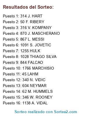Lista de participantes: 345 EI A. YOUNG, 1500 POR M. PERIN, 747 MCD C. KABORE, 1499 LD L. YOUNG, 1005 POR DIEGO LOPEZ, 1980 DFC T. ALDERWEIRELD, 1936 POR DIDA, 1935 EI BRUMA, 1937 POR ROBERTO, 1504 MC F. DELPH, 181 DFC FELIPE MELO, 452 DFC R. DUNNE, 27 DFC O. TOPRAK, 261 ED S. KALOU, 1113 DFC W. SAMUEL, 21 DC C. OBASI, 321 MCO DAVID SILVA, 1184 EI E. LAVEZZI, 1701 POR RAFAEL, 116 MCO JURADO, 875 MI ADRIANO, 796 ED J. PITROIPA, 333 LD N. ONUOHA, 1812 MI J. DRAXLER, 268 DFC P. JAGIELKA, 325 DFC K. TOURE, 211 POR K. VERMEER, 844 DC FALCAO, 1243 POR S. ROMERO, 624 MI Y. ZHIRKOV, 61 DFC N. SUBOTIC, 1118 MCO W. SNEIJDER, 1238 DC A. DI NATALE, 865 MCO CESC FABREGAS, 414 MCO L. MODRIC, 1149 DFC L. BONUCCI, 471 MC A. RAMSEY, 349 MC D. FLETCHER, 1215 MCD D. DE ROSSI, 294 DC M. DEMBELE, 327 MC J. MILNER, 1126 DC D. MILITO, 1257 EI VARELA, 54 MCD A. TYMOSHCHUK, 827 DFC MIKEL SAN JOSE, 1979 DFC M. CIANI, 742 MI A. AYEW, 1522 MD DE MARCOS, 949 MCD L. DIARRA, 317 DFC J. LESCOTT, 929 POR CASILLAS, 884 EI DIEGO CASTRO, 745 LD R. FANNI, 931 DFC PEPE, 843 ED REYES, 323 DC S. AGÜERO, 967 DFC M. CACERES, 1314 ED C. DELGADO, 1020 DFC G. RODRIGUEZ, 402 MI K. RICHARDSON, 172 MI V. STOCKER, 216 MCO C. ERIKSEN, 29 LI M. KADLEC, 1471 MCO S. FEGHOULI, 370 LI D. SANTON, 404 DC N. BENDTNER, 1919 DFC MANOEL MESSIAS, 1987 EI F. THAUVIN, 225 DFC DOUGLAS, 28 DFC S. REINARTZ, 1292 LI H. BEDIMO, 456 DC G. AGBONLAHOR, 1610 MC N. MATIC, 51 DC M. GOMEZ, 311 LI FABIO AURELIO, 41 POR M. NEUER, 1285 DC J. SAVIOLA, 677 DFC N. LOMBAERTS, 53 DFC D. VAN BUYTEN, 799 MCD E. CAPOUE, 746 DC A. GIGNAC, 1114 LD MAICON, 410 DFC M. DAWSON, 1358 LI C. RODRIGUEZ, 285 LI J. RIISE, 640 POR I. AKINFEEV, 1167 DC M. KLOSE, 45 LD P. LAHM, 1299 EI DIEGO CAPEL, 972 MCD G. MEDEL, 1354 DFC G. PALETTA, 407 POR B. FRIEDEL, 1362 POR YOEL R., 1165 MCO HERNANES, 1364 MCO Z. JUNUZOVIC, 6 LD S. RIETHER, 1162 MC C. LEDESMA, 679 MCD I. DENISOV, 915 LTD SRNA, 1943 POR B.COSTIL, 1944 LI L. MELGAREJO, 1945 MC E. PEREZ, 1946 MI KOSECKI, 1947 MD NSUE, 1948 DC RUSSELL, 1949 MD M. SALAH, 1950 DC D. PABON, 1951 DC A. KOKORIN, 1952 LTD SILVIO, 1953 ED Y. MOLLO, 1954 MCO TAISON, 1955 EI T. ELYOUNOUSSI, 1956 MCO L. PAREDES, 1957 MD D. EBERT, 1958 MCO R. BARKLEY, 1959 DC D. MORENO, 1960 LI A. MORENO, 1961 DC THIEVY, 1962 DC P. DIAWARA, 1963 LD ROSE, 1964 DC CARLOS LUQUE, 1965 MCD J. MALANDA, 1966 ED Z. BAKKALI, 1967 MCO A. TEIXEIRA, 1968 MCD J. GUILAVOGUI, 1969 MCO DOUGLAS COSTA, 1970 MCO QUINTERO, 1971 DC ICARDI, 1972 DFC T. HUBOCAN, 1973 DC LIMA, 1974 MC RAFINHA, 1975 MI A. CENTURION, 566 DFC ADILSON, 656 MC C. NOBOA, 1283 DC O. CARDOZO, 503 DFC G. CAHILL, 1034 DC A. CASSANO, 1628 LI C. M'BENGUE, 1141 MI E. ELIA, 227 DC L. DE JONG, 584 MCO OSCAR, 35 DC S. KIEBLING, 266 POR T. HOWARD, 1006 DFC C. ZAPATA, 316 DFC V. KOMPANY, 1062 MC R. NAINGGOLAN, 9 MCD O. AHMEDOV, 1560 DC A. KONE, 1366 DFC L. RINAUDO, 896 ED JOAQUIN, 786 MI B. SAKO, 1341 MCO A. LJAJIC, 990 ED PABLO HERNANDEZ, 722 MCD R. MAVUBA, 324 DC C. TEVEZ, 734 LD AZPILICUETA, 1 POR K. TRAPP, 777 DC K. GAMEIRO, 408 LD K. WALKER, 1161 LI S. RADU, 1230 POR S. HANDANOVIC, 631 MC P. MAMAEV, 1176 DFC H. CAMPAGNARO, 1002 DC ADURIZ, 1374 MD D. SALPINGIDIS, 161 DC C. PIZARRO, 1284 POR EDUARDO, 1372 LI GARRIDO, 165 LI M. SILVESTRE, 1177 DFC P. CANNAVARO, 382 DFC R. SHAWCROSS, 210 MCO VIEIRINHA, 319 MC Y. TOURE, 1048 DFC D. BONERA, 417 DC E. ADEBAYOR, 470 MCD A. SONG, 735 DFC S. DIAWARA, 374 DC D. BA, 248 LI A. COLE, 632 MCO A. DZAGOEV, 862 LI E. ABIDAL, 111 MCO L. HOLTBY, 193 LD V. TOROSIDIS, 938 MCO M. OZIL, 760 DC J. BRIAND, 1133 POR G. BUFFON, 64 MCD S. BENDER, 689 MD V. BYSTROV, 346 DC W. ROONEY, 68 MI K. GROBKREUTZ, 1119 DC G. PAZZINI, 509 MCO M. DAVIES, 296 LD M. KELLY, 343 MCO T. CLEVERLEY, 326 MCD N. DE JONG, 231 POR A. ISAKSSON, 291 DC A. JOHNSON, 466 LD B. SAGNA, 1252 LI A. PEREIRA, 457 DC D. BENT, 652 DC F. CAICEDO, 839 LI FILIPE, 1011 MD CANI, 549 MC PAULINHO, 850 DFC MIRANDA, 278 MI D. BILYALETDINOV, 676 DFC BRUNO ALVES, 937 EI CRISTIANO RONALDO, 1218 DC F. TOTTI, 233 MCO G. WIJNALDUM, 355 LD RAFAEL, 985 POR GUAITA, 1207 MCO S. GIOVINCO, 939 DC K. BENZEMA, 486 MC A. DIABY, 782 MCD M. SISSOKO, 1240 DFC A. OGBONNA, 604 DC NEYMAR, 1597 MCD M. WAKASO, 262 DFC ALEX, 945 DFC RAUL ALBIOL, 26 LD G. CASTRO, 700 POR C. CARRASSO, 1249 LD C. SAPUNARU, 868 EI DAVID VILLA, 114 DC K. HUNTELAAR, 1261 EI C. RODRIGUEZ, 1233 DFC M. DOMIZZI, 1442 MCD SOUZA, 1032 MC A. AQUILANI, 1251 DFC N. OTAMENDI, 986 LD BRUNO, 1212 POR M. STEKELENBURG, 467 DFC P. MERTESACKER, 279 MCD P. POGBA, 71 MCD S. KEHL, 412 MD A. LENNON, 572 DC FRED, 1590 LD S. SARIOGLU, 1209 DFC F. SANTACROCE, 295 POR PEPE REINA, 1028 DFC THIAGO SILVA, 1464 MD N. EL ZHAR, 673 MD A. MCGEADY, 655 LI C. ANSALDI, 1036 POR M. AMELIA, 997 DFC RICARDO COSTA, 347 DC J. HERNANDEZ, 125 DFC S. TASCI, 186 MI RIERA, 1172 SD L. INSIGNE, 898 MI DUDA, 1096 MD G. MESTO, 846 DFC D. GODIN, 7 DC L. PODOLSKI, 1279 MCD JAVI GARCIA, 880 DFC D. DIAZ, 1239 DC A. FLORO FLORES, 727 EI E. HAZARD, 223 MCO D. TADIC, 893 LD JESUS GAMEZ, 305 DC L. SUAREZ, 778 POR S. SIRIGU, 331 LI A. KOLAROV, 514 MD LEE CHUNG-YONG, 1303 DFC DANIEL CARRIÇO, 1010 MCO BORJA VALERO, 737 MCD A. DIARRA, 491 DFC C. SAMBA, 84 LI D. AOGO, 914 MCO VERDU, 67 MCO S. KAGAWA, 1021 POR ARANZUBIA, 832 EI MUNIAIN, 1918 LI SIQUEIRA, 1921 MI CEDRICK, 1920 MCO NOSA, 1922 EI M. STOCH, 1923 DFC V. CHIRICHES, 1480 LI KLEBER, 1219 DC BOJAN, 754 POR H. LLORIS, 44 DFC H. BADSTUBER, 1066 DFC N. LEGROTTAGLIE, 269 DFC S. DISTIN, 864 MC XAVI, 47 MC B. SCHWEINSTEIGER, 683 MCO DANNY, 1289 LI CAPDEVILA, 358 DC D. BERBATOV, 1630 LI M. OLSSON, 219 DC M. EL HAMDAOUI, 1631 ED MAIKON LEITE, 20 MCO ROBERTO FIRMINO, 244 POR P. CECH, 1629 POR S. ULREICH, 1134 LD S. LICHSTEINER, 236 ED J. LENS, 837 DFC L. PEREA, 544 DC LEO BAPTISTAO, 992 MC E. BANEGA, 1135 DFC A. BARZAGLI, 1259 EI J. RODRIGUEZ, 1131 POR E. VIVIANO, 364 DFC F. COLOCCINI, 994 DC JONAS, 830 MD SUSAETA, 109 LI C. FUCHS, 1245 LD M. MOTTA, 1217 MCO M. PJANIC, 422 DC J. DEFOE, 831 DC FERNANDO LLORENTE