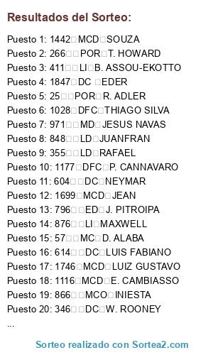 Lista de participantes: 345 EI A. YOUNG, 1500 POR M. PERIN, 747 MCD C. KABORE, 1499 LD L. YOUNG, 1005 POR DIEGO LOPEZ, 1980 DFC T. ALDERWEIRELD, 1936 POR DIDA, 1935 EI BRUMA, 1937 POR ROBERTO, 1504 MC F. DELPH, 181 DFC FELIPE MELO, 452 DFC R. DUNNE, 27 DFC O. TOPRAK, 261 ED S. KALOU, 1113 DFC W. SAMUEL, 21 DC C. OBASI, 321 MCO DAVID SILVA, 1184 EI E. LAVEZZI, 1701 POR RAFAEL, 116 MCO JURADO, 875 MI ADRIANO, 796 ED J. PITROIPA, 333 LD N. ONUOHA, 1812 MI J. DRAXLER, 268 DFC P. JAGIELKA, 325 DFC K. TOURE, 211 POR K. VERMEER, 844 DC FALCAO, 1243 POR S. ROMERO, 624 MI Y. ZHIRKOV, 61 DFC N. SUBOTIC, 1118 MCO W. SNEIJDER, 1238 DC A. DI NATALE, 865 MCO CESC FABREGAS, 414 MCO L. MODRIC, 1149 DFC L. BONUCCI, 471 MC A. RAMSEY, 349 MC D. FLETCHER, 1215 MCD D. DE ROSSI, 294 DC M. DEMBELE, 327 MC J. MILNER, 1126 DC D. MILITO, 1257 EI VARELA, 54 MCD A. TYMOSHCHUK, 827 DFC MIKEL SAN JOSE, 1979 DFC M. CIANI, 742 MI A. AYEW, 1522 MD DE MARCOS, 949 MCD L. DIARRA, 317 DFC J. LESCOTT, 929 POR CASILLAS, 884 EI DIEGO CASTRO, 745 LD R. FANNI, 931 DFC PEPE, 843 ED REYES, 323 DC S. AGÜERO, 967 DFC M. CACERES, 1314 ED C. DELGADO, 1020 DFC G. RODRIGUEZ, 402 MI K. RICHARDSON, 172 MI V. STOCKER, 216 MCO C. ERIKSEN, 29 LI M. KADLEC, 1471 MCO S. FEGHOULI, 370 LI D. SANTON, 404 DC N. BENDTNER, 1919 DFC MANOEL MESSIAS, 1987 EI F. THAUVIN, 225 DFC DOUGLAS, 28 DFC S. REINARTZ, 1292 LI H. BEDIMO, 456 DC G. AGBONLAHOR, 1610 MC N. MATIC, 51 DC M. GOMEZ, 311 LI FABIO AURELIO, 41 POR M. NEUER, 1285 DC J. SAVIOLA, 677 DFC N. LOMBAERTS, 53 DFC D. VAN BUYTEN, 799 MCD E. CAPOUE, 746 DC A. GIGNAC, 1114 LD MAICON, 410 DFC M. DAWSON, 1358 LI C. RODRIGUEZ, 285 LI J. RIISE, 640 POR I. AKINFEEV, 1167 DC M. KLOSE, 45 LD P. LAHM, 1299 EI DIEGO CAPEL, 972 MCD G. MEDEL, 1354 DFC G. PALETTA, 407 POR B. FRIEDEL, 1362 POR YOEL R., 1165 MCO HERNANES, 1364 MCO Z. JUNUZOVIC, 6 LD S. RIETHER, 1162 MC C. LEDESMA, 679 MCD I. DENISOV, 915 LTD SRNA, 1943 POR B.COSTIL, 1944 LI L. MELGAREJO, 1945 MC E. PEREZ, 1946 MI KOSECKI, 1947 MD NSUE, 1948 DC RUSSELL, 1949 MD M. SALAH, 1950 DC D. PABON, 1951 DC A. KOKORIN, 1952 LTD SILVIO, 1953 ED Y. MOLLO, 1954 MCO TAISON, 1955 EI T. ELYOUNOUSSI, 1956 MCO L. PAREDES, 1957 MD D. EBERT, 1958 MCO R. BARKLEY, 1959 DC D. MORENO, 1960 LI A. MORENO, 1961 DC THIEVY, 1962 DC P. DIAWARA, 1963 LD ROSE, 1964 DC CARLOS LUQUE, 1965 MCD J. MALANDA, 1966 ED Z. BAKKALI, 1967 MCO A. TEIXEIRA, 1968 MCD J. GUILAVOGUI, 1969 MCO DOUGLAS COSTA, 1970 MCO QUINTERO, 1971 DC ICARDI, 1972 DFC T. HUBOCAN, 1973 DC LIMA, 1974 MC RAFINHA, 1975 MI A. CENTURION, 566 DFC ADILSON, 656 MC C. NOBOA, 1283 DC O. CARDOZO, 503 DFC G. CAHILL, 1034 DC A. CASSANO, 1628 LI C. M'BENGUE, 1141 MI E. ELIA, 227 DC L. DE JONG, 584 MCO OSCAR, 35 DC S. KIEBLING, 266 POR T. HOWARD, 1006 DFC C. ZAPATA, 316 DFC V. KOMPANY, 1062 MC R. NAINGGOLAN, 9 MCD O. AHMEDOV, 1560 DC A. KONE, 1366 DFC L. RINAUDO, 896 ED JOAQUIN, 786 MI B. SAKO, 1341 MCO A. LJAJIC, 990 ED PABLO HERNANDEZ, 722 MCD R. MAVUBA, 324 DC C. TEVEZ, 734 LD AZPILICUETA, 1 POR K. TRAPP, 777 DC K. GAMEIRO, 408 LD K. WALKER, 1161 LI S. RADU, 1230 POR S. HANDANOVIC, 631 MC P. MAMAEV, 1176 DFC H. CAMPAGNARO, 1002 DC ADURIZ, 1374 MD D. SALPINGIDIS, 161 DC C. PIZARRO, 1284 POR EDUARDO, 1372 LI GARRIDO, 165 LI M. SILVESTRE, 1177 DFC P. CANNAVARO, 382 DFC R. SHAWCROSS, 210 MCO VIEIRINHA, 319 MC Y. TOURE, 1048 DFC D. BONERA, 417 DC E. ADEBAYOR, 470 MCD A. SONG, 735 DFC S. DIAWARA, 374 DC D. BA, 248 LI A. COLE, 632 MCO A. DZAGOEV, 862 LI E. ABIDAL, 111 MCO L. HOLTBY, 193 LD V. TOROSIDIS, 938 MCO M. OZIL, 760 DC J. BRIAND, 1133 POR G. BUFFON, 64 MCD S. BENDER, 689 MD V. BYSTROV, 346 DC W. ROONEY, 68 MI K. GROBKREUTZ, 1119 DC G. PAZZINI, 509 MCO M. DAVIES, 296 LD M. KELLY, 343 MCO T. CLEVERLEY, 326 MCD N. DE JONG, 231 POR A. ISAKSSON, 291 DC A. JOHNSON, 466 LD B. SAGNA, 1252 LI A. PEREIRA, 457 DC D. BENT, 652 DC F. CAICEDO, 839 LI FILIPE, 1011 MD CANI, 549 MC PAULINHO, 850 DFC MIRANDA, 278 MI D. BILYALETDINOV, 676 DFC BRUNO ALVES, 937 EI CRISTIANO RONALDO, 1218 DC F. TOTTI, 233 MCO G. WIJNALDUM, 355 LD RAFAEL, 985 POR GUAITA, 1207 MCO S. GIOVINCO, 939 DC K. BENZEMA, 486 MC A. DIABY, 782 MCD M. SISSOKO, 1240 DFC A. OGBONNA, 604 DC NEYMAR, 1597 MCD M. WAKASO, 262 DFC ALEX, 945 DFC RAUL ALBIOL, 26 LD G. CASTRO, 700 POR C. CARRASSO, 1249 LD C. SAPUNARU, 868 EI DAVID VILLA, 114 DC K. HUNTELAAR, 1261 EI C. RODRIGUEZ, 1233 DFC M. DOMIZZI, 1442 MCD SOUZA, 1032 MC A. AQUILANI, 1251 DFC N. OTAMENDI, 986 LD BRUNO, 1212 POR M. STEKELENBURG, 467 DFC P. MERTESACKER, 279 MCD P. POGBA, 71 MCD S. KEHL, 412 MD A. LENNON, 572 DC FRED, 1590 LD S. SARIOGLU, 1209 DFC F. SANTACROCE, 295 POR PEPE REINA, 1028 DFC THIAGO SILVA, 1464 MD N. EL ZHAR, 673 MD A. MCGEADY, 655 LI C. ANSALDI, 1036 POR M. AMELIA, 997 DFC RICARDO COSTA, 347 DC J. HERNANDEZ, 125 DFC S. TASCI, 186 MI RIERA, 1172 SD L. INSIGNE, 898 MI DUDA, 1096 MD G. MESTO, 846 DFC D. GODIN, 7 DC L. PODOLSKI, 1279 MCD JAVI GARCIA, 880 DFC D. DIAZ, 1239 DC A. FLORO FLORES, 727 EI E. HAZARD, 223 MCO D. TADIC, 893 LD JESUS GAMEZ, 305 DC L. SUAREZ, 778 POR S. SIRIGU, 331 LI A. KOLAROV, 514 MD LEE CHUNG-YONG, 1303 DFC DANIEL CARRIÇO, 1010 MCO BORJA VALERO, 737 MCD A. DIARRA, 491 DFC C. SAMBA, 84 LI D. AOGO, 914 MCO VERDU, 67 MCO S. KAGAWA, 1021 POR ARANZUBIA, 832 EI MUNIAIN, 1918 LI SIQUEIRA, 1921 MI CEDRICK, 1920 MCO NOSA, 1922 EI M. STOCH, 1923 DFC V. CHIRICHES, 1480 LI KLEBER, 1219 DC BOJAN, 754 POR H. LLORIS, 44 DFC H. BADSTUBER, 1066 DFC N. LEGROTTAGLIE, 269 DFC S. DISTIN, 864 MC XAVI, 47 MC B. SCHWEINSTEIGER, 683 MCO DANNY, 1289 LI CAPDEVILA, 358 DC D. BERBATOV, 1630 LI M. OLSSON, 219 DC M. EL HAMDAOUI, 1631 ED MAIKON LEITE, 20 MCO ROBERTO FIRMINO, 244 POR P. CECH, 1629 POR S. ULREICH, 1134 LD S. LICHSTEINER, 236 ED J. LENS, 837 DFC L. PEREA, 544 DC LEO BAPTISTAO, 992 MC E. BANEGA, 1135 DFC A. BARZAGLI, 1259 EI J. RODRIGUEZ, 1131 POR E. VIVIANO, 364 DFC F. COLOCCINI, 994 DC JONAS, 830 MD SUSAETA, 109 LI C. FUCHS, 1245 LD M. MOTTA, 1217 MCO M. PJANIC, 422 DC J. DEFOE, 831 DC FERNANDO LLORENTE