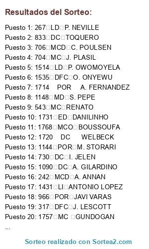 Lista de participantes: 345 EI A. YOUNG, 829 MCO ANDER HERRERA, 1500 POR B. GUZAN, 512 DC D. N'GOG, 747 MCD C. KABORE, 1499 LD L. YOUNG, 1005 POR DIEGO LOPEZ, 1504 MC F. DELPH, 1501 LD SERGIO SANCHEZ, 885 MI GAVILAN, 181 DFC FELIPE MELO, 814 DFC R. MARQUEZ, 452 DFC R. DUNNE, 46 MCD LUIZ GUSTAVO, 1505 MC J. LEDLEY, 927 DC R. SANTA CRUZ, 261 ED S. KALOU, 453 LI S. WARNOCK, 1502 DFC C. DAVIES, 1113 DFC W. SAMUEL, 395 POR C. GORDON, 21 DC C. OBASI, 321 MCO DAVID SILVA, 1184 EI E. LAVEZZI, 1701 POR RAFAEL, 116 MCO JURADO, 1539 LD M. ODDO, 1536 POR RICARDO, 704 MC J. PLASIL, 875 MI ADRIANO, 701 DFC M. CIANI, 796 ED J. PITROIPA, 333 LD N. ONUOHA, 1538 DFC G. NIEDERMEIER, 268 DFC P. JAGIELKA, 1535 DFC O. ONYEWU, 1540 MCD SIMAO, 1537 DFC L. N'DIAYE, 325 DFC K. TOURE, 687 DC A. BUKHAROV, 1063 MCO A. COSSU, 1546 DC BENJANI, 157 LD C. FRITZ, 1545 LI E. PIETERS, 1199 DC F. MICCOLI, 211 POR K. VERMEER, 1542 LD L. DE SILVESTRI, 844 DC FALCAO, 1243 POR S. ROMERO, 910 DC TAMUDO, 624 MI Y. ZHIRKOV, 667 MC D. DE ZEEUW, 61 DFC N. SUBOTIC, 173 DFC DAVID NAVARRO, 1297 ED JEFFREN, 1118 MCO W. SNEIJDER, 1544 MCD E. ENOH, 1238 DC A. DI NATALE, 1139 MC A. PIRLO, 297 DFC J. CARRAGHER, 1547 LD G. HOYTE, 1552 DC JO, 865 MCO CESC FABREGAS, 1554 MCO M. COUTADEUR, 1467 DC NINO, 1550 LI P. GILBERT, 1548 LD PEDRO SILVA, 1166 MCO S. MAURI, 153 DFC A. FRIEDRICH, 414 MCO L. MODRIC, 1149 DFC L. BONUCCI, 471 MC A. RAMSEY, 969 DFC J. ESCUDE, 1182 MI A. DOSSENA, 765 DFC J. MENSAH, 1503 MCD MOISES HURTADO, 857 POR RICARDO, 1549 MC M. RANDALL, 349 MC D. FLETCHER, 1215 MCD D. DE ROSSI, 294 DC M. DEMBELE, 327 MC J. MILNER, 1520 POR RAUL, 1519 LD S. WHITTAKER, 335 LI W. BRIDGE, 1126 DC D. MILITO, 600 MCO ELANO, 1257 EI VARELA, 54 MCD A. TYMOSHCHUK, 827 DFC MIKEL SAN JOSE, 1523 MC ORBAIZ, 1430 DFC S. PRODL, 742 MI A. AYEW, 1521 DFC AITOR OCIO, 1522 MD DE MARCOS, 949 MCD L. DIARRA, 317 DFC J. LESCOTT, 929 POR CASILLAS, 884 EI DIEGO CASTRO, 553 DC LIEDSON, 779 DC M. ERDINC, 1507 MCO MASSOUD, 1266 POR QUIM, 745 LD R. FANNI, 1047 LI T. TAIWO, 1106 DC ZE EDUARDO, 847 MC TIAGO, 931 DFC PEPE, 391 MCD W. PALACIOS, 843 ED REYES, 323 DC S. AGÜERO, 693 DFC A. COULIBALY, 967 DFC M. CACERES, 1314 ED C. DELGADO, 1020 DFC G. RODRIGUEZ, 402 MI K. RICHARDSON, 172 MI V. STOCKER, 31 MCD S. ROLFES, 216 MCO C. ERIKSEN, 1611 DC BUENO, 1469 DC C. VELA, 1468 LD D. SCHWAAB, 192 DC F. CAVENAGHI, 29 LI M. KADLEC, 420 MC T. HUDDLESTONE, 1471 MCO S. FEGHOULI, 361 POR T. KRUL, 370 LI D. SANTON, 404 DC N. BENDTNER, 225 DFC DOUGLAS, 28 DFC S. REINARTZ, 1292 LI H. BEDIMO, 1229 MC G. D'AGOSTINO, 1082 POR A. BORUC, 1612 ED D. BISESWAR, 456 DC G. AGBONLAHOR, 1610 MC N. MATIC, 51 DC M. GOMEZ, 1470 MCD L. SINKIEWICZ, 1527 LD C. LELL, 311 LI FABIO AURELIO, 730 DC I. JELEN, 396 LD J. O'SHEA, 973 MCO P. TROCHOWSKI, 1526 POR T. KRAFT, 41 POR M. NEUER, 280 DC V. ANICHEBE, 1285 DC J. SAVIOLA, 776 MI NENE, 677 DFC N. LOMBAERTS, 531 MCD S. KARA, 53 DFC D. VAN BUYTEN, 799 MCD E. CAPOUE, 460 MC J. JENAS, 1525 DFC MARIO, 1367 ED Y. GOUFFRAN, 746 DC A. GIGNAC, 1345 MCD PUÑAL, 1553 EI A. DRIVER, 1114 LD MAICON, 1140 MD M. KRASIC, 410 DFC M. DAWSON, 1360 MCO ALFARO, 1358 LI C. RODRIGUEZ, 886 MCO CARLOS MARTINS, 1355 POR CODINA, 285 LI J. RIISE, 1356 LD M. CHALME, 640 POR I. AKINFEEV, 1167 DC M. KLOSE, 1551 LI A. TRAORE, 1581 DC F. CAMPBELL, 45 LD P. LAHM, 638 DC T. NECID, 1299 EI DIEGO CAPEL, 972 MCD G. MEDEL, 1354 DFC G. PALETTA, 1359 ED C. CHAVEZ, 1357 DFC A. MADLUNG, 383 DFC J. WOODGATE, 407 POR B. FRIEDEL, 1153 DC L. TONI, 1362 POR M. ZIEGLER, 1165 MCO HERNANES, 1364 MCO P. FOGGIA, 1365 LI PAREDES, 6 LD S. RIETHER, 75 DC M. ZIDAN, 1162 MC C. LEDESMA, 1449 LD NELSON, 679 MCD I. DENISOV, 915 MC JAVI MARQUEZ, 566 DFC ALEX SILVA, 582 MC TINGA, 656 MC C. NOBOA, 1283 DC O. CARDOZO, 1363 MC O. ENGELAAR, 1361 MC A. DA SILVA, 503 DFC G. CAHILL, 1034 DC A. CASSANO, 1628 LI C. M'BENGUE, 1141 MI E. ELIA, 177 MCO J. RIQUELME, 227 DC L. DE JONG, 584 MCO OSCAR, 808 POR U. RAME, 35 DC S. KIEBLING, 1324 DC A. STOKES, 266 POR T. HOWARD, 1006 DFC C. ZAPATA, 316 DFC V. KOMPANY, 1062 MC R. NAINGGOLAN, 287 MC S. SIDWELL, 913 MCD BAENA, 9 MCD O. AHMEDOV, 1164 DC D. CISSE, 129 MCD Z. KUZMANOVIC, 1560 DC A. KONE, 1366 DFC L. RINAUDO, 896 ED JOAQUIN, 237 DC T. MATAVZ, 786 MI B. SAKO, 889 ED Y. MOLLO, 1341 MCO A. LJAJIC, 990 ED PABLO HERNANDEZ, 722 MCD R. MAVUBA, 1384 DC ARANDA, 324 DC C. TEVEZ, 1017 MCO CAMUÑAS, 734 LD AZPILICUETA, 1 POR K. TRAPP, 777 DC K. GAMEIRO, 408 LD K. WALKER, 1383 MCO S. HOFMANN, 1161 LI S. RADU, 920 DC W. PANDIANI, 34 MCO RENATO AUGUSTO, 1564 DC DIOGO, 1230 POR S. HANDANOVIC, 1226 MD TADDEI, 695 MCD D. NDINGA, 1382 DFC HENRIQUE, 1381 DFC MIGUEL FLAÑO, 631 MC P. MAMAEV, 594 EI LUAN, 1122 MCD T. MOTTA, 1176 DFC H. CAMPAGNARO, 1002 DC ADURIZ, 1374 MD D. SALPINGIDIS, 161 DC C. PIZARRO, 93 MCD G. KACAR, 1284 POR EDUARDO, 1372 LI GARRIDO, 1375 DC GUIZA, 165 LI M. SILVESTRE, 813 DC R. KEANE, 1177 DFC P. CANNAVARO, 382 DFC R. SHAWCROSS, 210 MCO VIEIRINHA, 319 MC Y. TOURE, 925 EI G. CASTRO, 1048 DFC D. BONERA, 1373 MC RICARDO, 417 DC E. ADEBAYOR, 470 MCD A. SONG, 735 DFC S. DIAWARA, 374 DC D. BA, 248 LI A. COLE, 632 MCO A. DZAGOEV, 862 LI E. ABIDAL, 255 POR HILARIO, 1473 DC JONATHAN PEREIRA, 111 MCO L. HOLTBY, 1621 POR S. LOACH, 193 LD V. TOROSIDIS, 938 MCO M. OZIL, 760 DC J. BRIAND, 1133 POR G. BUFFON, 64 MCD S. BENDER, 689 MD V. BYSTROV, 437 MC G. DORRANS, 346 DC W. ROONEY, 68 MI K. GROBKREUTZ, 1119 DC G. PAZZINI, 1472 MC L. BOWYER, 1620 DFC M. MANCIENNE, 1622 DFC S. BELL, 1349 DC L. KOZAK, 509 MCO M. DAVIES, 296 LD M. KELLY, 343 MCO T. CLEVERLE, 326 MCD N. DE JONG, 739 MCD B. CHEYROU, 231 POR A. ISAKSSON, 291 DC A. JOHNSON, 466 LD B. SAGNA, 1252 LI A. PEREIRA, 457 DC D. BENT, 652 DC F. CAICEDO, 1512 DC J. VAUGHAN, 839 LI FILIPE, 1511 LD T. HIBBERT, 1174 POR JULIO SERGIO, 548 DFC CHICAO, 5 DFC GEROMEL, 1011 MD CANI, 549 MC PAULINHO, 850 DFC MIRANDA, 1513 MC S. BATTAGLIA, 278 MI D. BILYALETDINOV, 676 DFC BRUNO ALVES, 118 MCO A. BAUMJOHANN, 1598 LI D. TSHIMANGA, 353 DC D. WELBECK, 937 