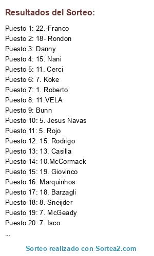 Lista de participantes: 1. Casilla, 2. Cáceres, 3. Caldirola, 4. Cahill, 5. Rojo, 6. Hutchinson, 7. El Shaarawy, 8. Junuzovic, 9. Ibarbo, 10. Firmino, 11. Gervinho, 12. Gebre Selassie, 13. Wolf, 14. Mertens, 15. Carvajal, 16. Fernandinho, 17. Elia, 18. Hajrovic, 19. Immobile, 20. Cabella, 21. Keita, 22. Aurier, 01. Douglas Costa, 02. Insigne, 03. Musa, 04. De Marcos, 05. Tiote, 06. Sam, 07. Enzo Perez, 08. Whilsere, 09. Honda, 10. Pisano, 11. Remy, 12. Richards, 13. José Izquierdo, 14. Rui Patricio, 15. Walker, 16. Umtiti, 17. Jordi Alba, 18. Brkick, 19. Colombi, 1- Consigli, 2- Bernard, 3- Lichteiner, 4- Manolas, 5- Fuentes, 6- Koscielny, 7- Sow, 8- William, 9- Juan Jesus, 10- Cañas, 11- Sanchez, 12- Walcott, 13- Alvaro, 14- Joaozinho, 15- Verrati, 16- Alvarez, 17- Clyne, 18- Mendes, 19- Vazquez, 20- Olsson, 21- Maicon, 22- Asamoah, 23-Piszczek, Tettey, Bunn, Marquinhos, Clichy, Manuel Fernandes, Biabiany, Welbeck, Tello, Cerci, Danilo, Nainggolan, Subotic, Diego López, Nolito, Doumbia, Danny, 1.-Zieler, 2.-Depay, 3.-Bosinwa, 4.-Demir, 5.-Yatabaré, 6.-Yumla, 7.-Constant, 8.-Hurmaci, 23.-Rodrigo Palacio, 10.-Aydogdu, 11.-Ekici, 12.-Fernando Martins, 13.-Dogan, 14.-Christian Benteke, 15.-Di Natale, 16.-S.Yilmaz, 17.-Kevin Mirallas, 18.- David Luiz, 19.-Alex Sandro, 20.-Kevin Prince Boateng, 21.-Taison, 22.-Franco, 23.- Steven Gerrard, 1. Kivrak, 2. Robertson, 3. Santana, 4. Juanfran, 5. Diamé, 6. Aubameyang, 7. Lucas Moura, 8. A. Hernández, 9. Valbuena, 10. Demba Ba, 11. Ramires, 12. Alberto Moreno, 13. Mangala, 14. Chester, 15. Quaresma, 16. Harper, 17. Giovinco, 18. Emenike, 19. Torë, 20. R. Pereyra, 01.Király, 02.ERIKSEN, 03. COLEMAN, 04.Hutchinson, 05.Parker, 06.WITSEL, 07.DRAXLER, 08.Stafylidis, 09.Bryan Ruiz, 10.McCormack, 11.Rodallega, 12.VARANE, 13.RUDDY, 14.JESÉ, 15.ITURBE, 16.Amorebieta, 17.LACAZZETE, 18.GRIEZMANN, 19.GUARÍN, 20.ĐURIčIć, 21.KOVACIC, 22.H. MORENO, 23.FILIPE LUIS, 1. Lukaku, 2. Abate, 3. Sokratis, 4. Nkolou, 5. Johnson, 6. M'Vila, 7. McGeady, 8. Rafinha, 9. Martins, 10. Shaquiri, 11. Oxlade, 12. Dybala, 13. Matheus, 14. Bellarabi, 15. Boly, 16. Tiba, 17. Sami, 18. Agra, 19. Demirel, 20. Luiz Gustavo, 21. Eliseu, 1. Roberto, 2. Megyeri, 3. Marcelo, 4. Leandro Salino, 5. Montoya, 6. Chedjou, 7. Koke, 8. Sterling, 9. Markovic, 10. Afellay, 11. Totti, 12. Medel, 13. Dominguez, 14. Cuadrado, 15. Lass Bangoura, 16. A.Ramos, 17. Mitroglu, 18. Ivanovic, 1. Dos Santos, 2. Felipe Melo, 3. Schurrle, 4. Orellana, 5. Jesus Navas, 6. Hugo Mallo, 7. Krohn-Dehli, 8. Mkhitaryan, 9. Jonny, 10. Lennon, 11. Costas, 12. Chiriches, 13. Layun, 14. Mathieu, 15. Nani, 16. Sergio, 17. Hernandez, 18. Helton, 19. Diouf.