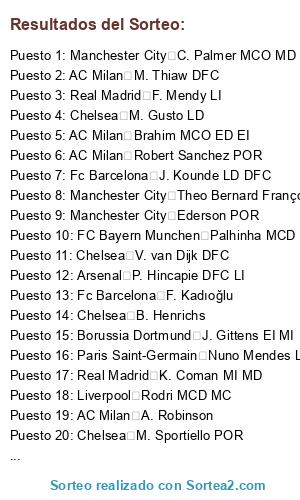 Lista de participantes: Real Madrid E. Haaland DC, Liverpool Rodri MCD MC, Roma M. Salah, Real Madrid J. Bellingham MCO MC, Real Madrid Vini Jr. EI DC, FC Bayern Munchen K. Mbappe DC EI, FC Bayern Munchen H. Kane DC, Manchester City K. De Bruyne MC MCO, Bayer 04 Leverkusen F. Wirtz MCO, Chelsea L. Martinez DC, Real Madrid T. Courtois POR, Chelsea V. van Dijk DFC, Manchester United R. Lewandowski DC, Fc Barcelona M. ter Stegen POR, Liverpool Alisson POR, Real Madrid F. Valverde MC MD, Manchester City C. Palmer MCO MD, Bayer 04 Leverkusen A. Rüdiger DFC, Arsenal B. Saka ED MD, Arsenal M. Ødegaard MC, Manchester City P. Foden ED EI MCO, Paris Saint-Germain W. Saliba DFC, FC Bayern Munchen D. Rice, Manchester City Ruben Dias DFC, Manchester City Theo Bernard François Hernandez, Paris Saint-Germain G. Donnarumma POR, Paris Saint-Germain Marquinhos DFC, Arsenal Gabriel DFC, Paris Saint-Germain N. Barella MC MCD, Fc Barcelona J. Musiala MCO MI MC, Real Madrid J. Tah DFC, Manchester City Ederson POR, AC Milan M. Maignan POR, FC Bayern Munchen J. Kimmich MCD LD, Chelsea V. Osimhen, Real Madrid Rodrygo ED DC, Fc Barcelona Pedri MC EI, Manchester City A. Isak, Fc Barcelona J. Kounde LD DFC, Fc Barcelona F. de Jong MC MCD, Liverpool A. Mac Allister MC MCD, Liverpool T. Alexander-Arnold LD, Manchester City Bernardo Silva MC ED, Arsenal Bremer DFC, Borussia Dortmund G. Kobel POR, Borussia Dortmund L. Modric MC MCO MCD, Borussia Dortmund Bruno Fernandes MCO EI MC, Manchester City Heung-Min Son, Bayer 04 Leverkusen Grimaldo MI LI, AC Milan P. Dybala MCO DC, Real Madrid Carvajal LD, Sevilla FC K. Benzema, Paris Saint-Germain O. Dembele ED MCO, Fc Barcelona Raphinha ED EI MD, AC Milan K. Kvaratskhelia, Paris Saint-Germain Vitinha MC MCD, Fc Barcelona R. Araujo DFC LD, Real Madrid A. Tchouameni MCD MC DFC, Chelsea M. Caicedo MCD, Real Madrid eder Militao DFC, Roma L. Openda, Paris Saint-Germain A. Hakimi LD, Borussia Dortmund N. Schlotterbeck DFC, Arsenal Bruno Guimaraes, Liverpool Dani Olmo, Bayer 04 Leverkusen Diogo Jota DC EI, Liverpool L. Diaz MI EI, Liverpool Rafael Leao EI MI DC, Arsenal Joao Cancelo, Arsenal David Raya POR, Chelsea G. Mamardashvili, FC Bayern Munchen Palhinha MCD MC, Real Madrid D. Alaba DFC LI, AC Milan Cristiano Ronaldo, Borussia Dortmund N. Kanté, Borussia Dortmund R. Mahrez, FC Bayern Munchen M. Neuer POR, Bayer 04 Leverkusen S. Tonali, Real Madrid J. Frimpong, FC Bayern Munchen M. Olise MD ED, Manchester City J. Gvardiol LI DFC, FC Bayern Munchen L. Sane MD MI ED, Bayer 04 Leverkusen E. Palacios MC MCD, Liverpool I. Konate DFC, AC Milan C. Pulisic ED MD EI, Paris Saint-Germain A. Lookman, Arsenal B. White LD, Paris Saint-Germain M. Thuram DC, Arsenal Mikel Merino MC MCO, Manchester City M. Akanji DFC, Manchester City N. Ake DFC LI, AC Milan S. Guirassy DC, Paris Saint-Germain J. Brandt MCO MD MC, Manchester City J. Stones DFC MCD LD, Real Madrid K. Coman MI MD, Manchester United A. Onana POR, Manchester City İ. Gündoğan MC MCD, Roma M. Hummels DFC, Liverpool F. Acerbi DFC, Sevilla FC Iago Aspas, FC BARCELONA D. Kulusevski, Chelsea X. Simons, Borussia Dortmund Pedro Gonçalves, Fc Barcelona Lamine Yamal ED EI, Real Madrid E. Camavinga MC MCD LI, Roma C. Nkunku MCO DC, Paris Saint-Germain Nuno Mendes LI, Liverpool C. Gakpo MI EI DC, Bayer 04 Leverkusen Pedro Porro, AC Milan T. Reijnders MC MCD MCO, Fc Barcelona B. Kamara MCD MC, FC Bayern Munchen A. Davies LI MI, Manchester United M. de Ligt DFC, FC BARCELONA Marc Cucurella LI, AC Milan A. Christensen DFC MCD, Arsenal A. Dovbyk DC, Bayer 04 Leverkusen T. Koopmeiners MC MCO, FC Bayern Munchen D. Upamecano DFC, Manchester United L. Martinez DFC, Real Madrid R. De Paul MC MCD, Bayer 04 Leverkusen Aleix Garcia MC MCD, Arsenal L. Trossard EI DC, FC Bayern Munchen K. Laimer LD MCD MC, Real Madrid F. Mendy LI, Manchester City M. Kovačic MC MCD, FC Bayern Munchen Kim Min Jae DFC, Bayer 04 Leverkusen P. Schick DC, Manchester United L. Torreira, FC Bayern Munchen F. Chiesa MD MI DC, Chelsea K. Koulibaly, Borussia Dortmund M. Sabitzer MC MCO MCD, Liverpool A. Robertson LI, Borussia Dortmund G. Di Lorenzo LD DFC, Roma G. Mancini DFC, Bayer 04 Leverkusen R. Andrich MCD MC DFC, Arsenal T. Partey MCD MC LD, Bayer 04 Leverkusen L. Hradecký POR, Bayer 04 Leverkusen A. Gordon, Liverpool M. van de Ven, Arsenal Sancet, Arsenal M. Diaby, Borussia Dortmund Y. En-Nesyri, Manchester City M. Zaccagni, Fc Barcelona Savinho EI ED, Paris Saint-Germain B. Barcola EI ED, Fc Barcelona Balde LI LD MI, AC Milan Brahim MCO ED EI, Chelsea E. Fernandez MC MCD, Fc Barcelona J. David, Liverpool R. Gravenberch MCD MC, Borussia Dortmund D. Udogie, Arsenal Gabriel Martinelli EI MI, Manchester United D. Nuñez DC, Arsenal P. Hincapie DFC LI, Chelsea R. James LD, Manchester United Diogo Dalot LI LD, Real Madrid A. Correa DC MD, AC Milan F. Tomori DFC, Sevilla FC L. Pellegrini MCO MC, Bayer 04 Leverkusen E. Tapsoba DFC, AC Milan J. Grealish EI MI, Manchester City K. Walker LD, Roma S. Gnabry MD MI DC, FC Bayern Munchen L. Goretzka MC MCD, Borussia Dortmund D. Zapata, Sevilla FC Iñigo Martinez DFC, Sevilla FC K. Mitoma, AC Milan A. Robinson, Liverpool B. Mbeumo, Paris Saint-Germain Joao Neves MC MCD, Sevilla FC D. Frattesi MC MCO, Fc Barcelona F. Kadıoğlu, Paris Saint-Germain R. Kolo Muani DC, Liverpool D. Szoboszlai MCO MC, Chelsea Joao Felix MCO MI DC, Real Madrid A. Lunin POR, Manchester United A. Saint-Maximin, Sevilla FC R. Loftus-Cheek MC MCO, AC Milan Y. Fofana MCD MC, Manchester United N. Mazraoui LD LI, Manchester United Casemiro MCD MC, Arsenal Gabriel Jesus DC, Borussia Dortmund W. Anton DFC, Borussia Dortmund N. Süle DFC LD, Chelsea B. Henrichs, FC BARCELONA Jorginho MCD MC, Manchester City S. Ortega POR, Paris Saint-Germain D. Malen, Roma F. Kessié, Manchester City W. Zaïre-Emery MC MCD, Real Madrid J. Doku EI ED, Chelsea M. Gusto LD, Paris Saint-Germain W. Pacho DFC, Liverpool C. Jones MC MCO MCD, Roma J. Timber LD LI DFC, Borussia Dortmund F. N