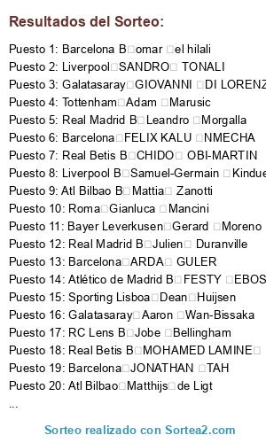 Lista de participantes: Barcelona Noah Darvich, Barcelona JONATHAN TAH, Barcelona Rafael Leao, Barcelona Marcos (MARQUINHOS) Aoás Corrêa, Barcelona MOISE BIOTY KEAN, Barcelona ARDA GULER, Barcelona JAN VIRGILI, Barcelona ANTONEE ROBINSON, Barcelona JOAO CANCELO, Barcelona Martin Odegaard, Barcelona Khvicha Kvaratskhelia, Barcelona Cole Palmer, Barcelona Ferdi Erenay Kadıoğlu, Barcelona JUNIOR LUKEBA, Barcelona UNAI SIMON, Barcelona YASER ASPRILLA MARTINEZ, Barcelona ALEXANDER ISSAK, Barcelona ALEX REMIRO, Barcelona FELIX KALU NMECHA, Barcelona NICOLO ROVELLA, Barcelona JOAO FELIX, Barcelona Jules Kounde, Barcelona MARIO GILA FUENTES, Barcelona Ibraima Konate, Barcelona LANDRY CEPHAS FARRE MIRO, Barcelona B Marc Bernal, Barcelona B DIVIN MUBAMA, Barcelona B MIKAYIL FAYE, Barcelona B FRANCESCO CAMARDA, Barcelona B TYRIQUE GEORGE, Barcelona B MARC CASADO, Barcelona B Nnamdi Collins, Barcelona B Bryan Okoh, Barcelona B JULIAN HETTWER, Barcelona B PAU VICTOR, Barcelona B Héctor Fort García, Barcelona B KENAN YILDIZ, Barcelona B omar el hilali, Barcelona B PABLO TORRE, Barcelona B JAHMAI SIMPSON-PUSEY, Barcelona B GERARD MARTIN, Barcelona B NICO O´REILLY, Barcelona B MAXIMO PERRONE, Barcelona B RENATO MARIN, Barcelona B Fran González, Barcelona B Arnau Tenas, Atlético de Madrid Lutsharel Geertruida, Atlético de Madrid João Pedro Gonçalves Neves, Atlético de Madrid Tyronne Ebuehi, Atlético de Madrid Vítor (VITINHA) Machado Ferreira, Atlético de Madrid Lukas Hrádecky, Atlético de Madrid KARIM ADEYEMI, Atlético de Madrid Marcus Rashford, Atlético de Madrid Thierry Correia, Atlético de Madrid kevin danso, Atlético de Madrid JULIAN ALVAREZ, Atlético de Madrid Ousmane Dembele, Atlético de Madrid WARREM ZAÏRE EMERY, Atlético de Madrid WILFRIED STEPHANE SINGO, Atlético de Madrid ALEJANDRO Baena Rodríguez, Atlético de Madrid MOHAMED KUDUS, Atlético de Madrid KONSTANTINOS KOULIERAKIS, Atlético de Madrid JOHAN MOJICA, Atlético de Madrid ALEJANDRO GARNACHO, Atlético de Madrid Gregor Kobel, Atlético de Madrid GIORGIO SCALVINI, Atlético de Madrid FRANCISCO CONCEICAO, Atlético de Madrid MAX DOWMAN, Atlético de Madrid Marcos Llorente, Atlético de Madrid B James Beadle, Atlético de Madrid B Devyne Rensch, Atlético de Madrid B MIKA GODTS, Atlético de Madrid B Tiago Morais, Atlético de Madrid B Leopold Querfeld, Atlético de Madrid B Kian Fitz-Jim, Atlético de Madrid B Elias Jelert Kristensen, Atlético de Madrid B Ernest Poku, Atlético de Madrid B FABIO MIRETTI, Atlético de Madrid B carlos forbs, Atlético de Madrid B FESTY EBOSELE, Atlético de Madrid B ROGER FERNANDES, Atlético de Madrid B RENATO DE PALMA VEIGA, Atlético de Madrid B maarten vandevoordt, Atlético de Madrid B YANKUBA MINTEH, Atlético de Madrid B LUCA WARRICK KOLEOSHO, Atlético de Madrid B Tygo Land, Atlético de Madrid B Alejandro Francés, Atlético de Madrid B KRISTIAN HLYNSSON, Atlético de Madrid B MATEUS FERNANDES, Atlético de Madrid B FORSON AMANKWAH, Atlético de Madrid B Valentin Atangana Edoa, Atlético de Madrid B Konstantinos Karetsas, Atlético de Madrid B youssoufa moukoko, Bayer Leverkusen Kerian Trippier, Bayer Leverkusen Yuossef En-Nesiry, Bayer Leverkusen Michael Olise, Bayer Leverkusen Cristian Romero, Bayer Leverkusen Marcos Acuña, Bayer Leverkusen David Hancko, Bayer Leverkusen Manuel Akanji, Bayer Leverkusen Davide Frattesi, Bayer Leverkusen Gerard Moreno, Bayer Leverkusen Israel Reyes, Bayer Leverkusen Hugo Lloris, Bayer Leverkusen Pedro Goncalvez, Bayer Leverkusen Damian Emiliano Martínez, Bayer Leverkusen Ciro Immobile, Bayer Leverkusen Orkun Kokcu, Bayer Leverkusen Iago Aspas, Bayer Leverkusen Mattia Zaccagni, Bayer Leverkusen Domenico Berardi, Bayer Leverkusen Federico Dimarco, Bayer Leverkusen Konrad Laimer, Bayer Leverkusen Takefusa Kubo, Galatasaray lucas torreira, Galatasaray Iñaki Williams, Galatasaray Filip Kostic, Galatasaray GEORGES KEVIN NKOUDOU, Galatasaray GIOVANNI DI LORENZO, Galatasaray kevin De Bruyne, Galatasaray MORTEN FRENDRUP, Galatasaray sergiño dest, Galatasaray Joe Gomez, Galatasaray BRIAN BROBBEY, Galatasaray serge david Gnabry, Galatasaray David alaba, Galatasaray Heung-min Son, Galatasaray ANSU FATI, Galatasaray Jérémy Doku, Galatasaray Edon Zhegrova, Galatasaray JAYDEN OOSTERWOLDE, Galatasaray Allan Saint Maximin, Galatasaray Aaron Wan-Bissaka, Galatasaray Gabriel martinelli, Galatasaray Luiz junior, Galatasaray Marc-André TER STEGEN, Galatasaray BRENNAN JOHNSON, Galatasaray Moïse Bombito Lumpungu, Galatasaray Fran garcia, Galatasaray B Ethan Mbappé, Galatasaray B Thiago cruz fernandez, Galatasaray B Samuel Elias Dahl, Galatasaray B Mees Hilgers, Galatasaray B Abdallah Dipo Sima, Galatasaray B Andrew Abiola Omobamidele, Galatasaray B Christopher bonsu baah, Galatasaray B john tolkin, Galatasaray B Rodrigo Jhossel Huescas Hurtado, Galatasaray B Ange-Yoan Bonny, Galatasaray B Sampson Dweh, Galatasaray B liel abada, Galatasaray B Chemsdine Talbi, Galatasaray B Diogo Martins Travassos, Galatasaray B Jonothan Rowe, Galatasaray B Antonín Kinský, Galatasaray B Kaio cesar andrade lima, Galatasaray B Enzo Gianni Tchato Mbiayi, Galatasaray B Matthieu luka epolo, Roma Oliver Baumann, Roma Stefan Ortega Moreno, Roma Stefan Posch, Roma Carlos Álvarez, Roma Gianluca Mancini, Roma Jon Martín, Roma ANTOINE GRIEZMANN, Roma Jose Luís (Pepelu) García Vayá, Roma Denis Athanase Bouanga, Roma Jon Tollar Moncayola, Roma Henrikh Mkhitaryan, Roma Roger Ibañez, Roma Rayan Cherki, Roma Yuri Izeta Berchiche, Roma Adrián Liso Lahoz, Roma Karim Benzema, Roma ANTONIO JOAO TAVARES SILVA, Roma Chidera Ejuke, Roma Diogo Jota, Roma Thomas partey, Roma Javier Galán Gil, Roma Isaac "Isi" Palazón Camacho, Roma Pablo Maffeo, RC Lens Maximiliam Beier, RC Lens Adam Arvelo, RC Lens Joan García Pons, RC Lens Isamel Bennacer, RC Lens Pedro (pedri) Gonzales, RC Lens WOJCIECH TOMASZ SZCZESNY, RC Lens Amara Diouf, RC Lens DENIS ZAKARIA, RC Lens Temitayo Olufisayo Olaolu