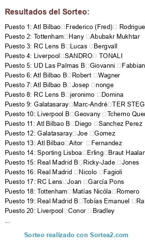 Lista de participantes: Barcelona Noah Darvich, Barcelona JONATHAN TAH, Barcelona Rafael Leao, Barcelona Marcos (MARQUINHOS) Aoás Corrêa, Barcelona MOISE BIOTY KEAN, Barcelona ARDA GULER, Barcelona JAN VIRGILI, Barcelona ANTONEE ROBINSON, Barcelona JOAO CANCELO, Barcelona Martin Odegaard, Barcelona Khvicha Kvaratskhelia, Barcelona Cole Palmer, Barcelona Ferdi Erenay Kadıoğlu, Barcelona JUNIOR LUKEBA, Barcelona UNAI SIMON, Barcelona YASER ASPRILLA MARTINEZ, Barcelona ALEXANDER ISSAK, Barcelona ALEX REMIRO, Barcelona FELIX KALU NMECHA, Barcelona NICOLO ROVELLA, Barcelona JOAO FELIX, Barcelona Jules Kounde, Barcelona MARIO GILA FUENTES, Barcelona Ibraima Konate, Barcelona LANDRY CEPHAS FARRE MIRO, Barcelona B Marc Bernal, Barcelona B DIVIN MUBAMA, Barcelona B MIKAYIL FAYE, Barcelona B FRANCESCO CAMARDA, Barcelona B TYRIQUE GEORGE, Barcelona B MARC CASADO, Barcelona B Nnamdi Collins, Barcelona B Bryan Okoh, Barcelona B JULIAN HETTWER, Barcelona B PAU VICTOR, Barcelona B Héctor Fort García, Barcelona B KENAN YILDIZ, Barcelona B omar el hilali, Barcelona B PABLO TORRE, Barcelona B JAHMAI SIMPSON-PUSEY, Barcelona B GERARD MARTIN, Barcelona B NICO O´REILLY, Barcelona B MAXIMO PERRONE, Barcelona B RENATO MARIN, Barcelona B Fran González, Barcelona B Arnau Tenas, Atlético de Madrid Lutsharel Geertruida, Atlético de Madrid João Pedro Gonçalves Neves, Atlético de Madrid Tyronne Ebuehi, Atlético de Madrid Vítor (VITINHA) Machado Ferreira, Atlético de Madrid Lukas Hrádecky, Atlético de Madrid KARIM ADEYEMI, Atlético de Madrid Marcus Rashford, Atlético de Madrid Thierry Correia, Atlético de Madrid kevin danso, Atlético de Madrid JULIAN ALVAREZ, Atlético de Madrid Ousmane Dembele, Atlético de Madrid WARREM ZAÏRE EMERY, Atlético de Madrid WILFRIED STEPHANE SINGO, Atlético de Madrid ALEJANDRO Baena Rodríguez, Atlético de Madrid MOHAMED KUDUS, Atlético de Madrid KONSTANTINOS KOULIERAKIS, Atlético de Madrid JOHAN MOJICA, Atlético de Madrid ALEJANDRO GARNACHO, Atlético de Madrid Gregor Kobel, Atlético de Madrid GIORGIO SCALVINI, Atlético de Madrid FRANCISCO CONCEICAO, Atlético de Madrid MAX DOWMAN, Atlético de Madrid Marcos Llorente, Atlético de Madrid B James Beadle, Atlético de Madrid B Devyne Rensch, Atlético de Madrid B MIKA GODTS, Atlético de Madrid B Tiago Morais, Atlético de Madrid B Leopold Querfeld, Atlético de Madrid B Kian Fitz-Jim, Atlético de Madrid B Elias Jelert Kristensen, Atlético de Madrid B Ernest Poku, Atlético de Madrid B FABIO MIRETTI, Atlético de Madrid B carlos forbs, Atlético de Madrid B FESTY EBOSELE, Atlético de Madrid B ROGER FERNANDES, Atlético de Madrid B RENATO DE PALMA VEIGA, Atlético de Madrid B maarten vandevoordt, Atlético de Madrid B YANKUBA MINTEH, Atlético de Madrid B LUCA WARRICK KOLEOSHO, Atlético de Madrid B Tygo Land, Atlético de Madrid B Alejandro Francés, Atlético de Madrid B KRISTIAN HLYNSSON, Atlético de Madrid B MATEUS FERNANDES, Atlético de Madrid B FORSON AMANKWAH, Atlético de Madrid B Valentin Atangana Edoa, Atlético de Madrid B Konstantinos Karetsas, Atlético de Madrid B youssoufa moukoko, Bayer Leverkusen Kerian Trippier, Bayer Leverkusen Yuossef En-Nesiry, Bayer Leverkusen Michael Olise, Bayer Leverkusen Cristian Romero, Bayer Leverkusen Marcos Acuña, Bayer Leverkusen David Hancko, Bayer Leverkusen Manuel Akanji, Bayer Leverkusen Davide Frattesi, Bayer Leverkusen Gerard Moreno, Bayer Leverkusen Israel Reyes, Bayer Leverkusen Hugo Lloris, Bayer Leverkusen Pedro Goncalvez, Bayer Leverkusen Damian Emiliano Martínez, Bayer Leverkusen Ciro Immobile, Bayer Leverkusen Orkun Kokcu, Bayer Leverkusen Iago Aspas, Bayer Leverkusen Mattia Zaccagni, Bayer Leverkusen Domenico Berardi, Bayer Leverkusen Federico Dimarco, Bayer Leverkusen Konrad Laimer, Bayer Leverkusen Takefusa Kubo, Galatasaray lucas torreira, Galatasaray Iñaki Williams, Galatasaray Filip Kostic, Galatasaray GEORGES KEVIN NKOUDOU, Galatasaray GIOVANNI DI LORENZO, Galatasaray kevin De Bruyne, Galatasaray MORTEN FRENDRUP, Galatasaray sergiño dest, Galatasaray Joe Gomez, Galatasaray BRIAN BROBBEY, Galatasaray serge david Gnabry, Galatasaray David alaba, Galatasaray Heung-min Son, Galatasaray ANSU FATI, Galatasaray Jérémy Doku, Galatasaray Edon Zhegrova, Galatasaray JAYDEN OOSTERWOLDE, Galatasaray Allan Saint Maximin, Galatasaray Aaron Wan-Bissaka, Galatasaray Gabriel martinelli, Galatasaray Luiz junior, Galatasaray Marc-André TER STEGEN, Galatasaray BRENNAN JOHNSON, Galatasaray Moïse Bombito Lumpungu, Galatasaray Fran garcia, Galatasaray B Ethan Mbappé, Galatasaray B Thiago cruz fernandez, Galatasaray B Samuel Elias Dahl, Galatasaray B Mees Hilgers, Galatasaray B Abdallah Dipo Sima, Galatasaray B Andrew Abiola Omobamidele, Galatasaray B Christopher bonsu baah, Galatasaray B john tolkin, Galatasaray B Rodrigo Jhossel Huescas Hurtado, Galatasaray B Ange-Yoan Bonny, Galatasaray B Sampson Dweh, Galatasaray B liel abada, Galatasaray B Chemsdine Talbi, Galatasaray B Diogo Martins Travassos, Galatasaray B Jonothan Rowe, Galatasaray B Antonín Kinský, Galatasaray B Kaio cesar andrade lima, Galatasaray B Enzo Gianni Tchato Mbiayi, Galatasaray B Matthieu luka epolo, Roma Oliver Baumann, Roma Stefan Ortega Moreno, Roma Stefan Posch, Roma Carlos Álvarez, Roma Gianluca Mancini, Roma Jon Martín, Roma ANTOINE GRIEZMANN, Roma Jose Luís (Pepelu) García Vayá, Roma Denis Athanase Bouanga, Roma Jon Tollar Moncayola, Roma Henrikh Mkhitaryan, Roma Roger Ibañez, Roma Rayan Cherki, Roma Yuri Izeta Berchiche, Roma Adrián Liso Lahoz, Roma Karim Benzema, Roma ANTONIO JOAO TAVARES SILVA, Roma Chidera Ejuke, Roma Diogo Jota, Roma Thomas partey, Roma Javier Galán Gil, Roma Isaac "Isi" Palazón Camacho, Roma Pablo Maffeo, RC Lens Maximiliam Beier, RC Lens Adam Arvelo, RC Lens Joan García Pons, RC Lens Isamel Bennacer, RC Lens Pedro (pedri) Gonzales, RC Lens WOJCIECH TOMASZ SZCZESNY, RC Lens Amara Diouf, RC Lens DENIS ZAKARIA, RC Lens Temitayo Olufisayo Olaolu