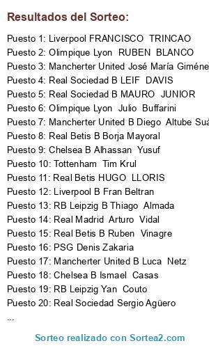 Lista de participantes: Chelsea Miguel Moyá, Chelsea Joao Moutinho, Chelsea Fabian Castillo, Chelsea Dimitri Payet, Chelsea Matthias Ginter, Chelsea Zlatko Junuzovic, Chelsea Idrissa Gueye, Chelsea Antonio Latorre, Chelsea Alex Oxlade-Chamberlain, Chelsea Ron-Robert Zieler, Chelsea Rubén Sobrino, Chelsea Miranda, Chelsea Bernd Leno, Chelsea Arthur Masuaku, Chelsea Ander Capa, Chelsea Martín Montoya, Chelsea Cristian Portugués, Chelsea Quincy Promes, Chelsea Marcel Sabitzer, Chelsea Georgiy Dzhikiya Dzhikiya, Chelsea Jason Denayer, Chelsea Henry Onyekuru, Chelsea Wissam Ben Yedder, Chelsea B Brenden Aaronson, Chelsea B Tomas Tavarés, Chelsea B Marcel Ruiz, Chelsea B Lutsharel Geertruida, Chelsea B Khephren Thuram, Chelsea B Yacine Adli, Chelsea B Joelson Fernandes, Chelsea B Angel Fortuño, Chelsea B Filip Jorgensen, Chelsea B Marley Ake, Chelsea B Alhassan Yusuf, Chelsea B guilherme pato, Chelsea B Nathan Ferguson, Chelsea B Iker losada, Chelsea B Ismael Casas, Chelsea B Jonathan Panzo, Chelsea B Michael Olise, Chelsea B Odilon Kossounou, Chelsea B Emin Bayram, Chelsea B Kevin Boma, Inter Gabriel Jesus, Inter Cristiano Ronaldo, Inter Youfef Atal, Inter Lukas Klostermann, Inter Yannick Ferreira Carrasco, Inter Leon Goretzka, Inter Leon Bailey, Inter Lukas Hradecky, Inter Junior Firpo, Inter Luis Diaz, Inter Martin Ödegaard, Inter Donyell Malen, Inter Kyle Walker, Inter Serge Gnabry, Inter Ferland Mendy, Inter Lucas Torreira, Inter Mario Hermoso, Inter Alban Lafont, Inter Manuel Akanji, Atlético de Madrid Allan Saint-Maximim, Atlético de Madrid Renato Sanches, Atlético de Madrid Tyronne Ebuehi, Atlético de Madrid Mikel Oyarzabal, Atlético de Madrid JAMES RODRIGUEZ, Atlético de Madrid Tyler Adams, Atlético de Madrid Ángel Martín Correa, Atlético de Madrid Bruno Fernandes, Atlético de Madrid Tomas Lemar, Atlético de Madrid ALESSANDRO FLORENZI, Atlético de Madrid Gerard Deulofeu, Atlético de Madrid Saul Ñiguez, Atlético de Madrid Sergio Ramos, Atlético de Madrid Anthony Martial, Atlético de Madrid Clement Lenglet, Atlético de Madrid Adrien Rabiot, Atlético de Madrid RAPHAEL GUERREIRO, Atlético de Madrid Marcus Rashford, Atlético de Madrid Thibaut Courtois, Atlético de Madrid Kevin Trapp, Atlético de Madrid Yves Bissouma, Atlético de Madrid Sergio Reguilón, Atlético de Madrid Ansu Fati, Atlético de Madrid B luis sinisterra, Atlético de Madrid B Emile Smith Rowe, Atlético de Madrid B Pedro De la Vega, Atlético de Madrid B Sekou koita, Atlético de Madrid B maarten vandevoordt, Atlético de Madrid B Ronaldo Vieira, Atlético de Madrid B Sergio Camello, Atlético de Madrid B Mitchell van Bergen, Atlético de Madrid B Christian Früchtl, Atlético de Madrid B Blas Riveros, Atlético de Madrid B Charles De Ketelaere, Atlético de Madrid B Kristoffer Ajer, Atlético de Madrid B Iñigo Córdoba, Atlético de Madrid B Marcus Tavernier, Atlético de Madrid B Timothy Weah, Atlético de Madrid B Perr Schuurs, Atlético de Madrid B Victor Mollejo, Atlético de Madrid B Yann Karamoh, Atlético de Madrid B Bruno Xadas, Atlético de Madrid B mohammed kudus, Atlético de Madrid B Jonathan Amon, Atlético de Madrid B chris richards, Atlético de Madrid B Devyne Rensch, Atlético de Madrid B morgan gibbs-white, Atletico de Madrid B Jeremy Doku, Bayer Leverkusen Everton Soares, Bayer Leverkusen Josip Illicic, Bayer Leverkusen Alexander Kolarov, Bayer Leverkusen Djene Dakoman, Bayer Leverkusen Marcos Acuña, Bayer Leverkusen Federico (Fred) Rodrguez, Bayer Leverkusen Radja Nainggolan, Bayer Leverkusen Ever Banega, Bayer Leverkusen Charles Aranguiz, Bayer Leverkusen Jesus Corona, Bayer Leverkusen Samir Handanovic, Bayer Leverkusen Antonio Adan, Bayer Leverkusen Íker Muniain, Bayer Leverkusen Hector Herrera, Bayer Leverkusen Oscar do Santos, Bayer Leverkusen Iago Aspas, Bayer Leverkusen Ciro Immobile, Bayer Leverkusen Pizzi, Real Sociedad IVAN RAKITIC, Real Sociedad Dominik livakovic, Real Sociedad Filip Kostic, Real Sociedad Fran Echeampong, Real Sociedad Sergi Aurier, Real Sociedad MARC CUCURELLA, Real Sociedad Alex Teixeira, Real Sociedad LUIS SUAREZ, Real Sociedad ANGEL DI MARIA, Real Sociedad Marco Reus, Real Sociedad Yan Sommer, Real Sociedad Moussa Diaby, Real Sociedad Samuel Umtiti, Real Sociedad Kevin Mbabu, Real Sociedad JORDAN LUKAKU, Real Sociedad Falaye Sacko, Real Sociedad Frank Fabra, Real Sociedad Aaron Wan-Bissaka, Real Sociedad Ederson Santana de Moraes, Real Sociedad Stephan El Shaarawy, Real Sociedad JEREMIAH ST.JUSTE, Real Sociedad Sergio Agüero, Real Sociedad FRANK ONYEKA, Real Sociedad NICOLAS DE LA CRUZ ARCOSA, Real Sociedad CHIDERA EJUKE, Real Sociedad B Markus Schubert, Real Sociedad B Gaëtan Poussin, Real Sociedad B Reece James, Real Sociedad B Lloyd Kelly, Real Sociedad B NAHUEL BUSTOS, Real Sociedad B MAURO JUNIOR, Real Sociedad B Ezri Konsa, Real Sociedad B Uros Racic, Real Sociedad B Orji Okwonkwo, Real Sociedad B Kevin Ruegg, Real Sociedad B Moussa Wagué, Real Sociedad B DANIEL MALDINI, Real Sociedad B Crysencio SUMMERVILLE, Real Sociedad B IGNACIO ALISEDA, Real Sociedad B Luther Singh, Real Sociedad B Samuel Chukwueze, Real Sociedad B KONRAD DE LA FUENTE, Real Sociedad B GEORGIY TSITAISHVILI, Real Sociedad B CHISTIAN CONTEH, Real Sociedad B FERNANDO DOS SANTOS, Real Sociedad B ARVIN APPIAH, Real Sociedad B LEIF DAVIS, Real Sociedad B TYLER MAGLOIRE, B.Dortmund Romelu Lukaku, B.Dortmund Matt Hummels, B.Dortmund Kylian Mbappe Lottin, B.Dortmund Alexander Isak, B.Dortmund Daniel Carvajal, B.Dortmund Jiri Pavlenka, B.Dortmund Pau Torres, B.Dortmund Santi Cazorla, B.Dortmund Mario Gotze, B.Dortmund Axel Witsel, B.Dortmund Marek Hamsik, B.Dortmund Buffon, B.Dortmund Frank Ribery, B.Dortmund Hirving Lozano, B.Dortmund Luca Modric, B.Dortmund Karim Bellarabi, B.Dortmund Marquinhos, B.Dortmund Zlatan Ibrahimovic, B.Dortmund Yuri Berchiche, B.Dortmund Phil Foden, B.Dortmund Sofyan Amrabat, B.Dortmund B Sergio Gomez, B.Dortmund B Sofiane Diop, B.Dortmun