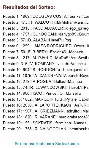 Lista de participantes: 20 ROBERTO FIRMINO o0 Sergi 0o Everton, 33 A. SCHURRLE perikinho90 Cordoba, 41 M. NEUER KaOs I AsTuR Oviedo, 43 J. BOATENG javitr Manchester City, 45 P. LAHM tabascos89 Barcelona, 48 A. ROBBEN Nandobel Real Madrid, 49 T. MULLER Maybecohen Zaragoza, 50 F. RIBERY Ergion46 Monaco, 57 D. ALABA Havel7 Psg, 62 M. HUMMELS Sr Despiste Toronto, 66 M. GOTZE P3drito Sion, 74 R. LEWANDOWSKI Havel7 Psg, 79 M. REUS misterserpico West Ham, 81 R. PEREYRA danygp89 Bournomenth, 90 K. BELLARABI Alex1493 Napoles, 155 SOKRATIS ferminnn Nantes, 156 NALDO merayombasogo Ponferradina, 244 P. CECH pepitogrillo86 Ath. Bilbao, 252 D. STURRIDGE MrMohamRam Liverpool, 254 MATA sergiotabascos89 Manchester United, 256 DAVID LUIZ misterserpico West Ham, 264 R. LUKAKU Die1234 Oporto, 279 P. POGBA Balles Malmoe, 305 L. SUAREZ Xsamu Benfica, 316 V. KOMPANY victub Valencia, 319 Y. TOURE alead71 Tottenham, 321 DAVID SILVA Saavexbox Las Palmas, 323 S. AGÜERO adrylito Malaga, 324 C. TEVEZ diego_gallego Orlando City, 334 Y. KONOPLYANKA Nandobel Real Madrid, 337 DE GEA merayombasogo Ponferradina, 346 W. ROONEY Ergion46 Monaco, 347 J. HERNANDEZ**** Tagho Hamburgo, 378 A. TAARABT trompexbox360 Chicago Fire, 414 L. MODRIC javitr Manchester City, 415 G. BALE adrylito Malaga, 433 C. BEAUVUE AaronRJ24 Juventus, 471 A. RAMSEY alemalaga94 Bayern Munich, 473 T. WALCOTT MrMohamRam Liverpool, 474 R. VAN PERSIE Juanin77 Depor, 477 L. KOSCIELNY MrMohamRam Liverpool, 478 J. WILSHERE alemalaga94 Bayern Munich, 496 A. MARTIAL TheForceMaker Alcorcon, 584 OSCAR trompexbox360 Chicago Fire, 604 NEYMAR Danibke New York City, 609 LUCAS Havel7 Psg, 635 S. DOUMBIA Saavexbox Las Palmas, 727 E. HAZARD merayombasogo Ponferradina, 741 L. REMY Adriantr127 Atco. Madrid, 754 H. LLORIS trompexbox360 Chicago Fire, 775 J. PASTORE o0 Sergi 0o Everton, 778 S. SIRIGU ADONERI4 Alaves, 832 MUNIAIN toni1708 Celta, 844 FALCAO ADONERI4 Alaves, 845 A. TURAN Die1234 Oporto, 846 D. GODIN tabascos89 Barcelona, 853 DIEGO COSTA StormFury elche, 861 PIQUE SpiffiestJose Ol. Lyon, 863 SERGIO BUSQUETS StormFury elche, 865 CESC FABREGAS Ozora10Tsubasa Boca Juniors, 866 INIESTA Rosino85 Arsenal, 867 L. MESSI FonFenoso Ath. Bilbao, 871 A. SANCHEZ joselitorojas1 Wolsfburgo, 872 THIAGO MrMohamRam Liverpool, 873 PEDRO Ronald Villarreal, 900 SANTI CAZORLA AndrewTorres Real Sociedad, 904 S. RONDON x chachiquesi x Betis, 906 ISCO Prince Ol. Marsella, 930 SERGIO RAMOS JG97 Schalke 04, 933 MARCELO Adriantr127 Atco. Madrid, 934 XABI ALONSO alead71 Tottenham, 936 A. DI MARIA AaronRJ24 Juventus, 937 C. RONALDO StormFury elche, 938 M. OZIL MaDaScAs Sevilla, 939 K. BENZEMA javitr Manchester City, 943 G. HIGUAIN sergiotabascos89 Manchester United, 948 JOSE CALLEJON StormFury elche, 979 I. RAKITIC Xsamu Benfica, 999 JORDI ALBA sergiotabascos89 Manchester United, 1028 THIAGO SILVA Juanin77 Depor, 1035 Z. IBRAHIMOVIC Pyra el Capo Angeles Galaxy, 1075 A. CANDREVA Albervil Rayo Vallecano, 1118 W. SNEIJDER Adriantr127 Atco. Madrid, 1136 G. CHIELLINI Xsamu Benfica, 1138 A. VIDAL Shaman1987 Red Bulls, 1147 C. MARCHISIO MaDaScAs Sevilla, 1185 CAVANI CometHeaven79 Chelsea, 1217 M. PJANIC MaDaScAs Sevilla, 1251 N. OTAMENDI Prince Ol. Marsella, 1255 HULK x chachiquesi x Betis, 1259 JAMES RODRIGUEZ Ozora10Tsubasa Boca Juniors, 1331 K. DE BRUYNE alexfcbarcelona B. Dortmund, 1426 J. CUADRADO TheForceMaker Alcorcon, 1524 PHILIPPE COUTINHO El Patron Lazio, 1610 N. MATIC CometHeaven79 Chelsea, 1619 P. AUBAMEYANG benniscuba Roma, 1668 D. MERTENS joselitorojas1 Wolsfburgo, 1729 PIRLO sergiotabascos89 Manchester United, 1730 ERIKSEN toni1708 Celta, 1753 KROOS benniscuba Roma, 1755 C. VELA Prince Ol. Marsella, 1756 WITSEL trunks Levante, 1757 GUNDOGAN danygp89 Bournomenth, 1758 R. NAINGGOLAN benniscuba Roma, 1784 T. COURTOIS SpiffiestJose Ol. Lyon, 1797 MATUIDI Ergion46 Monaco, 1803 R. STERLING SrPistolas86 Udinese, 1822 M. VERRATTI HaLiToxGCFx Granada, 1825 C. BENTEKE perikinho90 Cordoba, 1826 R. VARANE sergiotabascos89 Manchester United, 1840 WILLIAN entereed Sounders, 1842 KOKE alemalaga94 Bayern Munich, 1852 MARQUINHOS Pyra el Capo Angeles Galaxy, 1858 B. LENO alead71 Tottenham, 1879 A. ABDENNOUR Ergion46 Monaco, 1888 A. LACAZETTE Pyra el Capo Angeles Galaxy, 1906 A. MORATA entereed Sounders, 1907 A. GRIEZMANN adrylito Malaga, 1933 P. DYBALA HaLiToxGCFx Granada, 1969 DOUGLAS COSTA trunks Levante, 1994 DEPAY entereed Sounders, 2010 C. BACCA Ronald Villarreal, 2015 PACO ALCACER diego_gallego Orlando City, 2017 L. VIETTO entereed Sounders, 2030 A. LAPORTE KaOs I AsTuR Oviedo.
