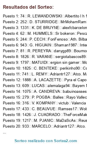 Lista de participantes: 20 ROBERTO FIRMINO o0 Sergi 0o Everton, 33 A. SCHURRLE perikinho90 Cordoba, 41 M. NEUER KaOs I AsTuR Oviedo, 43 J. BOATENG merayombasogo Juventus, 45 P. LAHM tabascos89 Barcelona, 48 A. ROBBEN merayombasogo Juventus, 49 T. MULLER Maybecohen Zaragoza, 50 F. RIBERY ergion sin gamer Monaco, 57 D. ALABA Albertito l h 1 Manchester City, 62 M. HUMMELS Sr bokeron Pescara, 66 M. GOTZE MaDaScAs Reus, 74 R. LEWANDOWSKI Albertito l h 1 Manchester City, 79 M. REUS misterserpico West Ham, 81 R. PEREYRA danygp89 Bournomenth, 90 K. BELLARABI Sergio0004 Cska Moscu, 155 SOKRATIS Ronald Ol. Lyon, 156 NALDO Ramses17 Wolsfburgo, 244 P. CECH FonFenoso Ath. Bilbao, 252 D. STURRIDGE MrMohamRam Liverpool, 254 MATA JuanluMlg Sp. Lisboa, 256 DAVID LUIZ misterserpico West Ham, 264 R. LUKAKU Die1234 Cristal Palace, 279 P. POGBA Balles Rayo Vallecano, 305 L. SUAREZ Xsamu Benfica, 316 V. KOMPANY victub Valencia, 319 Y. TOURE alead71 Tottenham, 321 DAVID SILVA Prince Sp. Lisboa, 323 S. AGÜERO benniscuba Roma, 324 C. TEVEZ Albertito l h 1 Manchester City, 334 Y. KONOPLYANKA Nandobel Tenerife, 337 DE GEA alemalaga94 Bayern Munich, 346 W. ROONEY ergion sin gamer Monaco, 347 J. HERNANDEZ sergiotabascos89 Manchester United, 378 A. TAARABT babuinoassesino Ac Milan, 414 L. MODRIC javitr Leicester, 415 G. BALE adrylito Malaga, 433 C. BEAUVUE Ramses17 Wolsfburgo, 471 A. RAMSEY alemalaga94 Bayern Munich, 473 T. WALCOTT MrMohamRam Liverpool, 474 R. VAN PERSIE borjituss Depor, 477 L. KOSCIELNY MrMohamRam Liverpool, 478 J. WILSHERE alemalaga94 Bayern Munich, 496 A. MARTIAL TheForceMaker Cadiz, 584 OSCAR alemalaga94 Bayern Munich, 604 NEYMAR Xsamu Benfica, 609 LUCAS alemalaga94 Bayern Munich, 635 S. DOUMBIA Saavexbox Las Palmas, 727 E. HAZARD Danibke New York City, 741 L. REMY Adriantr127 Atco. Madrid, 754 H. LLORIS babuinoassesino Ac Milan, 775 J. PASTORE o0 Sergi 0o Everton, 778 S. SIRIGU ADONERI4 Napoles, 832 MUNIAIN toni1708 Celta, 844 FALCAO ADONERI4 Napoles, 845 A. TURAN Die1234 Cristal Palace, 846 D. GODIN Shaman1987 Inter de Milan, 853 DIEGO COSTA StormFury Elche, 861 PIQUE Dark69 Southampton, 863 SERGIO BUSQUETS StormFury Elche, 865 CESC FABREGAS Ozora10Tsubasa Boca Juniors, 866 INIESTA Rosino85 Arsenal, 867 L. MESSI FonFenoso Ath. Bilbao, 871 A. SANCHEZ joselitorojas1 Sassuolo, 872 THIAGO MrMohamRam Liverpool, 873 PEDRO Albervil A. Petrolera, 900 SANTI CAZORLA AndrewTorres UNAM Pumas, 904 S. RONDON x chachiquesi x Betis, 906 ISCO sergiotabascos89 Manchester United, 930 SERGIO RAMOS jg97 sin gamer Schalke 04, 933 MARCELO Adriantr127 Atco. Madrid, 934 XABI ALONSO alead71 Tottenham, 936 A. DI MARIA merayombasogo Juventus, 937 C. RONALDO StormFury Elche, 938 M. OZIL AndrewTorres UNAM Pumas, 939 K. BENZEMA javitr Leicester, 943 G. HIGUAIN Shaman1987 Inter de Milan, 948 JOSE CALLEJON StormFury Elche, 979 I. RAKITIC Danibke New York City, 999 JORDI ALBA sergiotabascos89 Manchester United, 1028 THIAGO SILVA Shaman1987 Inter de Milan, 1035 Z. IBRAHIMOVIC Pyra el Capo Mirandes, 1075 A. CANDREVA babuinoassesino Ac Milan, 1118 W. SNEIJDER sergiotabascos89 Manchester United, 1136 G. CHIELLINI merayombasogo Juventus, 1138 A. VIDAL Shaman1987 Inter de Milan, 1147 C. MARCHISIO MaDaScAs Reus, 1185 CAVANI CometHeaven79 Chelsea, 1217 M. PJANIC MaDaScAs Reus, 1251 N. OTAMENDI JuanluMlg Sp. Lisboa, 1259 JAMES RODRIGUEZ Shaman1987 Inter de Milan, 1331 K. DE BRUYNE alexfcbarcelona B. Dortmund, 1426 J. CUADRADO TheForceMaker Cadiz, 1524 PHILIPPE COUTINHO CharlyFifax B. Leverkusen, 1610 N. MATIC CometHeaven79 Chelsea, 1619 P. AUBAMEYANG adrylito Malaga, 1668 D. MERTENS joselitorojas1 Sassuolo, 1729 PIRLO sergiotabascos89 Manchester United, 1730 ERIKSEN toni1708 Celta, 1753 KROOS Die1234 Cristal Palace, 1755 C. VELA danygp89 Bournomenth, 1756 WITSEL trunks Levante, 1757 GUNDOGAN danygp89 Bournomenth, 1758 R. NAINGGOLAN benniscuba Roma, 1784 T. COURTOIS x5xflaccox5x Besiktas, 1797 MATUIDI ergion sin gamer Monaco, 1803 R. STERLING buijin Celtic, 1822 M. VERRATTI HaLiToxGCFx Granada, 1825 C. BENTEKE perikinho90 Cordoba, 1826 R. VARANE sergiotabascos89 Manchester United, 1840 WILLIAN Nandobel Tenerife, 1842 KOKE Shaman1987 Inter de Milan, 1852 MARQUINHOS Pyra el Capo Mirandes, 1858 B. LENO alead71 Tottenham, 1879 A. ABDENNOUR ergion sin gamer Monaco, 1888 A. LACAZETTE Pyra el Capo Mirandes, 1906 A. MORATA alemalaga94 Bayern Munich, 1907 A. GRIEZMANN adrylito Malaga, 1933 P. DYBALA HaLiToxGCFx Granada, 1969 DOUGLAS COSTA trunks Levante, 1994 DEPAY danygp89 Bournomenth, 2010 C. BACCA buijin Celtic, 2015 PACO ALCACER diego_gallego Lugo, 2017 L. VIETTO II ANTI CULE II Santos, 2030 A. LAPORTE KaOs I AsTuR Oviedo.