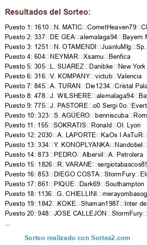 Lista de participantes: 20 ROBERTO FIRMINO JoseAbadCCf Everton, 33 A. SCHURRLE perikinho90 Cordoba, 41 M. NEUER KaOs I AsTuR Oviedo, 43 J. BOATENG merayombasogo Juventus, 45 P. LAHM tabascos89 Barcelona, 48 A. ROBBEN merayombasogo Juventus, 49 T. MULLER Maybecohen Zaragoza, 50 F. RIBERY ergion sin gamer Monaco, 57 D. ALABA Albertito l h 1 Manchester City, 62 M. HUMMELS Sr bokeron Pescara, 66 M. GOTZE MaDaScAs Reus, 74 R. LEWANDOWSKI Albertito l h 1 Manchester City, 79 M. REUS misterserpico West Ham, 81 R. PEREYRA danygp89 Bournomenth, 90 K. BELLARABI Sergio0004 Cska Moscu, 155 SOKRATIS Ronald Ol. Lyon, 156 NALDO Ramses17 Wolsfburgo, 244 P. CECH FonFenoso Ath. Bilbao, 252 D. STURRIDGE MrMohamRam Liverpool, 254 MATA JuanluMlg Sp. Lisboa, 256 DAVID LUIZ misterserpico West Ham, 264 R. LUKAKU Die1234 Cristal Palace, 279 P. POGBA Balles Rayo Vallecano, 305 L. SUAREZ Danibke New York City, 316 V. KOMPANY victub Valencia, 319 Y. TOURE alead71 Tottenham, 321 DAVID SILVA Prince Sp. Lisboa, 323 S. AGÜERO benniscuba Roma, 324 C. TEVEZ Albertito l h 1 Manchester City, 334 Y. KONOPLYANKA Nandobel Tenerife, 337 DE GEA alemalaga94 Bayern Munich, 346 W. ROONEY ergion sin gamer Monaco, 347 J. HERNANDEZ sergiotabascos89 Manchester United, 378 A. TAARABT babuinoassesino Ac Milan, 414 L. MODRIC javitr Leicester, 415 G. BALE adrylito Malaga, 433 C. BEAUVUE Ramses17 Wolsfburgo, 471 A. RAMSEY alemalaga94 Bayern Munich, 473 T. WALCOTT MrMohamRam Liverpool, 474 R. VAN PERSIE borjituss Depor, 477 L. KOSCIELNY MrMohamRam Liverpool, 478 J. WILSHERE alemalaga94 Bayern Munich, 496 A. MARTIAL TheForceMaker Cadiz, 584 OSCAR alemalaga94 Bayern Munich, 604 NEYMAR Xsamu Benfica, 609 LUCAS alemalaga94 Bayern Munich, 635 S. DOUMBIA Saavexbox Las Palmas, 727 E. HAZARD Danibke New York City, 741 L. REMY Adriantr127 Atco. Madrid, 754 H. LLORIS babuinoassesino Ac Milan, 775 J. PASTORE o0 Sergi 0o Everton, 778 S. SIRIGU ADONERI4 Napoles, 832 MUNIAIN toni1708 Celta, 844 FALCAO ADONERI4 Napoles, 845 A. TURAN Die1234 Cristal Palace, 846 D. GODIN Shaman1987 Inter de Milan, 853 DIEGO COSTA StormFury Elche, 861 PIQUE Dark69 Southampton, 863 SERGIO BUSQUETS StormFury Elche, 865 CESC FABREGAS Ozora10Tsubasa Boca Juniors, 866 INIESTA Rosino85 Arsenal, 867 L. MESSI FonFenoso Ath. Bilbao, 871 A. SANCHEZ joselitorojas1 Sassuolo, 872 THIAGO MrMohamRam Liverpool, 873 PEDRO Albervil A. Petrolera, 900 SANTI CAZORLA AndrewTorres UNAM Pumas, 904 S. RONDON x chachiquesi x Betis, 906 ISCO sergiotabascos89 Manchester United, 930 SERGIO RAMOS jg97 sin gamer Schalke 04, 933 MARCELO Adriantr127 Atco. Madrid, 934 XABI ALONSO alead71 Tottenham, 936 A. DI MARIA merayombasogo Juventus, 937 C. RONALDO StormFury Elche, 938 M. OZIL AndrewTorres UNAM Pumas, 939 K. BENZEMA javitr Leicester, 943 G. HIGUAIN Shaman1987 Inter de Milan, 948 JOSE CALLEJON StormFury Elche, 979 I. RAKITIC Danibke New York City, 999 JORDI ALBA sergiotabascos89 Manchester United, 1028 THIAGO SILVA Shaman1987 Inter de Milan, 1035 Z. IBRAHIMOVIC Pyra el Capo Mirandes, 1075 A. CANDREVA babuinoassesino Ac Milan, 1118 W. SNEIJDER sergiotabascos89 Manchester United, 1136 G. CHIELLINI merayombasogo Juventus, 1138 A. VIDAL Shaman1987 Inter de Milan, 1147 C. MARCHISIO MaDaScAs Reus, 1185 CAVANI CometHeaven79 Chelsea, 1217 M. PJANIC MaDaScAs Reus, 1251 N. OTAMENDI JuanluMlg Sp. Lisboa, 1259 JAMES RODRIGUEZ Shaman1987 Inter de Milan, 1331 K. DE BRUYNE alexfcbarcelona B. Dortmund, 1426 J. CUADRADO TheForceMaker Cadiz, 1524 PHILIPPE COUTINHO CharlyFifax B. Leverkusen, 1610 N. MATIC CometHeaven79 Chelsea, 1619 P. AUBAMEYANG adrylito Malaga, 1668 D. MERTENS joselitorojas1 Sassuolo, 1729 PIRLO sergiotabascos89 Manchester United, 1730 ERIKSEN toni1708 Celta, 1753 KROOS Die1234 Cristal Palace, 1755 C. VELA danygp89 Bournomenth, 1756 WITSEL trunks Levante, 1757 GUNDOGAN danygp89 Bournomenth, 1758 R. NAINGGOLAN benniscuba Roma, 1784 T. COURTOIS x5xflaccox5x Besiktas, 1797 MATUIDI ergion sin gamer Monaco, 1803 R. STERLING buijin Celtic, 1822 M. VERRATTI HaLiToxGCFx Granada, 1825 C. BENTEKE perikinho90 Cordoba, 1826 R. VARANE sergiotabascos89 Manchester United, 1840 WILLIAN Nandobel Tenerife, 1842 KOKE Shaman1987 Inter de Milan, 1852 MARQUINHOS Pyra el Capo Mirandes, 1858 B. LENO alead71 Tottenham, 1879 A. ABDENNOUR ergion sin gamer Monaco, 1888 A. LACAZETTE Pyra el Capo Mirandes, 1906 A. MORATA alemalaga94 Bayern Munich, 1907 A. GRIEZMANN adrylito Malaga, 1933 P. DYBALA HaLiToxGCFx Granada, 1969 DOUGLAS COSTA trunks Levante, 1994 DEPAY danygp89 Bournomenth, 2010 C. BACCA buijin Celtic, 2015 PACO ALCACER diego_gallego Lugo, 2017 L. VIETTO II ANTI CULE II Santos, 2030 A. LAPORTE KaOs I AsTuR Oviedo.