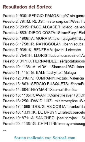 Lista de participantes: 20 ROBERTO FIRMINO JoseAbadCCf Everton, 33 A. SCHURRLE perikinho90 Cordoba, 41 M. NEUER KaOs I AsTuR Oviedo, 43 J. BOATENG merayombasogo Juventus, 45 P. LAHM tabascos89 Barcelona, 48 A. ROBBEN merayombasogo Juventus, 49 T. MULLER Maybecohen Zaragoza, 50 F. RIBERY ergion sin gamer Monaco, 57 D. ALABA Albertito l h 1 Manchester City, 62 M. HUMMELS Sr bokeron Pescara, 66 M. GOTZE MaDaScAs Reus, 74 R. LEWANDOWSKI Albertito l h 1 Manchester City, 79 M. REUS misterserpico West Ham, 81 R. PEREYRA danygp89 Bournomenth, 90 K. BELLARABI Sergio0004 Cska Moscu, 155 SOKRATIS Ronald Ol. Lyon, 156 NALDO Ramses17 Wolsfburgo, 244 P. CECH FonFenoso Ath. Bilbao, 252 D. STURRIDGE MrMohamRam Liverpool, 254 MATA JuanluMlg Sp. Lisboa, 256 DAVID LUIZ misterserpico West Ham, 264 R. LUKAKU Die1234 Cristal Palace, 279 P. POGBA Balles Rayo Vallecano, 305 L. SUAREZ Xsamu Benfica, 316 V. KOMPANY victub Valencia, 319 Y. TOURE alead71 Tottenham, 321 DAVID SILVA Prince Sp. Lisboa, 323 S. AGÜERO benniscuba Roma, 324 C. TEVEZ Albertito l h 1 Manchester City, 334 Y. KONOPLYANKA Nandobel Tenerife, 337 DE GEA alemalaga94 Bayern Munich, 346 W. ROONEY ergion sin gamer Monaco, 347 J. HERNANDEZ sergiotabascos89 Manchester United, 378 A. TAARABT babuinoassesino Ac Milan, 414 L. MODRIC javitr Leicester, 415 G. BALE adrylito Malaga, 433 C. BEAUVUE Ramses17 Wolsfburgo, 471 A. RAMSEY alemalaga94 Bayern Munich, 473 T. WALCOTT MrMohamRam Liverpool, 474 R. VAN PERSIE borjituss Depor, 477 L. KOSCIELNY MrMohamRam Liverpool, 478 J. WILSHERE alemalaga94 Bayern Munich, 496 A. MARTIAL TheForceMaker Cadiz, 584 OSCAR alemalaga94 Bayern Munich, 604 NEYMAR Xsamu Benfica, 609 LUCAS alemalaga94 Bayern Munich, 635 S. DOUMBIA Saavexbox Las Palmas, 727 E. HAZARD Lordjavier1991 New York City, 741 L. REMY Adriantr127 Atco. Madrid, 754 H. LLORIS babuinoassesino Ac Milan, 775 J. PASTORE o0 Sergi 0o Everton, 778 S. SIRIGU ADONERI4 Napoles, 832 MUNIAIN toni1708 Celta, 844 FALCAO ADONERI4 Napoles, 845 A. TURAN Die1234 Cristal Palace, 846 D. GODIN Shaman1987 Inter de Milan, 853 DIEGO COSTA StormFury Elche, 861 PIQUE Dark69 Southampton, 863 SERGIO BUSQUETS StormFury Elche, 865 CESC FABREGAS Ozora10Tsubasa Boca Juniors, 866 INIESTA Rosino85 Arsenal, 867 L. MESSI FonFenoso Ath. Bilbao, 871 A. SANCHEZ joselitorojas1 Sassuolo, 872 THIAGO MrMohamRam Liverpool, 873 PEDRO Albervil A. Petrolera, 900 SANTI CAZORLA AndrewTorres UNAM Pumas, 904 S. RONDON x chachiquesi x Betis, 906 ISCO sergiotabascos89 Manchester United, 930 SERGIO RAMOS jg97 sin gamer Schalke 04, 933 MARCELO Adriantr127 Atco. Madrid, 934 XABI ALONSO alead71 Tottenham, 936 A. DI MARIA merayombasogo Juventus, 937 C. RONALDO StormFury Elche, 938 M. OZIL AndrewTorres UNAM Pumas, 939 K. BENZEMA javitr Leicester, 943 G. HIGUAIN Shaman1987 Inter de Milan, 948 JOSE CALLEJON StormFury Elche, 979 I. RAKITIC Lordjavier1991 New York City, 999 JORDI ALBA sergiotabascos89 Manchester United, 1028 THIAGO SILVA Shaman1987 Inter de Milan, 1035 Z. IBRAHIMOVIC Pyra el Capo Mirandes, 1075 A. CANDREVA babuinoassesino Ac Milan, 1118 W. SNEIJDER sergiotabascos89 Manchester United, 1136 G. CHIELLINI merayombasogo Juventus, 1138 A. VIDAL Shaman1987 Inter de Milan, 1147 C. MARCHISIO MaDaScAs Reus, 1185 CAVANI CometHeaven79 Chelsea, 1217 M. PJANIC MaDaScAs Reus, 1251 N. OTAMENDI JuanluMlg Sp. Lisboa, 1259 JAMES RODRIGUEZ Shaman1987 Inter de Milan, 1331 K. DE BRUYNE alexfcbarcelona B. Dortmund, 1426 J. CUADRADO TheForceMaker Cadiz, 1524 PHILIPPE COUTINHO CharlyFifax B. Leverkusen, 1610 N. MATIC CometHeaven79 Chelsea, 1619 P. AUBAMEYANG adrylito Malaga, 1668 D. MERTENS joselitorojas1 Sassuolo, 1729 PIRLO sergiotabascos89 Manchester United, 1730 ERIKSEN toni1708 Celta, 1753 KROOS Die1234 Cristal Palace, 1755 C. VELA danygp89 Bournomenth, 1756 WITSEL trunks Levante, 1757 GUNDOGAN danygp89 Bournomenth, 1758 R. NAINGGOLAN benniscuba Roma, 1784 T. COURTOIS x5xflaccox5x Besiktas, 1797 MATUIDI ergion sin gamer Monaco, 1803 R. STERLING buijin Celtic, 1822 M. VERRATTI HaLiToxGCFx Granada, 1825 C. BENTEKE perikinho90 Cordoba, 1826 R. VARANE sergiotabascos89 Manchester United, 1840 WILLIAN Nandobel Tenerife, 1842 KOKE Shaman1987 Inter de Milan, 1852 MARQUINHOS Pyra el Capo Mirandes, 1858 B. LENO alead71 Tottenham, 1879 A. ABDENNOUR ergion sin gamer Monaco, 1888 A. LACAZETTE Pyra el Capo Mirandes, 1906 A. MORATA alemalaga94 Bayern Munich, 1907 A. GRIEZMANN adrylito Malaga, 1933 P. DYBALA HaLiToxGCFx Granada, 1969 DOUGLAS COSTA trunks Levante, 1994 DEPAY danygp89 Bournomenth, 2010 C. BACCA buijin Celtic, 2015 PACO ALCACER diego_gallego Lugo, 2017 L. VIETTO II ANTI CULE II Santos, 2030 A. LAPORTE KaOs I AsTuR Oviedo.