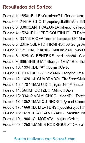 Lista de participantes: 20 ROBERTO FIRMINO o0 Sergi 0o Everton, 33 A. SCHURRLE perikinho90 Cordoba, 41 M. NEUER KaOs I AsTuR Oviedo, 43 J. BOATENG javitr Manchester City, 45 P. LAHM tabascos89 Barcelona, 48 A. ROBBEN Nandobel Real Madrid, 49 T. MULLER Maybecohen Zaragoza, 50 F. RIBERY Ergion46 Monaco, 57 D. ALABA Havel7 Psg, 62 M. HUMMELS Sr Despiste Toronto, 66 M. GOTZE P3drito Sion, 74 R. LEWANDOWSKI Havel7 Psg, 79 M. REUS misterserpico West Ham, 81 R. PEREYRA danygp89 Bournomenth, 90 K. BELLARABI Alex1493 Napoles, 155 SOKRATIS ferminnn Nantes, 156 NALDO merayombasogo Ponferradina, 244 P. CECH pepitogrillo86 Ath. Bilbao, 252 D. STURRIDGE MrMohamRam Liverpool, 254 MATA sergiotabascos89 Manchester United, 256 DAVID LUIZ misterserpico West Ham, 264 R. LUKAKU Die1234 Oporto, 279 P. POGBA Balles Malmoe, 305 L. SUAREZ Xsamu Benfica, 316 V. KOMPANY victub Valencia, 319 Y. TOURE alead71 Tottenham, 321 DAVID SILVA Saavexbox Las Palmas, 323 S. AGÜERO adrylito Malaga, 324 C. TEVEZ diego_gallego Orlando City, 334 Y. KONOPLYANKA Nandobel Real Madrid, 337 DE GEA sergiotabascos89 Manchester United, 346 W. ROONEY Ergion46 Monaco, 347 J. HERNANDEZ**** Tagho Hamburgo, 378 A. TAARABT trompexbox360 Chicago Fire, 414 L. MODRIC javitr Manchester City, 415 G. BALE adrylito Malaga, 433 C. BEAUVUE AaronRJ24 Juventus, 471 A. RAMSEY alemalaga94 Bayern Munich, 473 T. WALCOTT MrMohamRam Liverpool, 474 R. VAN PERSIE Juanin77 Depor, 477 L. KOSCIELNY MrMohamRam Liverpool, 478 J. WILSHERE alemalaga94 Bayern Munich, 496 A. MARTIAL TheForceMaker Alcorcon, 584 OSCAR sergiotabascos89 Manchester United, 604 NEYMAR Danibke New York City, 609 LUCAS buijin Celtic, 635 S. DOUMBIA Saavexbox Las Palmas, 727 E. HAZARD merayombasogo Ponferradina, 741 L. REMY Adriantr127 Atco. Madrid, 754 H. LLORIS trompexbox360 Chicago Fire, 775 J. PASTORE o0 Sergi 0o Everton, 778 S. SIRIGU ADONERI4 Alaves, 832 MUNIAIN toni1708 Celta, 844 FALCAO ADONERI4 Alaves, 845 A. TURAN diego_gallego Orlando City, 846 D. GODIN tabascos89 Barcelona, 853 DIEGO COSTA Ergion46 Monaco, 861 PIQUE SpiffiestJose Ol. Lyon, 863 SERGIO BUSQUETS StormFury elche, 865 CESC FABREGAS Ozora10Tsubasa Boca Juniors, 866 INIESTA Shaman1987 Red Bulls, 867 L. MESSI FonFenoso Ath. Bilbao, 871 A. SANCHEZ joselitorojas1 Wolsfburgo, 872 THIAGO MrMohamRam Liverpool, 873 PEDRO Sr Pistolas Udinese, 900 SANTI CAZORLA diego_gallego Orlando City, 904 S. RONDON x chachiquesi x Betis, 906 ISCO alemalaga94 Bayern Munich, 930 SERGIO RAMOS JG97 Schalke 04, 933 MARCELO Adriantr127 Atco. Madrid, 934 XABI ALONSO alead71 Tottenham, 936 A. DI MARIA AaronRJ24 Juventus, 937 C. RONALDO StormFury elche, 938 M. OZIL MaDaScAs Sevilla, 939 K. BENZEMA javitr Manchester City, 943 G. HIGUAIN sergiotabascos89 Manchester United, 948 JOSE CALLEJON StormFury elche, 979 I. RAKITIC Xsamu Benfica, 999 JORDI ALBA sergiotabascos89 Manchester United, 1028 THIAGO SILVA Juanin77 Depor, 1035 Z. IBRAHIMOVIC Entereed Sounders, 1075 A. CANDREVA trompexbox360 Chicago Fire, 1118 W. SNEIJDER Adriantr127 Atco. Madrid, 1136 G. CHIELLINI Xsamu Benfica, 1138 A. VIDAL Shaman1987 Red Bulls, 1147 C. MARCHISIO MaDaScAs Sevilla, 1185 CAVANI CometHeaven79 Chelsea, 1217 M. PJANIC MaDaScAs Sevilla, 1251 N. OTAMENDI Prince Ol. Marsella, 1255 HULK x chachiquesi x Betis, 1259 JAMES RODRIGUEZ Ozora10Tsubasa Boca Juniors, 1331 K. DE BRUYNE alexfcbarcelona B. Dortmund, 1426 J. CUADRADO TheForceMaker Alcorcon, 1524 PHILIPPE COUTINHO El Patron Lazio, 1610 N. MATIC CometHeaven79 Chelsea, 1619 P. AUBAMEYANG benniscuba Roma, 1668 D. MERTENS joselitorojas1 Wolsfburgo, 1729 PIRLO Tagho Hamburgo, 1730 ERIKSEN toni1708 Celta, 1753 KROOS benniscuba Roma, 1755 C. VELA alemalaga94 Bayern Munich, 1756 WITSEL trunks Levante, 1757 GUNDOGAN danygp89 Bournomenth, 1758 R. NAINGGOLAN benniscuba Roma, 1784 T. COURTOIS SpiffiestJose Ol. Lyon, 1797 MATUIDI Ergion46 Monaco, 1803 R. STERLING SrPistolas86 Udinese, 1822 M. VERRATTI HaLiToxGCFx Granada, 1825 C. BENTEKE perikinho90 Cordoba, 1826 R. VARANE sergiotabascos89 Manchester United, 1840 WILLIAN AndrewTorres Real Sociedad, 1842 KOKE Prince Ol. Marsella, 1852 MARQUINHOS Pyra el Capo Angeles Galaxy, 1858 B. LENO alead71 Tottenham, 1879 A. ABDENNOUR Ergion46 Monaco, 1888 A. LACAZETTE Pyra el Capo Angeles Galaxy, 1906 A. MORATA buijin Celtic, 1907 A. GRIEZMANN adrylito Malaga, 1933 P. DYBALA HaLiToxGCFx Granada, 1969 DOUGLAS COSTA trunks Levante, 1994 DEPAY buijin Celtic, 2010 C. BACCA Ronald Villarreal, 2015 PACO ALCACER diego_gallego Orlando City, 2017 L. VIETTO Pyra el Capo Angeles Galaxy, 2030 A. LAPORTE KaOs I AsTuR Oviedo.
