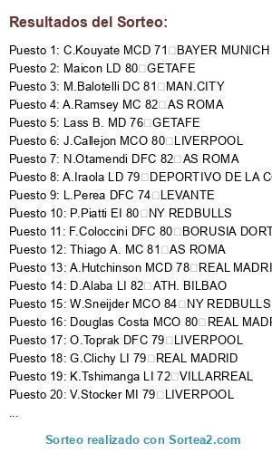 Lista de participantes: A.Lora LD 72 AS ROMA, B.Ivanovic LD 81 AS ROMA, K.Grosskreutz LD 77 AS ROMA, M.Yanga-Mbiwa DFC 76 AS ROMA, N.Otamendi DFC 82 AS ROMA, B.Tremoulinas LI 77 AS ROMA, Eliseu LI 75 AS ROMA, William Carvalho MCD 78 AS ROMA, C.Kramer MCD 78 AS ROMA, Thiago A. MC 81 AS ROMA, F.Fabregas MC 84 AS ROMA, A.Ramsey MC 82 AS ROMA, R.Barkley MCO 78 AS ROMA, Z.Ibrahimovic DC 90 AS ROMA, C.Bacca DC 81 AS ROMA, F.Torres DC 80 AS ROMA, W.Bony DC 81 AS ROMA, M.Montoya LD 77 ATH. BILBAO, D.Yedlin LD 67 ATH. BILBAO, Thiago Silva DFC 87 ATH. BILBAO, N.Onuoha DFC 75 ATH. BILBAO, J.Okore DFC 73 ATH. BILBAO, D.Alaba LI 82 ATH. BILBAO, C.Tiote MCD 78 ATH. BILBAO, Carlos Peña MC 73 ATH. BILBAO, A.Iniesta MC 89 ATH. BILBAO, Y.Chikhaoui MCO 78 ATH. BILBAO, L.Podolski MI 77 ATH. BILBAO, Jese Rdgz. MI 76 ATH. BILBAO, F.Ribery MI 88 ATH. BILBAO, E.Lamela MD 78 ATH. BILBAO, G.Bale MD 87 ATH. BILBAO, M.Gomez DC 82 ATH. BILBAO, C.Benteke DC 80 ATH. BILBAO, S.Aurier LD 77 BAYER MUNICH, A.Barzagli DFC 83 BAYER MUNICH, R.Varane DFC 81 BAYER MUNICH, Marquinhos DFC 78 BAYER MUNICH, D.Criscito LI 78 BAYER MUNICH, J.Zuñiga LI 74 BAYER MUNICH, N.De Jong MCD 81 BAYER MUNICH, Sandro MCD 79 BAYER MUNICH, C.Kouyate MCD 71 BAYER MUNICH, Fernandinho MC 81 BAYER MUNICH, P.Aubameyang MD 79 BAYER MUNICH, K.Honda ED 79 BAYER MUNICH, Lucas Moura ED 82 BAYER MUNICH, M.Sow EI 78 BAYER MUNICH, L.Messi SD 93 BAYER MUNICH, D.Sturridge DC 83 BAYER MUNICH, V.Ibarbo DC 75 BAYER LEVERKUSEN, B.Sagna LD 80 BAYER LEVERKUSEN, Pepe DFC 83 BAYER LEVERKUSEN, Alex DFC 82 BAYER LEVERKUSEN, Dante DFC 82 BAYER LEVERKUSEN, L.Kurzawa LI 77 BAYER LEVERKUSEN, A.Cole LI 77 BAYER LEVERKUSEN, D.Blind MCD 79 BAYER LEVERKUSEN, S.Busquets MCD 85 BAYER LEVERKUSEN, Borja Valero MC 82 BAYER LEVERKUSEN, P.Coutinho MCO 81 BAYER LEVERKUSEN, G.Wijnaldum MCO 78 BAYER LEVERKUSEN, S.Feghouli MD 81 BAYER LEVERKUSEN, M.Reus MD 86 BAYER LEVERKUSEN, C.Atsu EI 76 BAYER LEVERKUSEN, R.Quaresma ED 80 BAYER LEVERKUSEN, M.Mandzukic DC 83 BAYER LEVERKUSEN, R.Lukaku DC 80 BAYER LEVERKUSEN, Joao Pereira LD 78 BORUSIA DORTMUND, Maxi Pereira LD 77 BORUSIA DORTMUND, L.Piszczek LD 82 BORUSIA DORTMUND, D.Godin DFC 84 BORUSIA DORTMUND, A.Laporte DFC 80 BORUSIA DORTMUND, F.Coloccini DFC 80 BORUSIA DORTMUND, P.Evra LI 80 BORUSIA DORTMUND, P.Lahm MCD 87 BORUSIA DORTMUND, Javi Garcia MCD 79 BORUSIA DORTMUND, A.Vidal MC 85 BORUSIA DORTMUND, K.Mirallas MD 80 BORUSIA DORTMUND, D.Payet MI 79 BORUSIA DORTMUND, Pedro Rgdz. EI 83 BORUSIA DORTMUND, J.Iturbe ED 77 BORUSIA DORTMUND, S.Doumbia DC 82 BORUSIA DORTMUND, S.Jovetic DC 81 BORUSIA DORTMUND, M.Klose DC 81 BORUSIA DORTMUND, D.Carvajal LD 79 CORDOBA, J.Mascherano DFC 83 CORDOBA, L.Castan DFC 81 CORDOBA, D.Carriço DFC 79 CORDOBA, K.Gibbs LI 78 CORDOBA, Antunes LI 76 CORDOBA, D.De Rossi MCD 84 CORDOBA, Fernando MCD 79 CORDOBA, J.Moutinho MCO 83 CORDOBA, D.Mertens MCO 82 CORDOBA, J.Cuadrado MD 83 CORDOBA, Koke R. MI 82 CORDOBA, I.Afellay MI 76 CORDOBA, M.Depay EI 78 CORDOBA, M.Susaeta ED 80 CORDOBA, Diego Costa DC 85 CORDOBA, S.Eto'o DC 81 CORDOBA, Coke LD 78 DEPORTIVO DE LA CORUÑA, A.Iraola LD 79 DEPORTIVO DE LA CORUÑA, V.Kompany DFC 86 DEPORTIVO DE LA CORUÑA, I.Martinez DFC 79 DEPORTIVO DE LA CORUÑA, J.Alba LI 81 DEPORTIVO DE LA CORUÑA, S.Bender MCD 81 DEPORTIVO DE LA CORUÑA, Yaya Toure MC 86 DEPORTIVO DE LA CORUÑA, Enzo Perez MC 81 DEPORTIVO DE LA CORUÑA, K.P.Boateng MCO 80 DEPORTIVO DE LA CORUÑA, James Rdgz. MCO 86 DEPORTIVO DE LA CORUÑA, I.Perisic MI 76 DEPORTIVO DE LA CORUÑA, K.Asamoah MI 79 DEPORTIVO DE LA CORUÑA, S.Sam MD 78 DEPORTIVO DE LA CORUÑA, P.Ebert MD 75 DEPORTIVO DE LA CORUÑA, K.Volland MD 79 DEPORTIVO DE LA CORUÑA, L.Narsingh ED 75 DEPORTIVO DE LA CORUÑA, L.Suarez DC 89 DEPORTIVO DE LA CORUÑA, I.Abate LD 76 BARCELONA, I.Opara DFC 67 BARCELONA, Yun Sun Young DFC 65 BARCELONA, Sokratis P. DFC 82 BARCELONA, Balenziaga LI 77 BARCELONA, P.Van Aanholt LTI 71 BARCELONA, Iturraspe MCD 80 BARCELONA, Gabi MC 82 BARCELONA, R.Firmimo MCO 81 BARCELONA, Jesus Navas MD 82 BARCELONA, S.Cazorla MI 84 BARCELONA, D.Silva MI 87 BARCELONA, I.Muniain EI 80 BARCELONA, Bruma EI 76 BARCELONA, Hulk ED 83 BARCELONA, S.Agüero DC 87 BARCELONA, E.Hurtado DC 65 BARCELONA, Maicon LD 80 GETAFE, N.Vidic DFC 83 GETAFE, N.Subotic DFC 81 GETAFE, M.Musacchio DFC 79 GETAFE, A.Kolarov LI 78 GETAFE, Silvio LI 76 GETAFE, Felipe Melo MCD 81 GETAFE, I.Camacho MCD 79 GETAFE, J.Wilshere MC 81 GETAFE, Hernanes MC 81 GETAFE, K.De Bryune MCO 82 GETAFE, J.Farfan MD 83 GETAFE, Lass B. MD 76 GETAFE, T.Müller MD 86 GETAFE, Ibai Gomez EI 78 GETAFE, R.Sterling ED 80 GETAFE, G.Rossi DC 82 GETAFE, S.Coleman LD 79 LEVANTE, Miranda DFC 83 LEVANTE, M.Skrtel DFC 81 LEVANTE, L.Perea DFC 74 LEVANTE, M.Schmelzer LI 76 LEVANTE, P.Armero LI 73 LEVANTE, Ramires MCD 81 LEVANTE, M.Fellaini MCD 79 LEVANTE, C.Marchisio MC 83 LEVANTE, M.Hamsik MCO 82 LEVANTE, A.Robben MD 90 LEVANTE, Bolly MD 64 LEVANTE, A.Schürrle MI 81 LEVANTE, Vitolo MI 77 LEVANTE, S.Varela EI 78 LEVANTE, Biabiany ED 79 LEVANTE, K.Benzema DC 85 LEVANTE, K.Walker LD 77 LIVERPOOL, Juanfran LD 79 LIVERPOOL, Abdennour DFC 79 LIVERPOOL, O.Toprak DFC 79 LIVERPOOL, L.Koscielny DFC 81 LIVERPOOL, Alex Sandro LI 78 LIVERPOOL, M.Schneiderlin MCD 80 LIVERPOOL, R.Nainggolan MC 81 LIVERPOOL, J.Callejon MCO 80 LIVERPOOL, S.Kagawa MCO 83 LIVERPOOL, M.Gotze MCO 86 LIVERPOOL, V.Stocker MI 79 LIVERPOOL, G.Deulofeu MD 76 LIVERPOOL, Willian MD 82 LIVERPOOL, Rodrigo M. DC 80 LIVERPOOL, Welbeck DC 78 LIVERPOOL, R.Van Persie DC 87 LIVERPOOL, J.Vertonghen DFC 82 MAN.CITY, E.Mangala DFC 80 MAN.CITY, M.Sakho DFC 80 MAN.CITY, C.Ansaldi LI 77 MAN.CITY, S.Radu LI 77 MAN.CITY, A.Song MCD 80 MAN.CITY, G.Barry MCD 80 MAN.CITY, J.McCarthy MCD 80 MAN.CITY, L.Modric MC 87 MAN.CITY, Oscar MCO 84 MAN.CITY, S.Lichtsteiner MD 77 MAN.CITY, Aleix Vidal MD 76 MAN.CITY, A.Ljajic EI 77 MAN.CITY, A.Candreva ED 83 MAN.CITY, G.Higuain DC 84 MAN.CITY, C.Tevez DC 85 MAN.CITY, M.Balotelli DC 81 MAN.CITY, Dani Alves LD 83 MAN.UNITED, Choi Chul Soon L