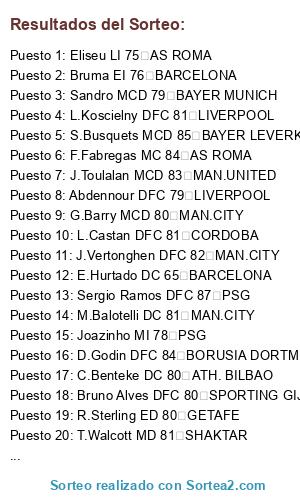 Lista de participantes: A.Lora LD 72 AS ROMA, B.Ivanovic LD 81 AS ROMA, K.Grosskreutz LD 77 AS ROMA, M.Yanga-Mbiwa DFC 76 AS ROMA, N.Otamendi DFC 82 AS ROMA, B.Tremoulinas LI 77 AS ROMA, Eliseu LI 75 AS ROMA, William Carvalho MCD 78 AS ROMA, C.Kramer MCD 78 AS ROMA, Thiago A. MC 81 AS ROMA, F.Fabregas MC 84 AS ROMA, A.Ramsey MC 82 AS ROMA, R.Barkley MCO 78 AS ROMA, Z.Ibrahimovic DC 90 AS ROMA, C.Bacca DC 81 AS ROMA, F.Torres DC 80 AS ROMA, W.Bony DC 81 AS ROMA, M.Montoya LD 77 ATH. BILBAO, D.Yedlin LD 67 ATH. BILBAO, Thiago Silva DFC 87 ATH. BILBAO, N.Onuoha DFC 75 ATH. BILBAO, J.Okore DFC 73 ATH. BILBAO, D.Alaba LI 82 ATH. BILBAO, C.Tiote MCD 78 ATH. BILBAO, Carlos Peña MC 73 ATH. BILBAO, A.Iniesta MC 89 ATH. BILBAO, Y.Chikhaoui MCO 78 ATH. BILBAO, L.Podolski MI 77 ATH. BILBAO, Jese Rdgz. MI 76 ATH. BILBAO, F.Ribery MI 88 ATH. BILBAO, E.Lamela MD 78 ATH. BILBAO, G.Bale MD 87 ATH. BILBAO, M.Gomez DC 82 ATH. BILBAO, C.Benteke DC 80 ATH. BILBAO, S.Aurier LD 77 BAYER MUNICH, A.Barzagli DFC 83 BAYER MUNICH, R.Varane DFC 81 BAYER MUNICH, Marquinhos DFC 78 BAYER MUNICH, D.Criscito LI 78 BAYER MUNICH, J.Zuñiga LI 74 BAYER MUNICH, N.De Jong MCD 81 BAYER MUNICH, Sandro MCD 79 BAYER MUNICH, C.Kouyate MCD 71 BAYER MUNICH, Fernandinho MC 81 BAYER MUNICH, P.Aubameyang MD 79 BAYER MUNICH, K.Honda ED 79 BAYER MUNICH, Lucas Moura ED 82 BAYER MUNICH, M.Sow EI 78 BAYER MUNICH, L.Messi SD 93 BAYER MUNICH, D.Sturridge DC 83 BAYER MUNICH, V.Ibarbo DC 75 BAYER LEVERKUSEN, B.Sagna LD 80 BAYER LEVERKUSEN, Pepe DFC 83 BAYER LEVERKUSEN, Alex DFC 82 BAYER LEVERKUSEN, Dante DFC 82 BAYER LEVERKUSEN, L.Kurzawa LI 77 BAYER LEVERKUSEN, A.Cole LI 77 BAYER LEVERKUSEN, D.Blind MCD 79 BAYER LEVERKUSEN, S.Busquets MCD 85 BAYER LEVERKUSEN, Borja Valero MC 82 BAYER LEVERKUSEN, P.Coutinho MCO 81 BAYER LEVERKUSEN, G.Wijnaldum MCO 78 BAYER LEVERKUSEN, S.Feghouli MD 81 BAYER LEVERKUSEN, M.Reus MD 86 BAYER LEVERKUSEN, C.Atsu EI 76 BAYER LEVERKUSEN, R.Quaresma ED 80 BAYER LEVERKUSEN, M.Mandzukic DC 83 BAYER LEVERKUSEN, R.Lukaku DC 80 BAYER LEVERKUSEN, Joao Pereira LD 78 BORUSIA DORTMUND, Maxi Pereira LD 77 BORUSIA DORTMUND, L.Piszczek LD 82 BORUSIA DORTMUND, D.Godin DFC 84 BORUSIA DORTMUND, A.Laporte DFC 80 BORUSIA DORTMUND, F.Coloccini DFC 80 BORUSIA DORTMUND, P.Evra LI 80 BORUSIA DORTMUND, P.Lahm MCD 87 BORUSIA DORTMUND, Javi Garcia MCD 79 BORUSIA DORTMUND, A.Vidal MC 85 BORUSIA DORTMUND, K.Mirallas MD 80 BORUSIA DORTMUND, D.Payet MI 79 BORUSIA DORTMUND, Pedro Rgdz. EI 83 BORUSIA DORTMUND, J.Iturbe ED 77 BORUSIA DORTMUND, S.Doumbia DC 82 BORUSIA DORTMUND, S.Jovetic DC 81 BORUSIA DORTMUND, M.Klose DC 81 BORUSIA DORTMUND, D.Carvajal LD 79 CORDOBA, J.Mascherano DFC 83 CORDOBA, L.Castan DFC 81 CORDOBA, D.Carriço DFC 79 CORDOBA, K.Gibbs LI 78 CORDOBA, Antunes LI 76 CORDOBA, D.De Rossi MCD 84 CORDOBA, Fernando MCD 79 CORDOBA, J.Moutinho MCO 83 CORDOBA, D.Mertens MCO 82 CORDOBA, J.Cuadrado MD 83 CORDOBA, Koke R. MI 82 CORDOBA, I.Afellay MI 76 CORDOBA, M.Depay EI 78 CORDOBA, M.Susaeta ED 80 CORDOBA, Diego Costa DC 85 CORDOBA, S.Eto'o DC 81 CORDOBA, Coke LD 78 DEPORTIVO DE LA CORUÑA, A.Iraola LD 79 DEPORTIVO DE LA CORUÑA, V.Kompany DFC 86 DEPORTIVO DE LA CORUÑA, I.Martinez DFC 79 DEPORTIVO DE LA CORUÑA, J.Alba LI 81 DEPORTIVO DE LA CORUÑA, S.Bender MCD 81 DEPORTIVO DE LA CORUÑA, Yaya Toure MC 86 DEPORTIVO DE LA CORUÑA, Enzo Perez MC 81 DEPORTIVO DE LA CORUÑA, K.P.Boateng MCO 80 DEPORTIVO DE LA CORUÑA, James Rdgz. MCO 86 DEPORTIVO DE LA CORUÑA, I.Perisic MI 76 DEPORTIVO DE LA CORUÑA, K.Asamoah MI 79 DEPORTIVO DE LA CORUÑA, S.Sam MD 78 DEPORTIVO DE LA CORUÑA, P.Ebert MD 75 DEPORTIVO DE LA CORUÑA, K.Volland MD 79 DEPORTIVO DE LA CORUÑA, L.Narsingh ED 75 DEPORTIVO DE LA CORUÑA, L.Suarez DC 89 DEPORTIVO DE LA CORUÑA, I.Abate LD 76 BARCELONA, I.Opara DFC 67 BARCELONA, Yun Sun Young DFC 65 BARCELONA, Sokratis P. DFC 82 BARCELONA, Balenziaga LI 77 BARCELONA, P.Van Aanholt LTI 71 BARCELONA, Iturraspe MCD 80 BARCELONA, Gabi MC 82 BARCELONA, R.Firmimo MCO 81 BARCELONA, Jesus Navas MD 82 BARCELONA, S.Cazorla MI 84 BARCELONA, D.Silva MI 87 BARCELONA, I.Muniain EI 80 BARCELONA, Bruma EI 76 BARCELONA, Hulk ED 83 BARCELONA, S.Agüero DC 87 BARCELONA, E.Hurtado DC 65 BARCELONA, Maicon LD 80 GETAFE, N.Vidic DFC 83 GETAFE, N.Subotic DFC 81 GETAFE, M.Musacchio DFC 79 GETAFE, A.Kolarov LI 78 GETAFE, Silvio LI 76 GETAFE, Felipe Melo MCD 81 GETAFE, I.Camacho MCD 79 GETAFE, J.Wilshere MC 81 GETAFE, Hernanes MC 81 GETAFE, K.De Bryune MCO 82 GETAFE, J.Farfan MD 83 GETAFE, Lass B. MD 76 GETAFE, T.Müller MD 86 GETAFE, Ibai Gomez EI 78 GETAFE, R.Sterling ED 80 GETAFE, G.Rossi DC 82 GETAFE, S.Coleman LD 79 LEVANTE, Miranda DFC 83 LEVANTE, M.Skrtel DFC 81 LEVANTE, L.Perea DFC 74 LEVANTE, M.Schmelzer LI 76 LEVANTE, P.Armero LI 73 LEVANTE, Ramires MCD 81 LEVANTE, M.Fellaini MCD 79 LEVANTE, C.Marchisio MC 83 LEVANTE, M.Hamsik MCO 82 LEVANTE, A.Robben MD 90 LEVANTE, Bolly MD 64 LEVANTE, A.Schürrle MI 81 LEVANTE, Vitolo MI 77 LEVANTE, S.Varela EI 78 LEVANTE, Biabiany ED 79 LEVANTE, K.Benzema DC 85 LEVANTE, K.Walker LD 77 LIVERPOOL, Juanfran LD 79 LIVERPOOL, Abdennour DFC 79 LIVERPOOL, O.Toprak DFC 79 LIVERPOOL, L.Koscielny DFC 81 LIVERPOOL, Alex Sandro LI 78 LIVERPOOL, M.Schneiderlin MCD 80 LIVERPOOL, R.Nainggolan MC 81 LIVERPOOL, J.Callejon MCO 80 LIVERPOOL, S.Kagawa MCO 83 LIVERPOOL, M.Gotze MCO 86 LIVERPOOL, V.Stocker MI 79 LIVERPOOL, G.Deulofeu MD 76 LIVERPOOL, Willian MD 82 LIVERPOOL, Rodrigo M. DC 80 LIVERPOOL, Welbeck DC 78 LIVERPOOL, R.Van Persie DC 87 LIVERPOOL, J.Vertonghen DFC 82 MAN.CITY, E.Mangala DFC 80 MAN.CITY, M.Sakho DFC 80 MAN.CITY, C.Ansaldi LI 77 MAN.CITY, S.Radu LI 77 MAN.CITY, A.Song MCD 80 MAN.CITY, G.Barry MCD 80 MAN.CITY, J.McCarthy MCD 80 MAN.CITY, L.Modric MC 87 MAN.CITY, Oscar MCO 84 MAN.CITY, S.Lichtsteiner MD 77 MAN.CITY, Aleix Vidal MD 76 MAN.CITY, A.Ljajic EI 77 MAN.CITY, A.Candreva ED 83 MAN.CITY, G.Higuain DC 84 MAN.CITY, C.Tevez DC 85 MAN.CITY, M.Balotelli DC 81 MAN.CITY, Dani Alves LD 83 MAN.UNITED, Choi Chul Soon L