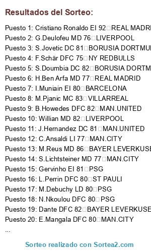 Lista de participantes: A.Lora LD 72 AS ROMA, B.Ivanovic LD 81 AS ROMA, K.Grosskreutz LD 77 AS ROMA, M.Yanga-Mbiwa DFC 76 AS ROMA, N.Otamendi DFC 82 AS ROMA, B.Tremoulinas LI 77 AS ROMA, Eliseu LI 75 AS ROMA, William Carvalho MCD 78 AS ROMA, C.Kramer MCD 78 AS ROMA, Thiago A. MC 81 AS ROMA, F.Fabregas MC 84 AS ROMA, A.Ramsey MC 82 AS ROMA, R.Barkley MCO 78 AS ROMA, Z.Ibrahimovic DC 90 AS ROMA, C.Bacca DC 81 AS ROMA, F.Torres DC 80 AS ROMA, W.Bony DC 81 AS ROMA, M.Montoya LD 77 ATH. BILBAO, D.Yedlin LD 67 ATH. BILBAO, Thiago Silva DFC 87 ATH. BILBAO, N.Onuoha DFC 75 ATH. BILBAO, J.Okore DFC 73 ATH. BILBAO, D.Alaba LI 82 ATH. BILBAO, C.Tiote MCD 78 ATH. BILBAO, Carlos Peña MC 73 ATH. BILBAO, A.Iniesta MC 89 ATH. BILBAO, Y.Chikhaoui MCO 78 ATH. BILBAO, L.Podolski MI 77 ATH. BILBAO, Jese Rdgz. MI 76 ATH. BILBAO, F.Ribery MI 88 ATH. BILBAO, E.Lamela MD 78 ATH. BILBAO, G.Bale MD 87 ATH. BILBAO, M.Gomez DC 82 ATH. BILBAO, C.Benteke DC 80 ATH. BILBAO, S.Aurier LD 77 BAYER MUNICH, A.Barzagli DFC 83 BAYER MUNICH, R.Varane DFC 81 BAYER MUNICH, Marquinhos DFC 78 BAYER MUNICH, D.Criscito LI 78 BAYER MUNICH, J.Zuñiga LI 74 BAYER MUNICH, N.De Jong MCD 81 BAYER MUNICH, Sandro MCD 79 BAYER MUNICH, C.Kouyate MCD 71 BAYER MUNICH, Fernandinho MC 81 BAYER MUNICH, P.Aubameyang MD 79 BAYER MUNICH, K.Honda ED 79 BAYER MUNICH, Lucas Moura ED 82 BAYER MUNICH, M.Sow EI 78 BAYER MUNICH, L.Messi SD 93 BAYER MUNICH, D.Sturridge DC 83 BAYER MUNICH, V.Ibarbo DC 75 BAYER MUNICH, B.Sagna LD 80 BAYER LEVERKUSEN, Pepe DFC 83 BAYER LEVERKUSEN, Alex DFC 82 BAYER LEVERKUSEN, Dante DFC 82 BAYER LEVERKUSEN, L.Kurzawa LI 77 BAYER LEVERKUSEN, A.Cole LI 77 BAYER LEVERKUSEN, D.Blind MCD 79 BAYER LEVERKUSEN, S.Busquets MCD 85 BAYER LEVERKUSEN, Borja Valero MC 82 BAYER LEVERKUSEN, P.Coutinho MCO 81 BAYER LEVERKUSEN, G.Wijnaldum MCO 78 BAYER LEVERKUSEN, S.Feghouli MD 81 BAYER LEVERKUSEN, M.Reus MD 86 BAYER LEVERKUSEN, C.Atsu EI 76 BAYER LEVERKUSEN, R.Quaresma ED 80 BAYER LEVERKUSEN, M.Mandzukic DC 83 BAYER LEVERKUSEN, R.Lukaku DC 80 BAYER LEVERKUSEN, Joao Pereira LD 78 BORUSIA DORTMUND, Maxi Pereira LD 77 BORUSIA DORTMUND, L.Piszczek LD 82 BORUSIA DORTMUND, D.Godin DFC 84 BORUSIA DORTMUND, A.Laporte DFC 80 BORUSIA DORTMUND, F.Coloccini DFC 80 BORUSIA DORTMUND, P.Evra LI 80 BORUSIA DORTMUND, P.Lahm MCD 87 BORUSIA DORTMUND, Javi Garcia MCD 79 BORUSIA DORTMUND, A.Vidal MC 85 BORUSIA DORTMUND, K.Mirallas MD 80 BORUSIA DORTMUND, D.Payet MI 79 BORUSIA DORTMUND, Pedro Rgdz. EI 83 BORUSIA DORTMUND, J.Iturbe ED 77 BORUSIA DORTMUND, S.Doumbia DC 82 BORUSIA DORTMUND, S.Jovetic DC 81 BORUSIA DORTMUND, M.Klose DC 81 BORUSIA DORTMUND, D.Carvajal LD 79 CORDOBA, J.Mascherano DFC 83 CORDOBA, L.Castan DFC 81 CORDOBA, D.Carriço DFC 79 CORDOBA, K.Gibbs LI 78 CORDOBA, Antunes LI 76 CORDOBA, D.De Rossi MCD 84 CORDOBA, Fernando MCD 79 CORDOBA, J.Moutinho MCO 83 CORDOBA, D.Mertens MCO 82 CORDOBA, J.Cuadrado MD 83 CORDOBA, Koke R. MI 82 CORDOBA, I.Afellay MI 76 CORDOBA, M.Depay EI 78 CORDOBA, M.Susaeta ED 80 CORDOBA, Diego Costa DC 85 CORDOBA, S.Eto'o DC 81 CORDOBA, Coke LD 78 DEPORTIVO DE LA CORUÑA, A.Iraola LD 79 DEPORTIVO DE LA CORUÑA, V.Kompany DFC 86 DEPORTIVO DE LA CORUÑA, I.Martinez DFC 79 DEPORTIVO DE LA CORUÑA, J.Alba LI 81 DEPORTIVO DE LA CORUÑA, S.Bender MCD 81 DEPORTIVO DE LA CORUÑA, Yaya Toure MC 86 DEPORTIVO DE LA CORUÑA, Enzo Perez MC 81 DEPORTIVO DE LA CORUÑA, K.P.Boateng MCO 80 DEPORTIVO DE LA CORUÑA, James Rdgz. MCO 86 DEPORTIVO DE LA CORUÑA, I.Perisic MI 76 DEPORTIVO DE LA CORUÑA, K.Asamoah MI 79 DEPORTIVO DE LA CORUÑA, S.Sam MD 78 DEPORTIVO DE LA CORUÑA, P.Ebert MD 75 DEPORTIVO DE LA CORUÑA, K.Volland MD 79 DEPORTIVO DE LA CORUÑA, L.Narsingh ED 75 DEPORTIVO DE LA CORUÑA, L.Suarez DC 89 DEPORTIVO DE LA CORUÑA, I.Abate LD 76 BARCELONA, I.Opara DFC 67 BARCELONA, Yun Sun Young DFC 65 BARCELONA, Sokratis P. DFC 82 BARCELONA, Balenziaga LI 77 BARCELONA, P.Van Aanholt LTI 71 BARCELONA, Iturraspe MCD 80 BARCELONA, Gabi MC 82 BARCELONA, R.Firmimo MCO 81 BARCELONA, Jesus Navas MD 82 BARCELONA, S.Cazorla MI 84 BARCELONA, D.Silva MI 87 BARCELONA, I.Muniain EI 80 BARCELONA, Bruma EI 76 BARCELONA, Hulk ED 83 BARCELONA, S.Agüero DC 87 BARCELONA, E.Hurtado DC 65 BARCELONA, Maicon LD 80 GETAFE, N.Vidic DFC 83 GETAFE, N.Subotic DFC 81 GETAFE, M.Musacchio DFC 79 GETAFE, A.Kolarov LI 78 GETAFE, Silvio LI 76 GETAFE, Felipe Melo MCD 81 GETAFE, I.Camacho MCD 79 GETAFE, J.Wilshere MC 81 GETAFE, Hernanes MC 81 GETAFE, K.De Bryune MCO 82 GETAFE, J.Farfan MD 83 GETAFE, Lass B. MD 76 GETAFE, T.Müller MD 86 GETAFE, Ibai Gomez EI 78 GETAFE, R.Sterling ED 80 GETAFE, G.Rossi DC 82 GETAFE, S.Coleman LD 79 LEVANTE, Miranda DFC 83 LEVANTE, M.Skrtel DFC 81 LEVANTE, L.Perea DFC 74 LEVANTE, M.Schmelzer LI 76 LEVANTE, P.Armero LI 73 LEVANTE, Ramires MCD 81 LEVANTE, M.Fellaini MCD 79 LEVANTE, C.Marchisio MC 83 LEVANTE, M.Hamsik MCO 82 LEVANTE, A.Robben MD 90 LEVANTE, Bolly MD 64 LEVANTE, A.Schürrle MI 81 LEVANTE, Vitolo MI 77 LEVANTE, S.Varela EI 78 LEVANTE, Biabiany ED 79 LEVANTE, K.Benzema DC 85 LEVANTE, K.Walker LD 77 LIVERPOOL, Juanfran LD 79 LIVERPOOL, Abdennour DFC 79 LIVERPOOL, O.Toprak DFC 79 LIVERPOOL, L.Koscielny DFC 81 LIVERPOOL, Alex Sandro LI 78 LIVERPOOL, M.Schneiderlin MCD 80 LIVERPOOL, R.Nainggolan MC 81 LIVERPOOL, J.Callejon MCO 80 LIVERPOOL, S.Kagawa MCO 83 LIVERPOOL, M.Gotze MCO 86 LIVERPOOL, V.Stocker MI 79 LIVERPOOL, G.Deulofeu MD 76 LIVERPOOL, Willian MD 82 LIVERPOOL, Rodrigo M. DC 80 LIVERPOOL, Welbeck DC 78 LIVERPOOL, R.Van Persie DC 87 LIVERPOOL, J.Vertonghen DFC 82 MAN.CITY, E.Mangala DFC 80 MAN.CITY, M.Sakho DFC 80 MAN.CITY, C.Ansaldi LI 77 MAN.CITY, S.Radu LI 77 MAN.CITY, A.Song MCD 80 MAN.CITY, G.Barry MCD 80 MAN.CITY, J.McCarthy MCD 80 MAN.CITY, L.Modric MC 87 MAN.CITY, Oscar MCO 84 MAN.CITY, S.Lichtsteiner MD 77 MAN.CITY, Aleix Vidal MD 76 MAN.CITY, A.Ljajic EI 77 MAN.CITY, A.Candreva ED 83 MAN.CITY, G.Higuain DC 84 MAN.CITY, C.Tevez DC 85 MAN.CITY, M.Balotelli DC 81 MAN.CITY, Dani Alves LD 83 MAN.UNITED, Choi Chul Soon LD 67