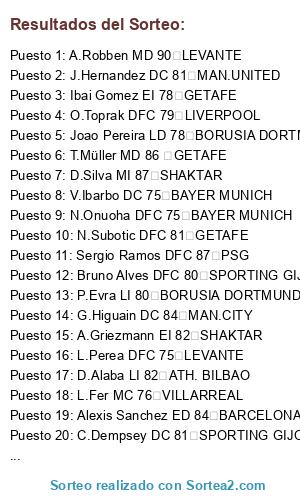Lista de participantes: A.Lora LD 72 AS ROMA, B.Ivanovic LD 81 AS ROMA, K.Grosskreutz LD 77 AS ROMA, M.Yanga-Mbiwa DFC 76 AS ROMA, N.Otamendi DFC 82 AS ROMA, B.Tremoulinas LI 77 AS ROMA, Eliseu LI 75 AS ROMA, William Carvalho MCD 78 AS ROMA, C.Kramer MCD 78 AS ROMA, Thiago A. MC 81 AS ROMA, R.Pereyra MC 78 AS ROMA, R.Barkley MCO 78 AS ROMA, J.Blaszczykowski MD 82 AS ROMA, Arda Turan MI 84 AS ROMA, Gonzalo Castro EI 78 AS ROMA, Z.Ibrahimovic DC 90 AS ROMA, D.Berbatov DC 81 AS ROMA, M.Montoya LD 77 ATH. BILBAO, D.Yedlin LD 67 ATH. BILBAO, Thiago Silva DFC 87 ATH. BILBAO, A.Barzagli DFC 83 ATH. BILBAO, J.Okore DFC 73 ATH. BILBAO, D.Alaba LI 82 ATH. BILBAO, C.Tiote MCD 78 ATH. BILBAO, Sandro MCD 79 ATH. BILBAO, Carlos Peña MC 73 ATH. BILBAO, A.Iniesta MC 89 ATH. BILBAO, L.Podolski MI 77 ATH. BILBAO, Jese Rdgz. MI 76 ATH. BILBAO, F.Ribery MI 88 ATH. BILBAO, E.Lamela MD 78 ATH. BILBAO, Hulk ED 83 ATH. BILBAO, M.Gomez DC 82 ATH. BILBAO, C.Benteke DC 80 ATH. BILBAO, S.Aurier LD 77 BAYER MUNICH, R.Varane DFC 81 BAYER MUNICH, Marquinhos DFC 78 BAYER MUNICH, N.Onuoha DFC 75 BAYER MUNICH, D.Criscito LI 78 BAYER MUNICH, J.Zuñiga LI 74 BAYER MUNICH, C.Kouyate MCD 71 BAYER MUNICH, Ramires MCD 81 BAYER MUNICH, Fernandinho MC 81 BAYER MUNICH, Y.Chikhaoui MCO 78 BAYER MUNICH, P.Aubameyang MD 79 BAYER MUNICH, A.Schürrle MI 81 BAYER MUNICH, K.Honda ED 79 BAYER MUNICH, Lucas Moura ED 82 BAYER MUNICH, M.Sow EI 78 BAYER MUNICH, L.Messi SD 93 BAYER MUNICH, V.Ibarbo DC 75 BAYER MUNICH, B.Sagna LD 80 BAYER LEVERKUSEN, Pepe DFC 83 BAYER LEVERKUSEN, Alex DFC 82 BAYER LEVERKUSEN, Dante DFC 82 BAYER LEVERKUSEN, L.Kurzawa LI 77 BAYER LEVERKUSEN, A.Cole LI 77 BAYER LEVERKUSEN, D.Blind MCD 79 BAYER LEVERKUSEN, S.Busquets MCD 85 BAYER LEVERKUSEN, Borja Valero MC 82 BAYER LEVERKUSEN, P.Coutinho MCO 81 BAYER LEVERKUSEN, G.Wijnaldum MCO 78 BAYER LEVERKUSEN, A.Di Maria MCO 86 BAYER LEVERKUSEN, M.Reus MD 86 BAYER LEVERKUSEN, C.Atsu EI 76 BAYER LEVERKUSEN, R.Quaresma ED 80 BAYER LEVERKUSEN, M.Mandzukic DC 83 BAYER LEVERKUSEN, R.Lukaku DC 80 BAYER LEVERKUSEN, Joao Pereira LD 78 BORUSIA DORTMUND, Maxi Pereira LD 77 BORUSIA DORTMUND, L.Piszczek LD 82 BORUSIA DORTMUND, M.Hümmels DFC 86 BORUSIA DORTMUND, A.Laporte DFC 80 BORUSIA DORTMUND, F.Coloccini DFC 80 BORUSIA DORTMUND, P.Evra LI 80 BORUSIA DORTMUND, Javi Garcia MCD 79 BORUSIA DORTMUND, M.Pjanic MC 83 BORUSIA DORTMUND, R.Firmimo MCO 81 BORUSIA DORTMUND, R.Cabella MCO 79 BORUSIA DORTMUND, K.Mirallas MD 80 BORUSIA DORTMUND, J.Iturbe ED 77 BORUSIA DORTMUND, S.Doumbia DC 82 BORUSIA DORTMUND, S.Jovetic DC 81 BORUSIA DORTMUND, M.Klose DC 81 BORUSIA DORTMUND, S.Agüero DC 87 BORUSIA DORTMUND, D.Carvajal LD 79 CORDOBA, J.Mascherano DFC 83 CORDOBA, L.Castan DFC 81 CORDOBA, D.Carriço DFC 79 CORDOBA, K.Gibbs LI 78 CORDOBA, Antunes LI 76 CORDOBA, D.De Rossi MCD 84 CORDOBA, Fernando MCD 79 CORDOBA, J.Moutinho MCO 83 CORDOBA, D.Mertens MCO 82 CORDOBA, J.Cuadrado MD 83 CORDOBA, Koke R. MI 82 CORDOBA, I.Afellay MI 76 CORDOBA, M.Depay EI 78 CORDOBA, M.Susaeta ED 80 CORDOBA, Diego Costa DC 85 CORDOBA, S.Eto'o DC 81 CORDOBA, Danilo LD 78 DEPORTIVO DE LA CORUÑA, V.Kompany DFC 86 DEPORTIVO DE LA CORUÑA, I.Martinez DFC 79 DEPORTIVO DE LA CORUÑA, J.Alba LI 81 DEPORTIVO DE LA CORUÑA, C.Erkin LI 76 DEPORTIVO DE LA CORUÑA, S.Bender MCD 81 DEPORTIVO DE LA CORUÑA, Yaya Toure MC 86 DEPORTIVO DE LA CORUÑA, Enzo Perez MC 81 DEPORTIVO DE LA CORUÑA, M.Kovacic MC 76 DEPORTIVO DE LA CORUÑA, K.P.Boateng MCO 80 DEPORTIVO DE LA CORUÑA, K.De Bryune MCO 82 DEPORTIVO DE LA CORUÑA, I.Perisic MI 76 DEPORTIVO DE LA CORUÑA, K.Asamoah MI 79 DEPORTIVO DE LA CORUÑA, S.Lulic MI 78 DEPORTIVO DE LA CORUÑA, S.Sam MD 78 DEPORTIVO DE LA CORUÑA, K.Volland MD 79 DEPORTIVO DE LA CORUÑA, L.Suarez DC 89 DEPORTIVO DE LA CORUÑA, I.Abate LD 76 BARCELONA, I.Opara DFC 67 BARCELONA, Yun Sun Young DFC 65 BARCELONA, Sokratis P. DFC 82 BARCELONA, Balenziaga LI 77 BARCELONA, P.Van Aanholt LTI 71 BARCELONA, S.Khedira MCD 84 BARCELONA, Iturraspe MCD 80 BARCELONA, Gabi MC 82 BARCELONA, A.Vidal MC 85 BARCELONA, I.Rakitic MCO 83 BARCELONA, G.Bale MD 87 BARCELONA, Bruma EI 76 BARCELONA, Pedro Rdgz. EI 83 BARCELONA, Alexis Sanchez ED 84 BARCELONA, E.Hurtado DC 65 BARCELONA, J.Martinez DC 82 BARCELONA, Maicon LD 80 GETAFE, N.Vidic DFC 83 GETAFE, N.Subotic DFC 81 GETAFE, M.Musacchio DFC 79 GETAFE, A.Kolarov LI 78 GETAFE, Silvio LI 76 GETAFE, Felipe Melo MCD 81 GETAFE, I.Camacho MCD 79 GETAFE, J.Wilshere MC 81 GETAFE, Hernanes MC 81 GETAFE, James Rdgz. MCO 86 GETAFE, J.Farfan MD 83 GETAFE, Lass B. MD 76 GETAFE, T.Müller MD 86 GETAFE, Ibai Gomez EI 78 GETAFE, R.Sterling ED 80 GETAFE, C.Bacca DC 81 GETAFE, S.Coleman LD 79 LEVANTE, Miranda DFC 83 LEVANTE, M.Skrtel DFC 81 LEVANTE, L.Perea DFC 75 LEVANTE, M.Schmelzer LI 76 LEVANTE, P.Armero LI 73 LEVANTE, N.De Jong MCD 81 LEVANTE, M.Fellaini MCD 79 LEVANTE, C.Marchisio MC 83 LEVANTE, M.Hamsik MCO 82 LEVANTE, A.Robben MD 90 LEVANTE, Bolly MD 64 LEVANTE, S.Varela EI 78 LEVANTE, Biabiany ED 79 LEVANTE, D.Sturridge DC 83 LEVANTE, K.Benzema DC 85 LEVANTE, F.Torres DC 80 LEVANTE, K.Walker LD 77 LIVERPOOL, Juanfran LD 79 LIVERPOOL, Abdennour DFC 79 LIVERPOOL, O.Toprak DFC 79 LIVERPOOL, L.Koscielny DFC 81 LIVERPOOL, Alex Sandro LI 78 LIVERPOOL, M.Schneiderlin MCD 80 LIVERPOOL, R.Nainggolan MC 81 LIVERPOOL, J.Callejon MCO 80 LIVERPOOL, M.Gotze MCO 86 LIVERPOOL, W.Sneijder MCO 84 LIVERPOOL, V.Stocker MI 79 LIVERPOOL, G.Deulofeu MD 76 LIVERPOOL, Willian MD 82 LIVERPOOL, Rodrigo M. DC 80 LIVERPOOL, Welbeck DC 78 LIVERPOOL, R.Van Persie DC 87 LIVERPOOL, G.Van der Wiel LD 77 MAN.CITY, J.Vertonghen DFC 82 MAN.CITY, T.Vermaelen DFC 79 MAN.CITY, M.Sakho DFC 80 MAN.CITY, S.Radu LI 77 MAN.CITY, A.Song MCD 80 MAN.CITY, G.Barry MCD 80 MAN.CITY, B.Matuidi MCD 83 MAN.CITY, L.Modric MC 87 MAN.CITY, Oscar MCO 84 MAN.CITY, S.Lichtsteiner MD 77 MAN.CITY, Aleix Vidal MD 76 MAN.CITY, A.Ljajic EI 77 MAN.CITY, A.Candreva ED 83 MAN.CITY, G.Higuain DC 84 MAN.CITY, C.Tevez DC 85 MAN.CITY, M.Balotelli DC 81 MAN.CITY, Cho