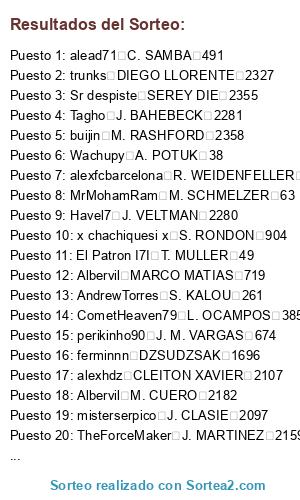Lista de participantes: Balles K. TRAPP 1, Saavexbox R. FAHRMANN 2, Balles T. ZENGIN 3, Albervil DOUGLAS P. 4, Sr despiste SAMUEL 5, Tagho L. PODOLSKI 7, TheForceMaker S. UMTITI 8, danygp89 Y. BRAHIMI 9, DaniBke E. DIER 10, x chachiquesi x G. BIA 11, Saavexbox MARTINS INDI 12, Sr despiste RUBEN VEZO 13, alexfcbarcelona J. WILLEMS 14, KaOs I AsTuR ROMULO 15, HaLiToxGCFx WILLIAM CARVALHO 16, StormFury A. BECK 17, o0 Sergi 0o ROBERTO FIRMINO 20, Die1234 NOLITO 22, alemalaga94 R. ADLER 25, P3drito14 G. CASTRO 26, alexfcbarcelona O. TOPRAK 27, xSAMU S. REINARTZ 28, benniscuba M. KADLEC 29, AndrewTorres L. BENDER 30, VOLT3R3T4 H. MASTOUR 31, perikinho90 A. SCHURRLE 33, SrPistolas86 S. KIEBLING 35, buijin G.TORE 37, Wachupy A. POTUK 38, KaOs I AsTuR M. NEUER 41, alexfcbarcelona RAFINHA 42, Prince J. BOATENG 43, Albervil H. BADSTUBER 44, tabascos89 P. LAHM 45, ferminnn M. SIMON 46, DaniBke B. SCHWEINSTEIGER 47, NandoBel78 A. ROBBEN 48, El Patron I7I T. MULLER 49, Ergion46 F. RIBERY 50, tabascos89 M. GOMEZ 51, buijin C. MBEMBA 52, SpiffiestJose Y. BOLASIE 55, Havel7 D. ALABA 57, alexfcbarcelona R. WEIDENFELLER 59, Die1234 N. SUBOTIC 61, Sr despiste M. HUMMELS 62, MrMohamRam M. SCHMELZER 63, benniscuba S. BENDER 64, buijin M. RYAN 65, P3drito14 M. GOTZE 66, SrPistolas86 S. KAGAWA 67, Shaman1987 K. GROBKREUTZ 68, P3drito14 ALEX TELLES 69, SpiffiestJose I. PERISIC 72, P3drito14 J. BLASZCZYKOWSKI 73, Havel7 R. LEWANDOWSKI 74, alex1493 JONATHAS 76, benniscuba N. SANSONE 77, Tagho DANTE 78, misterserpico M. REUS 79, VOLT3R3T4 R. KISHNA 80, danygp89 R. PEREYRA 81, MrMohamRam D. AOGO 84, alex1493 K. BELLARABI 90, CharlyFifax Y. TIELEMANS 91, trunks V. ENYEAMA 94, KaOs I AsTuR C. KRAMER 95, victub ALEIX VIDAL 96, SpiffiestJose A. NYOM 98, TheForceMaker E. DURM 100, danygp89 LUIZ ADRIAN0 101, MaDaScAs K. KOULIBALY 103, trunks M. BESIC 106, Shaman1987 B. HOWEDES 108, alexfcbarcelona L. HOLTBY 111, gabripf J. FARFAN 112, Red Dutti J. MBAKOGU 113, Adriantr127 K. HUNTELAAR 114, tabascos89 JURADO 116, alemalaga94 CHOUPO-MOTING 117, Saavexbox J. McCARTHY 119, Maybecohen O. BAUMANN 121, sergiotabascos89 D. YEDLIN 128, toni1708 T. WERNER 130, benniscuba L. DIGNE 133, StormFury D. BENAGLIO 138, Red Dutti T. KONGOLO 142, Adriantr127 JOSUE 143, alexfcbarcelona H. KANE 144, sergiotabascos89 M. MANDZUKIC 145, Ronald D. CHERYSHEV 146, ferminnn SOKRATIS 155, merayombasogo NALDO 156, pepitogrillo96 M. MARIN 159, SpiffiestJose M. ARNAUTOVIC 160, KaOs I AsTuR M. EKICI 162, adrylito GABRIEL 166, Havel7 M. SCHNEIDERLIN 167, tabascos89 X. SHAQIRI 170, Maybecohen S. KOLASINAC 171, Ergion46 DAVID NAVARRO 173, misterserpico W. KANNEMANN 175, toni1708 ADAMA 176, AndrewTorres F. MUSLERA 178, Saavexbox L. PERRIN 180, alead71 FELIPE MELO 181, TheForceMaker JORGINHO 187, SrPistolas86 L. STINDL 188, Ergion46 E. INSUA 189, Ronald CEDRIC 190, alexfcbarcelona V. TOROSIDIS 193, SrPistolas86 K. PAPADOPOULOS 195, Shaman1987 RAFA 198, javitr L. ORBAN 199, xSAMU SADIO MANE 200, trompexbox360 BETO 201, CometHeaven79 D. OPARE 203, MaDaScAs V. VAN DIJK 205, buijin K. REKIK 206, El Patron I7I FABINHO 207, Wachupy J. OBLAK 208, JG97 COKE 209, Ergion46 VIEIRINHA 210, Adriantr127 G. VAN DER WIEL 212, perikinho90 J. VERTONGHEN 214, danygp89 JEFFERSON 215, toni1708 G. RULLI 216, Havel7 R. BERTRAND 217, HaLiToxGCFx J. MURILLO 218, KaOs I AsTuR D. TADIC 223, alemalaga94 J. GIMENEZ 226, Prince L. DE JONG 227, MrMohamRam L. BIGLIA 229, danygp89 G. WIJNALDUM 233, KaOs I AsTuR A. OZBILIZ 234, rosino85 J. LENS 236, perikinho90 D. SUBASIC 237, TheForceMaker B. EMBOLO 238, joselitorojas1 ANDRE ANDRE 239, toni1708 RUBEN PARDO 240, Adriantr127 J. P. BOETIUS 242, pepitogrillo96 P. CECH 244, Balles B. IVANOVIC 246, alead71 J. TERRY 247, Balles A. COLE 248, Balles J. CANCELO 249, javitr RAUL MEIRELES 250, Sr despiste F. LAMPARD 251, MrMohamRam D. STURRIDGE 252, pepitogrillo96 D. DROGBA 253, sergiotabascos89 MATA 254, misterserpico DAVID LUIZ 256, DaniBke FERNANDO TORRES 258, victub D. DJORDJEVIC 259, alead71 J. MIKEL 260, AndrewTorres S. KALOU 261, benniscuba ALEX 262, Die1234 R. LUKAKU 264, joselitorojas1 T. HOWARD 266, alexfcbarcelona P. JAGIELKA 268, tabascos89 L. BAINES 270, perikinho90 VITOLO 271, Balles P. POGBA 279, Wachupy HERNANI 281, Tagho HUGO MALLO 282, MaDaScAs D. INGS 288, sergiotabascos89 C. DEMPSEY 289, Maybecohen C. ERKIN 290, Die1234 J. AMAVI 292, joselitorojas1 M. DEMBELE 294, ferminnn PEPE REINA 295, adrylito D. AGGER**** 298, alexhdz H. MORENO 299, DaniBke J. HENDERSON 300, MrMohamRam S. GERRARD 301, Albervil LUCAS LEIVA 302, x chachiquesi x L. SUAREZ**** 305, victub ADERLLAN SANTOS 306, Balles M. SKRTEL 307, benniscuba K. GLIK 308, MrMohamRam A. CARROLL 310, benniscuba J. HART 314, sergiotabascos89 M. RICHARDS 315, victub V. KOMPANY 316, alead71 J. LESCOTT 317, Saavexbox G. CLICHY 318, alead71 Y. TOURE 319, Saavexbox DAVID SILVA**** 321, x chachiquesi x S. NASRI 322, SrPistolas86 S. AGÜERO**** 323, diego_gallego C. TEVEZ 324, Wachupy K. TOURE 325, AaronRJ24 N. DE JONG 326, SrPistolas86 J. MILNER 327, El Patron I7I E. DZEKO 329, DaniBke M. BALOTELLI 330, misterserpico A. KOLAROV 331, xSAMU P. ZABALETA 332, Sr despiste N. ONUOHA 333, buijin Y. KONOPLYANKA**** 334, sergiotabascos89 DE GEA 337, DaniBke C. SMALLING 338, alexhdz P. EVRA 341, danygp89 NANI 342, tabascos89 A. YOUNG 345, Ergion46 W. ROONEY 346, Shaman1987 J. HERNANDEZ 347, adrylito PAULO OLIVEIRA 348, Prince Q. PROMES 353, NandoBel78 J. EVANS 354, benniscuba RAFAEL 355, perikinho90 A. VALENCIA 356, DaniBke T. KRUL 361, adrylito G. KRYCHOWIAK 362, Sr despiste ADRIEN SILVA 366, gabripf Y. CABAYE 367, misterserpico V. DARIDA 369, Albervil D. SANTON 370, Balles DENIS SUAREZ 371, perikinho90 J. DOS SANTOS 372, Balles H. BEN ARFA 375, trompexbox360 A. TAARABT 378, Saavexbox FELIPE ANDERSON 379, diego_gallego R. HAMOUMA 380, xSAMU R. SHAWCROSS 382, CometHeaven79 L. OCAMPOS 385, victub J. SOSA 394, alexhdz H. HERRERA 400, Die1234 L. CATTERMOLE 401, SpiffiestJose S. SESSEGNON 403, CometHeaven79