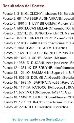 Lista de participantes: 1 K. TRAPP Balles Malmoe, 2 R. FAHRMANN TATO XD Depor, 3 T. ZENGIN Viya88 Rayo Vallecano, 4 DOUGLAS P. Viya88 Rayo Vallecano, 5 SAMUEL susa16 Alaves, 7 L. PODOLSKI sergiotabascos89 Manchester United, 8 S. UMTITI adrylito Malaga, 9 Y. BRAHIMI danygp89 Bournomenth, 10 E. DIER DaniBke New York City, 11 G. BIA x chachiquesi x Betis, 12 MARTINS INDI Saavexbox Las Palmas, 13 RUBEN VEZO iSugar v11 B. Moenchengladbach, 14 J. WILLEMS alexfcbarcelona B. Dortmund, 15 ROMULO KaOs I AsTuR Oviedo, 16 WILLIAM CARVALHO TATO XD Depor, 17 A. BECK josegomisortega Aston Villa, 20 ROBERTO FIRMINO Juanpee23 Everton, 22 NOLITO alexhdz Fiorentina, 25 R. ADLER misterserpico West Ham, 26 G. CASTRO natadp Lugo, 27 O. TOPRAK AndrewTorres Real Sociedad, 28 S. REINARTZ xSAMU Benfica, 29 M. KADLEC benniscuba Roma, 30 L. BENDER lorenbb Ol. Marsella, 31 H. MASTOUR Viya88 Rayo Vallecano, 32 B. ZUCULINI Kenstall Napoles, 33 A. SCHURRLE perikinho90 Cordoba, 35 S. KIEBLING cudeiro Ath. Bilbao, 37 G.TORE alexhdz Fiorentina, 38 A. POTUK Saavexbox Las Palmas, 41 M. NEUER KaOs I AsTuR Oviedo, 42 RAFINHA alexfcbarcelona B. Dortmund, 43 J. BOATENG lorenbb Ol. Marsella, 44 H. BADSTUBER haankko888 Angeles Galaxy, 45 P. LAHM alead71 Tottenham, 46 M. SIMON ferminnn Nantes, 47 B. SCHWEINSTEIGER DaniBke New York City, 48 A. ROBBEN NandoBel78 Real Madrid, 49 T. MULLER tabascos89 Barcelona, 50 F. RIBERY Shaman87 Cska Moscu, 51 M. GOMEZ alexhdz Fiorentina, 52 C. MBEMBA buijin Celtic, 55 Y. BOLASIE misterserpico West Ham, 57 D. ALABA Havel7 Psg, 59 R. WEIDENFELLER alexfcbarcelona B. Dortmund, 61 N. SUBOTIC Platero17 Oporto, 62 M. HUMMELS ChaoticHornet67 Norwich City, 63 M. SCHMELZER MrMohamRam Liverpool, 64 S. BENDER lorenbb Ol. Marsella, 65 M. RYAN iGosling V9 Arsenal, 66 M. GOTZE natadp Lugo, 67 S. KAGAWA SrPistolas86 Udinese, 68 K. GROBKREUTZ cudeiro Ath. Bilbao, 69 ALEX TELLES natadp Lugo, 72 I. PERISIC lorenbb Ol. Marsella, 73 J. BLASZCZYKOWSKI natadp Lugo, 74 R. LEWANDOWSKI pinolines Sevilla, 76 JONATHAS Kenstall Napoles, 77 N. SANSONE benniscuba Roma, 78 DANTE Escrich21 Hamburgo, 79 M. REUS Adriantr127 Atco. Madrid, 80 R. KISHNA zzzz jona zzzz Boca Juniors, 81 R. PEREYRA AndrewTorres Real Sociedad, 84 D. AOGO MrMohamRam Liverpool, 90 K. BELLARABI javitr Manchester City, 91 Y. TIELEMANS Red Dutti B. Leverkusen, 94 V. ENYEAMA trunks Levante, 95 C. KRAMER alexfcbarcelona B. Dortmund, 96 ALEIX VIDAL iSugar v11 B. Moenchengladbach, 98 A. NYOM iGosling iV9 Arsenal, 100 E. DURM TheForceMaker Alcorcon, 101 LUIZ ADRIAN0 trunks Levante, 103 K. KOULIBALY pinolines Sevilla, 106 M. BESIC ChaoticHornet67 Norwich City, 108 B. HOWEDES Platero17 Oporto, 111 L. HOLTBY alexfcbarcelona B. Dortmund, 112 J. FARFAN Nurhio Orlando City, 113 J. MBAKOGU Red Dutti B. Leverkusen, 114 K. HUNTELAAR Nurhio Orlando City, 117 CHOUPO-MOTING iSugar v11 B. Moenchengladbach, 119 J. McCARTHY TheForceMaker Alcorcon, 121 O. BAUMANN iSugar v11 B. Moenchengladbach, 128 D. YEDLIN sergiotabascos89 Manchester United, 130 T. WERNER Escrich21 Hamburgo, 133 L. DIGNE benniscuba Roma, 138 D. BENAGLIO StormFury elche, 142 T. KONGOLO pececillo1977 Ajax, 143 JOSUE Adriantr127 Atco. Madrid, 144 H. KANE alexfcbarcelona B. Dortmund, 145 M. MANDZUKIC Nurhio Orlando City, 146 D. CHERYSHEV josegomisortega Aston Villa, 147 J. AKAMINKO ferminnn Nantes, 155 SOKRATIS ferminnn Nantes, 156 NALDO Saavexbox Las Palmas, 159 M. MARIN cudeiro Ath. Bilbao, 160 M. ARNAUTOVIC SpiffiestJose Ol. Lyon, 162 M. EKICI HaLiToxGCFx Granada, 166 GABRIEL adrylito Malaga, 167 M. SCHNEIDERLIN iGosling V9 Arsenal, 170 X. SHAQIRI tabascos89 Barcelona, 171 S. KOLASINAC iGosling V9 Arsenal, 173 DAVID NAVARRO Viya88 Rayo Vallecano, 175 W. KANNEMANN misterserpico West Ham, 176 ADAMA toni1708 Celta, 178 F. MUSLERA alead71 Tottenham, 180 L. PERRIN Nurhio Orlando City, 181 FELIPE MELO Saavexbox Las Palmas, 187 JORGINHO Red Dutti B. Leverkusen, 188 L. STINDL SrPistolas86 Udinese, 189 E. INSUA Ergion46 Monaco, 190 CEDRIC Havel7 Psg, 193 V. TOROSIDIS alexfcbarcelona B. Dortmund, 195 K. PAPADOPOULOS iSugar v11 B. Moenchengladbach, 198 RAFA buijin Celtic, 199 L. ORBAN StormFury elche, 200 S. MANE xSAMU Benfica, 201 BETO ferminnn Nantes, 203 D. OPARE CometHeaven79 Chelsea, 205 V. VAN DIJK pinolines Sevilla, 206 K. REKIK iSugar v11 B. Moenchengladbach, 207 FABINHO danygp89 Bournomenth, 208 J. OBLAK x iReViiVaL FoX River Plate, 209 COKE Goss83 Schalke 04, 210 VIEIRINHA Ergion46 Monaco, 212 G. VAN DER WIEL benniscuba Roma, 214 J. VERTONGHEN perikinho90 Cordoba, 215 JEFFERSON Juanpee23 Everton, 216 G. RULLI toni1708 Celta, 217 R. BERTRAND Havel7 Psg, 218 J. MURILLO HaLiToxGCFx Granada, 223 D. TADIC Balles Malmoe, 226 J. GIMENEZ HaLiToxGCFx Granada, 227 L. DE JONG lorenbb Ol. Marsella, 229 L. BIGLIA MrMohamRam Liverpool, 233 G. WIJNALDUM danygp89 Bournomenth, 234 A. OZBILIZ KaOs I AsTuR Oviedo, 236 J. LENS TATO XD Depor, 237 D. SUBASIC perikinho90 Cordoba, 238 B. EMBOLO TheForceMaker Alcorcon, 239 ANDRE ANDRE AndrewTorres Real Sociedad, 240 RUBEN PARDO toni1708 Celta, 244 P. CECH cudeiro Ath. Bilbao, 245 JOSE BOSINGWA Shaman87 Cska Moscu, 246 B. IVANOVIC benniscuba Roma, 247 J. TERRY El Patron I7I Sp. Lisboa, 248 A. COLE Balles Malmoe, 249 J. CANCELO toni1708 Celta, 250 RAUL MEIRELES x iReViiVaL FoX River Plate, 251 F. LAMPARD El Patron I7I Sp. Lisboa, 252 D. STURRIDGE MrMohamRam Liverpool, 253 D. DROGBA Viya88 Rayo Vallecano, 254 MATA TATO XD Depor, 256 DAVID LUIZ misterserpico West Ham, 258 FERNANDO TORRES SpiffiestJose Ol. Lyon, 259 D. DJORDJEVIC victub Valencia, 260 J. MIKEL sergiotabascos89 Manchester United, 261 S. KALOU AndrewTorres Real Sociedad, 262 ALEX benniscuba Roma, 264 R. LUKAKU PLatero17 Oporto, 266 T. HOWARD sergiord14 Wolfsburgo, 268 P. JAGIELKA alexfcbarcelona B. Dortmund, 270 L. BAINES zzzz jona zzzz Boca Juniors, 271 VITOLO ChaoticHornet67 Norwich City, 279 P. POGBA Balles Malmoe, 281 HERNANI Escrich21 Hamburgo, 282 HUGO MALLO Escrich21 Hamburgo, 288 R. INGS pinolines Sevilla, 289 C. DEMPSEY