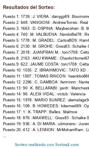Lista de participantes: 1 K. TRAPP Balles Malmoe, 2 R. FAHRMANN TATO XD Depor, 3 T. ZENGIN Albervil Rayo Vallecano, 4 DOUGLAS P. Albervil Rayo Vallecano, 5 SAMUEL Ramillos666 Alaves, 7 L. PODOLSKI CarlosBD9 Hamburgo, 8 S. UMTITI adrylito Malaga, 9 Y. BRAHIMI danygp89 Bournomenth, 10 E. DIER DaniBke New York City, 11 G. BIA x chachiquesi x Betis, 12 MARTINS INDI Saavexbox Las Palmas, 13 RUBEN VEZO buijin Celtic, 14 J. WILLEMS Juanpee23 Everton, 15 ROMULO KaOs I AsTuR Oviedo, 16 WILLIAM CARVALHO TATO XD Depor, 17 A. BECK josegomisortega Aston Villa, 20 ROBERTO FIRMINO Juanpee23 Everton, 22 NOLITO kikemedi99 Oporto, 25 R. ADLER misterserpico West Ham, 26 G. CASTRO natadp Lugo, 27 O. TOPRAK AndrewTorres Real Sociedad, 28 S. REINARTZ xSAMU Benfica, 29 M. KADLEC benniscuba Roma, 30 L. BENDER echateunfifa Ol. Marsella, 31 H. MASTOUR Albervil Rayo Vallecano, 32 B. ZUCULINI Kenstall Napoles, 33 A. SCHURRLE perikinho90 Cordoba, 35 S. KIEBLING PABLINHO Ath. Bilbao, 37 G.TORE Shaman1987 Cska, 38 A. POTUK pinolines Sevilla, 41 M. NEUER KaOs I AsTuR Oviedo, 42 RAFINHA alexfcbarcelona B. Dortmund, 43 J. BOATENG echateunfifa Ol. Marsella, 44 H. BADSTUBER haankko888 Angeles Galaxy, 45 P. LAHM alead71 Tottenham, 46 M. SIMON ferminnn Nantes, 47 B. SCHWEINSTEIGER DaniBke New York City, 48 A. ROBBEN NandoBel78 Real Madrid, 49 T. MULLER Maybecohen B. Moenchengladbach, 50 F. RIBERY alexhdz Fiorentina, 51 M. GOMEZ Shaman1987 Cska, 52 C. MBEMBA buijin Celtic, 55 Y. BOLASIE SpiffiestJose Ol. Lyon, 57 D. ALABA Havel7 Psg, 59 R. WEIDENFELLER alexfcbarcelona B. Dortmund, 61 N. SUBOTIC kikemedi99 Oporto, 62 M. HUMMELS ChaoticHornet67 Norwich City, 63 M. SCHMELZER MrMohamRam Liverpool, 64 S. BENDER echateunfifa Ol. Marsella, 65 M. RYAN Shaman1987 Cska, 66 M. GOTZE natadp Lugo, 67 S. KAGAWA SrPistolas86 Udinese, 68 K. GROBKREUTZ PABLINHO Ath. Bilbao, 69 ALEX TELLES natadp Lugo, 72 I. PERISIC echateunfifa Ol. Marsella, 73 J. BLASZCZYKOWSKI natadp Lugo, 74 R. LEWANDOWSKI pinolines Sevilla, 76 JONATHAS Kenstall Napoles, 77 N. SANSONE benniscuba Roma, 78 DANTE CarlosBD9 Hamburgo, 79 M. REUS Adriantr127 Atco. Madrid, 80 R. KISHNA zzzz jona zzzz Boca Juniors, 81 R. PEREYRA AndrewTorres Real Sociedad, 84 D. AOGO MrMohamRam Liverpool, 90 K. BELLARABI javitr Manchester City, 91 Y. TIELEMANS Red Dutti B. Leverkusen, 94 V. ENYEAMA trunks Levante, 95 C. KRAMER alexfcbarcelona B. Dortmund, 96 ALEIX VIDAL victub Valencia, 98 A. NYOM iGosling iV9 Arsenal, 100 E. DURM TheForceMaker Alcorcon, 101 LUIZ ADRIAN0 trunks Levante, 103 K. KOULIBALY pinolines Sevilla, 106 M. BESIC ChaoticHornet67 Norwich City, 108 B. HOWEDES kikemedi99 Oporto, 111 L. HOLTBY alexfcbarcelona B. Dortmund, 112 J. FARFAN Nurhio Orlando City, 113 J. MBAKOGU buijin Celtic, 114 K. HUNTELAAR Nurhio Orlando City, 117 CHOUPO-MOTING adrylito Malaga, 119 J. McCARTHY TheForceMaker Alcorcon, 121 O. BAUMANN Maybecohen B. Moenchengladbach, 128 D. YEDLIN sergiotabascos89 Manchester United, 130 T. WERNER HaLiToxGCFx Granada, 133 L. DIGNE benniscuba Roma, 138 D. BENAGLIO StormFury elche, 142 T. KONGOLO pececillo1977 Ajax, 143 JOSUE Adriantr127 Atco. Madrid, 144 H. KANE alexfcbarcelona B. Dortmund, 145 M. MANDZUKIC Nurhio Orlando City, 146 D. CHERYSHEV josegomisortega Aston Villa, 147 J. AKAMINKO ferminnn Nantes, 155 SOKRATIS ferminnn Nantes, 156 NALDO Saavexbox Las Palmas, 159 M. MARIN PABLINHO Ath. Bilbao, 160 M. ARNAUTOVIC SpiffiestJose Ol. Lyon, 162 M. EKICI Ramillos666 Alaves, 166 GABRIEL adrylito Malaga, 167 M. SCHNEIDERLIN iGosling V9 Arsenal, 170 X. SHAQIRI tabascos89 Barcelona, 171 S. KOLASINAC iGosling V9 Arsenal, 173 DAVID NAVARRO Albervil Rayo Vallecano, 175 W. KANNEMANN misterserpico West Ham, 176 ADAMA toni1708 Celta, 178 F. MUSLERA alead71 Tottenham, 180 L. PERRIN Nurhio Orlando City, 181 FELIPE MELO Saavexbox Las Palmas, 187 JORGINHO buijin Celtic, 188 L. STINDL SrPistolas86 Udinese, 189 E. INSUA Ergion46 Monaco, 190 CEDRIC Havel7 Psg, 193 V. TOROSIDIS alexfcbarcelona B. Dortmund, 195 K. PAPADOPOULOS Maybecohen B. Moenchengladbach, 198 RAFA Shaman1987 Cska, 199 L. ORBAN StormFury elche, 200 S. MANE TheForceMaker Alcorcon, 201 BETO ferminnn Nantes, 203 D. OPARE CometHeaven79 Chelsea, 205 V. VAN DIJK pinolines Sevilla, 206 K. REKIK buijin Celtic, 207 FABINHO El Patron I7I Sp. Lisboa, 208 J. OBLAK x iReViiVaL FoX River Plate, 209 COKE Goss83 Schalke 04, 210 VIEIRINHA Ergion46 Monaco, 212 G. VAN DER WIEL benniscuba Roma, 214 J. VERTONGHEN perikinho90 Cordoba, 215 JEFFERSON Red Dutti B. Leverkusen, 216 G. RULLI toni1708 Celta, 217 R. BERTRAND Havel7 Psg, 218 J. MURILLO HaLiToxGCFx Granada, 223 D. TADIC Balles Malmoe, 226 J. GIMENEZ HaLiToxGCFx Granada, 227 L. DE JONG echateunfifa Ol. Marsella, 229 L. BIGLIA MrMohamRam Liverpool, 233 G. WIJNALDUM danygp89 Bournomenth, 234 A. OZBILIZ KaOs I AsTuR Oviedo, 236 J. LENS TATO XD Depor, 237 D. SUBASIC perikinho90 Cordoba, 238 B. EMBOLO TheForceMaker Alcorcon, 239 ANDRE ANDRE AndrewTorres Real Sociedad, 240 RUBEN PARDO toni1708 Celta, 244 P. CECH PABLINHO Ath. Bilbao, 245 JOSE BOSINGWA alexhdz Fiorentina, 246 B. IVANOVIC benniscuba Roma, 247 J. TERRY El Patron I7I Sp. Lisboa, 248 A. COLE Balles Malmoe, 249 J. CANCELO toni1708 Celta, 250 RAUL MEIRELES x iReViiVaL FoX River Plate, 251 F. LAMPARD El Patron I7I Sp. Lisboa, 252 D. STURRIDGE MrMohamRam Liverpool, 253 D. DROGBA Albervil Rayo Vallecano, 254 MATA kikemedi99 Oporto, 256 DAVID LUIZ misterserpico West Ham, 258 FERNANDO TORRES iGosling V9 Arsenal, 259 D. DJORDJEVIC victub Valencia, 260 J. MIKEL alemalaga94 Bayern Munich, 261 S. KALOU AndrewTorres Real Sociedad, 262 ALEX benniscuba Roma, 264 R. LUKAKU kikemedi99 Oporto, 266 T. HOWARD sergiord14 Wolfsburgo, 268 P. JAGIELKA alexfcbarcelona B. Dortmund, 270 L. BAINES zzzz jona zzzz Boca Juniors, 271 VITOLO Saavexbox Las Palmas, 279 P. POGBA Balles Malmoe, 281 HERNANI alemalaga94 Bayern Munich, 282 HUGO MALLO CarlosBD9 Hamburgo, 288 R. INGS pinolines Sevilla, 289 C. DEMPSEY El Patron I7I Sp. Lisboa, 290 C. ERKIN Maybecohen B. Moe