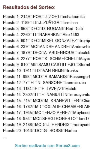 Lista de participantes: 1 POR K. TRAPP Balles, 2 POR R. FAHRMANN TATO XD, 3 POR T. ZENGIN Albervil, 4 LD DOUGLAS P. Albervil, 5 MD SAMUEL adrylito, 7 MI L. PODOLSKI CarlosBD9, 8 DFC S. UMTITI adrylito, 9 EI Y. BRAHIMI danygp89, 10 DFC E. DIER DaniBke, 11 MI G. BIA x chachiquesi x, 12 DFC MARTINS INDI Saavexbox, 13 DFC RUBEN VEZO ChaoticHornet67, 14 LI J. WILLEMS alexfcbarcelona, 15 MCD ROMULO KaOs I AsTuR, 16 MCD WILLIAM CARVALHO TATO XD, 17 LD A. BECK StormFury, 20 MCO ROBERTO FIRMINO Passenger0011, 22 EI NOLITO andrey8y8, 25 POR R. ADLER misterserpico, 26 MC G. CASTRO natadp, 27 DFC O. TOPRAK javitr, 28 MCD S. REINARTZ xSAMU, 29 DFC M. KADLEC benniscuba, 30 MCD L. BENDER echateunfifa, 31 MCO H. MASTOUR zzzz jona zzzz, 32 MC B. ZUCULINI Alex1493, 33 MI A. SCHURRLE perikinho90, 35 DC S. KIEBLING PABLINHO, 37 MD G.TORE Shaman1987, 38 MI A. POTUK pinolines, 41 POR M. NEUER KaOs I AsTuR, 42 LD RAFINHA alexfcbarcelona, 43 DFC J. BOATENG echateunfifa, 44 DFC H. BADSTUBER PYRA el capo, 45 MCD P. LAHM SrPistolas86, 46 DC M. SIMON ferminnn, 47 MC B. SCHWEINSTEIGER DaniBke, 48 MD A. ROBBEN NandoBel78, 49 MD T. MULLER Maybecohen, 50 MI F. RIBERY alexhdz, 51 DC M. GOMEZ**** javitr, 52 DFC C. MBEMBA buijin, 55 MI Y. BOLASIE SpiffiestJose, 57 LI D. ALABA Havel7, 59 POR R. WEIDENFELLER alexfcbarcelona, 61 DFC N. SUBOTIC andrey8y8, 62 DFC M. HUMMELS ChaoticHornet67, 63 LI M. SCHMELZER MrMohamRam, 64 MCD S. BENDER Saavexbox, 65 POR M. RYAN buijin, 66 MCO M. GOTZE natadp, 67 MCO S. KAGAWA SrPistolas86, 68 MI K. GROBKREUTZ PABLINHO, 69 LI ALEX TELLES natadp, 72 MI I. PERISIC Saavexbox, 73 MD J. BLASZCZYKOWSKI natadp, 74 DC R. LEWANDOWSKI Havel7, 76 DC JONATHAS Alex1493, 77 EI N. SANSONE benniscuba, 78 DFC DANTE CarlosBD9, 80 EI R. KISHNA zzzz jona zzzz, 81 MCO R. PEREYRA sergiotabascos89, 84 LI D. AOGO MrMohamRam, 90 MD K. BELLARABI javitr, 91 MC Y. TIELEMANS Red Dutti, 94 POR V. ENYEAMA trunks, 95 MCD C. KRAMER KaOs I AsTuR, 96 MD ALEIX VIDAL victub, 98 LD A. NYOM SpiffiestJose, 100 LI E. DURM TheForceMaker, 101 DC LUIZ ADRIAN0 trunks, 103 DFC K. KOULIBALY pinolines, 106 MCD M. BESIC Saavexbox, 108 DFC B. HOWEDES andrey8y8, 111 MCO L. HOLTBY alexfcbarcelona, 112 MCO J. FARFAN Nurhio, 113 DC J. MBAKOGU buijin, 114 DC K. HUNTELAAR trompexbox360, 116 MI JURADO tabascos89, 117 DC CHOUPO-MOTING Ramillos666, 119 MCD J. McCARTHY ferminnn, 121 POR O. BAUMANN Maybecohen, 128 LD D. YEDLIN sergiotabascos89, 130 MI T. WERNER**** Balles, 133 LI L. DIGNE benniscuba, 138 POR D. BENAGLIO StormFury, 142 DFC T. KONGOLO pececillo1977, 143 DFC JOSUE Adriantr127, 144 DC H. KANE alexfcbarcelona, 145 DC M. MANDZUKIC Nurhio, 146 MI D. CHERYSHEV MrMohamRam, 147 DFC J. AKAMINKO buijin, 155 DFC SOKRATIS ferminnn, 156 DFC NALDO Saavexbox, 159 MCO M. MARIN PABLINHO, 160 MI M. ARNAUTOVIC SpiffiestJose, 162 MCO M. EKICI Ramillos666, 166 DFC GABRIEL adrylito, 167 MCD M. SCHNEIDERLIN Havel7, 170 MD X. SHAQIRI tabascos89, 171 LI S. KOLASINAC Maybecohen, 173 DFC DAVID NAVARRO Ergion46, 175 DFC W. KANNEMANN misterserpico, 176 ED ADAMA toni1708, 178 POR F. MUSLERA alead71, 180 DFC L. PERRIN Nurhio, 181 MCD FELIPE MELO sergiotabascos89, 187 MCD JORGINHO Adriantr127, 188 MCO L. STINDL SrPistolas86, 189 LI E. INSUA Ergion46, 190 LD CEDRIC Havel7, 193 LD V. TOROSIDIS alexfcbarcelona, 195 DFC K. PAPADOPOULOS Maybecohen, 198 MI RAFA javitr, 199 LI L. ORBAN StormFury, 200 SD SADIO MANE xSAMU, 201 POR BETO trompexbox360, 203 LD D. OPARE CometHeaven79, 205 DFC V. VAN DIJK pinolines, 206 DFC K. REKIK buijin, 207 LD FABINHO El Patron I7I, 208 POR J. OBLAK x iReViiVaL FoX, 209 LD COKE Goss83, 210 MD VIEIRINHA Ergion46, 212 LD G. VAN DER WIEL tabascos89, 214 DFC J. VERTONGHEN perikinho90, 215 LI JEFFERSON iGosling v9, 216 POR G. RULLI toni1708, 217 LI R. BERTRAND Havel7, 218 DFC J. MURILLO HaLiToxGCFx, 223 MI D. TADIC Balles, 226 DFC J. GIMENEZ HaLiToxGCFx, 227 DC L. DE JONG echateunfifa, 229 MCD L. BIGLIA MrMohamRam, 233 MCO G. WIJNALDUM danygp89, 234 ED A. OZBILIZ KaOs I AsTuR, 236 EI J. LENS TATO XD, 237 POR D. SUBASIC perikinho90, 238 DC B. EMBOLO TheForceMaker, 239 MC ANDRE ANDRE AndrewTorres, 240 MC RUBEN PARDO toni1708, 242 EI J. P. BOETIUS alemalaga94, 244 POR P. CECH PABLINHO, 246 LD B. IVANOVIC benniscuba, 247 DFC J. TERRY alead71, 248 LI A. COLE Balles, 249 LD J. CANCELO toni1708, 250 MC RAUL MEIRELES x iReViiVaL FoX, 251 MC F. LAMPARD sergiotabascos89, 252 DC D. STURRIDGE MrMohamRam, 253 DC D. DROGBA echateunfifa, 254 MD MATA andrey8y8, 256 DFC DAVID LUIZ misterserpico, 258 DC FERNANDO TORRES tabascos89, 259 DC D. DJORDJEVIC victub, 260 MCD J. MIKEL alemalaga94, 261 DC S. KALOU AndrewTorres, 262 DFC ALEX benniscuba, 264 DC R. LUKAKU andrey8y8, 266 POR T. HOWARD sergiord14, 268 DFC P. JAGIELKA alexfcbarcelona, 270 LI L. BAINES zzzz jona zzzz, 271 MI VITOLO perikinho90, 279 MC P. POGBA Balles, 281 MD HERNANI alemalaga94, 282 LD HUGO MALLO CarlosBD9, 288 DC R. INGS pinolines, 289 DC C. DEMPSEY El Patron I7I, 290 LI C. ERKIN Maybecohen, 292 LI J. AMAVI andrey8y8, 294 MC M. DEMBELE sergiord14, 295 POR PEPE REINA tabascos89, 298 DFC D. AGGER alexhdz, 299 DFC H. MORENO NandoBel78, 300 MC J. HENDERSON DaniBke, 301 MC S. GERRARD MrMohamRam, 302 MCD LUCAS LEIVA Albervil, 305 DC L. SUAREZ xSAMU, 306 DFC ADERLAN SANTOS victub, 307 DFC M. SKRTEL sergiotabascos89, 308 DFC K. GLIK benniscuba, 310 DC A. CARROLL MrMohamRam, 314 POR J. HART benniscuba, 315 DFC M. RICHARDS CarlosBD9, 316 DFC V. KOMPANY victub, 317 DFC J. LESCOTT alead71, 318 LI G. CLICHY Nurhio, 319 MC Y. TOURE Shaman1987, 321 MCO DAVID SILVA zzzz jona zzzz, 322 MI S. NASRI x chachiquesi x, 323 DC S. AGÜERO alemalaga94, 324 DC C. TEVEZ Nurhio, 325 DFC K. TOURE x iReViiVaL FoX, 326 MCD N. DE JONG ulimoreno, 327 MC J. MILNER perikinho90, 329 DC E. DZEKO Passenger0011, 330 DC M. BALOTELLI DaniBke, 331 LI A. KOLAROV misterserpico, 332 LD P. ZABALETA xSAMU, 333 DFC N. ONUOHA ChaoticHornet67, 334 EI Y. KONOPLYANKA Balles, 337 POR DE GEA n0jan, 338 DFC C. SMALLING DaniBke, 340 DFC N. VIDIC Shaman198