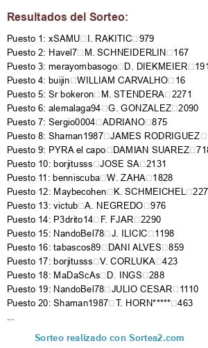 Lista de participantes: Balles K. TRAPP 1, JG97 R. FAHRMANN 2, TheForceMaker T. ZENGIN***** 3, ADONERI4 DOUGLAS P. 4, Sr bokeron SAMUEL 5, AndrewTorres J. SOSA 6, Tagho L. PODOLSKI 7, javitr S. UMTITI 8, JuanluMlg Y. BRAHIMI 9, DaniBke E. DIER 10, x chachiquesi x G. BIA 11, borjitusss MARTINS INDI 12, Sr bokeron RUBEN VEZO 13, Ronald J. WILLEMS 14, KaOs I AsTuR ROMULO 15, buijin WILLIAM CARVALHO 16, StormFury A. BECK 17, P3drito14 M. LEMOS 19, JoseAbadCCF ROBERTO FIRMINO 20, Die1234 NOLITO 22, buijin G. SIGUROSSON 23, AndrewTorres R. ADLER 25, P3drito14 G. CASTRO 26, misterserpico O. TOPRAK 27, Red Dutti L. BENDER 30, MaDaScAs H. MASTOUR 31, perikinho90 A. SCHURRLE 33, javitr S. KIEBLING 35, javitr G.TORE 37, rukasnarcea A. POTUK 38, KaOs I AsTuR M. NEUER 41, FonFenoso RAFINHA 42, merayombasogo J. BOATENG 43, Albervil H. BADSTUBER 44, tabascos89 P. LAHM 45, ferminnn M. SIMON 46, DaniBke B. SCHWEINSTEIGER 47, NandoBel78 A. ROBBEN 48, Maybecohen T. MULLER 49, Ergion46 F. RIBERY 50, FonFenoso M. GOMEZ 51, buijin C. MBEMBA 52, SpiffiestJose Y. BOLASIE 55, Havel7 D. ALABA 57, sergiotabascos89 R. WEIDENFELLER 59, PYRA el capo N. SUBOTIC 61, Sr bokeron M. HUMMELS 62, MrMohamRam M. SCHMELZER 63, benniscuba S. BENDER 64, adrylito M. RYAN 65, AndrewTorres M. GOTZE 66, SrPistolas86 S. KAGAWA 67, II ANTI CULE II K. GROBKREUTZ 68, P3drito14 ALEX TELLES 69, SpiffiestJose I. PERISIC 72, P3drito14 J. BLASZCZYKOWSKI 73, Havel7 R. LEWANDOWSKI 74, Albervil A. PEÑARANDA 75, Sergio0004 JONATHAS 76, JG97 N. SANSONE 77, Tagho DANTE 78, misterserpico M. REUS 79, Ozora10Tsubasa R. KISHNA 80, danygp89 R. PEREYRA 81, MrMohamRam D. AOGO 84, ferminnn R. SEMEDO 85, Sergio0004 K. BELLARABI 90, javitr Y. TIELEMANS***** 91, CharlyFifax EMRE MOR 92, rosino85 Y. NESYRI 93, trunks V. ENYEAMA 94, KaOs I AsTuR C. KRAMER 95, victub ALEIX VIDAL 96, SpiffiestJose A. NYOM 98, TheForceMaker E. DURM 100, P3drito14 LUIZ ADRIAN0 101, MaDaScAs K. KOULIBALY 103, trunks M. BESIC 106, tabascos89 B. HOWEDES 108, buijin L. HOLTBY 111, misterserpico J. MBAKOGU 113, Adriantr127 K. HUNTELAAR 114, tabascos89 JURADO 116, Shaman1987 CHOUPO-MOTING 117, CharlyFifax J. McCARTHY 119, Maybecohen O. BAUMANN 121, Ergion46 D. YEDLIN 128, toni1708 T. WERNER 130, benniscuba L. DIGNE 133, StormFury D. BENAGLIO 138, Red Dutti T. KONGOLO 142, Adriantr127 JOSUE 143, alexfcbarcelona H. KANE 144, trompexbox360 M. MANDZUKIC 145, Albervil D. CHERYSHEV 146, Ronald SOKRATIS 155, merayombasogo NALDO 156, FonFenoso M. MARIN 159, SpiffiestJose M. ARNAUTOVIC 160, JuanluMlg M. EKICI 162, alemalaga94 GABRIEL 166, Havel7 M. SCHNEIDERLIN 167, tabascos89 X. SHAQIRI 170, Maybecohen S. KOLASINAC 171, Ergion46 DAVID NAVARRO 173, toni1708 ADAMA 176, AndrewTorres F. MUSLERA 178, Saavexbox L. PERRIN 180, alead71 FELIPE MELO 181, TheForceMaker JORGINHO 187, SrPistolas86 L. STINDL 188, Ergion46 E. INSUA 189, Havel7 CEDRIC 190, alexfcbarcelona V. TOROSIDIS 193, SrPistolas86 K. PAPADOPOULOS 195, SrPistolas86 RAFA 198, StormFury L. ORBAN 199, xSAMU SADIO MANE 200, alemalaga94 BETO 201, CometHeaven79 D. OPARE 203, MaDaScAs V. VAN DIJK 205, buijin K. REKIK 206, El Patron I7I FABINHO 207, rukasnarcea J. OBLAK 208, JG97 COKE 209, Ergion46 VIEIRINHA 210, Adriantr127 G. VAN DER WIEL 212, perikinho90 J. VERTONGHEN 214, danygp89 JEFFERSON 215, toni1708 G. RULLI 216, Havel7 R. BERTRAND 217, El Patron I7I J. MURILLO 218, Shaman1987 D. TADIC 223, buijin J. GIMENEZ 226, Havel7 L. DE JONG 227, MrMohamRam L. BIGLIA 229, danygp89 G. WIJNALDUM 233, KaOs I AsTuR A. OZBILIZ 234, rosino85 J. LENS 236, perikinho90 D. SUBASIC 237, TheForceMaker B. EMBOLO 238, joselitorojas1 ANDRE ANDRE 239, toni1708 RUBEN PARDO 240, Adriantr127 J. P. BOETIUS 242, FonFenoso P. CECH 244, Balles B. IVANOVIC 246, alead71 J. TERRY 247, xSAMU A. COLE 248, javitr J. CANCELO 249, trompexbox360 F. LAMPARD 251, MrMohamRam D. STURRIDGE 252, FonFenoso D. DROGBA 253, JuanluMlg MATA 254, misterserpico DAVID LUIZ 256, joxepoATH FERNANDO TORRES 258, victub D. DJORDJEVIC 259, joxepoATH J. MIKEL 260, AndrewTorres S. KALOU 261, Die1234 R. LUKAKU 264, joselitorojas1 T. HOWARD 266, alexfcbarcelona P. JAGIELKA 268, tabascos89 L. BAINES 270, perikinho90 VITOLO 271, Balles P. POGBA 279, rukasnarcea HERNANI 281, Tagho HUGO MALLO 282, MaDaScAs D. INGS 288, Adriantr127 C. DEMPSEY 289, Shaman1987 C. ERKIN 290, SpiffiestJose J. AMAVI 292, AndrewTorres M. DEMBELE 294, ferminnn PEPE REINA 295, Sergio0004 H. MORENO 299, DaniBke J. HENDERSON 300, MrMohamRam S. GERRARD 301, Albervil LUCAS LEIVA 302, xSAMU L. SUAREZ 305, victub ADERLLAN SANTOS 306, Ramses17 M. SKRTEL 307, benniscuba K. GLIK 308, MrMohamRam A. CARROLL 310, benniscuba J. HART 314, ADONERI4 M. RICHARDS 315, victub V. KOMPANY 316, alead71 J. LESCOTT 317, Saavexbox G. CLICHY 318, alead71 Y. TOURE 319, JuanluMlg DAVID SILVA 321, x chachiquesi x S. NASRI 322, benniscuba S. AGÜERO 323, JuanluMlg C. TEVEZ 324, rukasnarcea K. TOURE 325, Ramses17 N. DE JONG 326, SrPistolas86 J. MILNER 327, CometHeaven79 E. DZEKO 329, DaniBke M. BALOTELLI 330, misterserpico A. KOLAROV 331, Albervil P. ZABALETA 332, Sr bokeron N. ONUOHA 333, NandoBel78 Y. KONOPLYANKA 334, merayombasogo DE GEA 337, adrylito C. SMALLING 338, joxepoATH P. EVRA 341, danygp89 NANI 342, tabascos89 A. YOUNG 345, Ergion46 W. ROONEY 346, sergiotabascos89 J. HERNANDEZ 347, adrylito PAULO OLIVEIRA 348, AndrewTorres Q. PROMES 353, perikinho90 J. EVANS 354, benniscuba RAFAEL 355, perikinho90 A. VALENCIA 356, NandoBel78 FRED 359, joselitorojas1 T. KRUL 361, adrylito G. KRYCHOWIAK 362, Sr bokeron ADRIEN SILVA 366, borjitusss Y. CABAYE 367, Die1234 V. DARIDA 369, sergiotabascos89 D. SANTON 370, HaLiToxGCFx DENIS SUAREZ 371, perikinho90 J. DOS SANTOS 372, Balles H. BEN ARFA 375, StormFury FELIPE ANDERSON 379, diego_gallego R. HAMOUMA 380, MaDaScAs R. SHAWCROSS 382, trompexbox360 L. OCAMPOS 385, joxepoATH H. HERRERA 400, PYRA el capo L. CATTERMOLE 401, SpiffiestJose S. SESSEGNON 403, CometHeaven79 A. BABA 405, SpiffiestJose D. KLAASSEN 406, alemalaga