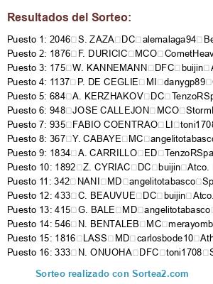 Lista de participantes: 6 S. RIETHER LD stormfury Touluse, 14 J. WILLEMS LI merayombasogo Boca Juniors, 18 I. VORSAH DFC CometHeaven79 Elche, 21 C. OBASI MD merayombasogo Boca Juniors, 23 G. SIGUROSSON MCO toni1708 Sevilla, 33 A. SCHURRLE MI MrMohamRam Espanyol, 37 G. TORE MI NandoBel78 Leganes, 39 E. DERDIYOK SD perikinho90 Lugo, 41 M. NEUER POR carlosbode10 Ath. Bilbao, 44 H. BADSTUBER DFC SSpecializeDD Manchester City, 49 T. MULLER MD ulimoreno Juventus, 50 F. RIBERY MI perikinho90 Lugo, 54 A. TYMOSHCHUK MCD carlosbode10 Ath. Bilbao, 58 I. OLIC DC toni1708 Sevilla, 59 R. WEIDENFELLER POR perikinho90 Lugo, 61 N. SUBOTIC DFC perikinho90 Lugo, 72 I. PERISIC**** MI MrMohamRam Espanyol, 73 J. BLASZCZYKOWSKI MD merayombasogo Boca Juniors, 79 M. REUS MI NandoBel78 Leganes, 81 R. PEREYRA**** MC angelitotabascos Sp. Lisboa, 82 J. DROBNY POR adrylito Malaga, 87 M. JANSEN LI TenzoRSpaiN Sp. Gijon, 98 A. NYOM LD CometHeaven79 Elche, 99 K. RAUSCH LI TenzoRSpaiN Sp. Gijon, 100 E. DURM LI alemalaga94 Benfica, 108 B. HOWEDES DFC ulimoreno Juventus, 112 J. FARFAN MD perikinho90 Lugo, 113 J. MBAKOGU DC angelitotabasco Sp. Lisboa, 114 K. HUNTELAAR DC carlosbode10 Ath. Bilbao, 128 D. YEDLIN LD angelitotabasco Sp. Lisboa, 130 T. WERNER MD adrylito Malaga, 142 T. KONGOLO DFC CometHeaven79 Elche, 146 D. CHERYSHEV MI buijin Atco. Madrid, 158 A. HUNT MCO StormFury Touluse, 161 C. PIZARRO DC TenzoRSpaiN Sp. Gijon, 171 S. KOLASINAC DFC merayombasogo Boca Juniors, 172 V. STOCKER MI danygp89 Chelsea, 175 W. KANNEMANN DFC buijin Atco. Madrid, 181 FELIPE MELO MCD MrMohamRam Espanyol, 183 T. HUBOCAN DFC buijin Atco. Madrid, 187 JORGINHO MC MrMohamRam Espanyol, 199 L. ORBAN LI adrylito Malaga, 200 S. MANE EI TenzoRSpaiN Sp. Gijon, 215 JEFFERSON LI MrMohamRam Espanyol, 227 L. DE JONG DC toni1708 Sevilla, 233 G. WIJNALDUM MCO danygp89 Chelsea, 234 A. OZBILIZ ED ulimoreno Juventus, 235 O. TOIVONEN DC MrMohamRam Espanyol, 244 P. CECH POR merayombasogo Boca Juniors, 248 A. COLE LI perikinho90 Lugo, 253 D. DROGBA DC MrMohamRam Espanyol, 254 MATA MCO StormFury Touluse, 261 S. KALOU DC danygp89 Chelsea, 265 M. ESSIEN MC toni1708 Sevilla, 268 P. JAGIELKA DFC danygp89 Chelsea, 271 VITOLO MI MrMohamRam Espanyol, 292 J. AMAVI LI adrylito Malaga, 296 M. KELLY LD merayombasogo Boca Juniors, 298 D. AGGER DFC angelitotabasco Sp. Lisboa, 302 LUCAS LEIVA MCD danygp89 Chelsea, 318 G. CLICHY LI NandoBel78 Leganes, 319 Y. TOURE MC CometHeaven79 Elche, 321 DAVID SILVA MCO merayombasogo Boca Juniors, 323 S. AGÜERO DC perikinho90 Lugo, 327 J. MILNER MD carlosbode10 Ath. Bilbao, 332 P. ZABALETA LD toni1708 Sevilla, 333 N. ONUOHA DFC toni1708 Sevilla, 337 DE GEA POR MrMohamRam Espanyol, 339 R. FERDINAND DFC danygp89 Chelsea, 340 N. VIDIC DFC SSpecializeDD Manchester City, 341 P. EVRA LI danygp89 Chelsea, 342 NANI MD angelitotabasco Sp. Lisboa, 347 J. HERNANDEZ DC angelitotabasco Sp. Lisboa, 349 D. FLETCHER MC SSpecializeDD Manchester City, 355 RAFAEL LD NandoBel78 Leganes, 365 G. OBERTAN MD CometHeaven79 Elche, 367 Y. CABAYE MC angelitotabasco Sp. Lisboa, 371 DENIS SUAREZ MCO buijin Atco. Madrid, 374 D. BA DC angelitotabasco Sp. Lisboa, 382 R. SHAWCROSS DFC toni1708 Sevilla, 385 L. OCAMPOS ED StormFury Touluse, 386 A. DZYUBA DC toni1708 Sevilla, 394 J. SOSA MCO danygp89 Chelsea, 402 K. RICHARDSON LI alemalaga94 Benfica, 403 S. SESSEGNON MCO TenzoRSpaiN Sp. Gijon, 413 S. PARKER MCD SSpecializeDD Manchester City, 414 L. MODRIC MC adrylito Malaga, 415 G. BALE MD angelitotabasco Sp. Lisboa, 416 R. VAN DER VAART MCO carlosbode10 Ath. Bilbao, 418 GOMES POR NandoBel78 Leganes, 422 J. DEFOE DC toni1708 Sevilla, 429 G. DOS SANTOS DC merayombasogo Boca Juniors, 433 C. BEAUVUE DC buijin Atco. Madrid, 434 SAUL MCD StormFury Touluse, 439 A. CORREA MCO TenzoRSpaiN Sp. Gijon, 449 S. GIVEN POR toni1708 Sevilla, 454 V. ABOUBAKAR DC alemalaga94 Benfica, 463 T. HORN POR MrMohamRam Espanyol, 467 P. MERTESACKER DFC TenzoRSpaiN Sp. Gijon, 470 A. SONG MCD alemalaga94 Benfica, 473 T. WALCOTT MD MrMohamRam Espanyol, 474 R. VAN PERSIE DC merayombasogo Boca Juniors, 477 L. KOSCIELNY DFC NandoBel78 Leganes, 479 A. ARSHAVIN EI toni1708 Sevilla, 484 J. DJOUROU DFC SSpecializeDD Manchester City, 485 C. CHAMBERS LD adrylito Malaga, 494 R. EREMENKO MCO TenzoRSpaiN Sp. Gijon, 507 L. GORETZA MD NandoBel78 Leganes, 508 M. GASPAR LD perikinho90 Lugo, 514 LEE CHUNG-YONG MD merayombasogo Boca Juniors, 518 R. GREEN POR perikinho90 Lugo, 524 C. N`DIE DC carlosbode10 Ath. Bilbao, 527 M. BOLLY MD angelitotabasco Sp. Lisboa, 546 N. BENTALEB MC merayombasogo Boca Juniors, 552 MARLOS MCO danygp89 Chelsea, 560 LUCAS MELANO DC ulimoreno Juventus, 565 M. DARMIAN MI adrylito Malaga, 568 K. WIMMER DFC MrMohamRam Espanyol, 573 PIZZI MCO NandoBel78 Leganes, 626 S. ETOO DC TenzoRSpaiN Sp. Gijon, 631 P. MAMAEV MC toni1708 Sevilla, 653 S. RYZHIKOV POR StormFury Touluse, 654 S. BOCCHETTI DFC CometHeaven79 Elche, 655 C. ANSALDI LI NandoBel78 Leganes, 664 CARLOS EDUARDO MCO NandoBel78 Leganes, 678 D. CRISCITO LI ulimoreno Juventus, 683 DANNY EI SSpecializeDD Manchester City, 684 A. KERZHAKOV DC TenzoRSpaiN Sp. Gijon, 689 V. BYSTROV ED toni1708 Sevilla, 703 B. TREMOULINAS LI perikinho90 Lugo, 736 S. M'BIA MCD CometHeaven79 Elche, 745 R. FANNI LD angelitotabasco Sp. Lisboa, 746 A. GIGNAC DC merayombasogo Boca Juniors, 758 M. GONALONS MCD ulimoreno Juventus, 774 J. MENEZ ED StormFury Touluse, 777 K. GAMEIRO DC toni1708 Sevilla, 784 S. RUFFIER POR ulimoreno Juventus, 786 B. SAKO MI TenzoRSpaiN Sp. Gijon, 826 AMOREBIETA DFC carlosbode10 Ath. Bilbao, 828 JAVI MARTINEZ DFC carlosbode10 Ath. Bilbao, 829 ANDER HERRERA MC alemalaga94 Benfica, 831 FERNANDO LLORENTE DC carlosbode10 Ath. Bilbao, 832 MUNIAIN EI carlosbode10 Ath. Bilbao, 838 DOMINGUEZ DFC danygp89 Chelsea, 844 FALCAO DC perikinho90 Lugo, 846 D. GODIN DFC MrMohamRam Espanyol, 853 DIEGO COSTA DC alemalaga94 Benfica, 854 SERGIO ASENJO POR buijin Atco. Madrid, 856 RAUL GARCIA MD TenzoRSpaiN Sp. Gijon, 859 DANI ALVES LD merayombasogo Boca Juniors, 861 
