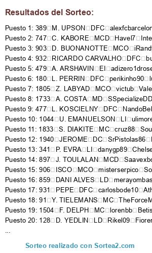 Lista de participantes: 1 K. TRAPP POR Rikel09 Fiorentina, 2 R. FAHRMANN POR misterserpico Sounders, 3 T. ZENGIN POR Pepitogrillo96 Real Sociedad, 4 DOUGLAS P. LD Pepitogrillo96 Real Sociedad, 6 S. RIETHER LD Havel7 Inter de Milan, 7 L. PODOLSKI MI Havel7 Inter de Milan, 8 S. UMTITI DFC TheForceMaker Alcorcon, 9 Y. BRAHIMI EI misterserpico Sounders, 10 E. DIER DFC Pepitogrillo96 Real Sociedad, 12 MARTINS INDI DFC Pepitogrillo96 Real Sociedad, 13 RUBEN VEZO DFC Pepitogrillo96 Real Sociedad, 14 J. WILLEMS LI adrylito Malaga, 15 ROMULO MCD Pepitogrillo96 Real Sociedad, 16 WILLIAMS CARLVALHO MCD Pepitogrillo96 Real Sociedad, 17 A. BECK LD SeaL KapO x Napoles, 18 I. VORSAH DFC adrylito Malaga, 19 S. SALIHOVIC MC Xsamu Manchester United, 20 ROBERTO FIRMINO MCO Havel7 Inter de Milan, 21 C. OBASI MD merayombasogo Boca Juniors, 23 G. SIGUROSSON MCO adizero1drose America, 24 V. IBISEVIC DC Crivi Llagostera, 25 R. ADLER POR Rikel09 Fiorentina, 26 G. CASTRO MC javicobarro Ac Milan, 27 O. TOPRAK DFC cudeiro B. Leverkusen, 28 S. REINARTZ MCD Xsamu Manchester United, 29 M. KADLEC LI marcoss1 Everton, 32 B.ZUCULINI MC Pepitogrillo96 Real Sociedad, 33 A. SCHURRLE MI MrMohamRam Espanyol, 35 S. KIEBLING DC cudeiro B. Leverkusen, 37 G. TORE MI NandoBel78 Leganes, 38 A. POTUK MCO Pepitogrillo96 Real Sociedad, 39 E. DERDIYOK SD x chachiquesi x Cordoba, 41 M. NEUER POR carlosbode10 Ath. Bilbao, 42 RAFINHA LD javicobarro Ac Milan, 43 J. BOATENG DFC tabascos89 Roma, 44 H. BADSTUBER DFC SSpecializeDD Manchester City, 45 P. LAHM MCD TheForceMaker Alcorcon, 47 B. SCHWEINSTEIGER MC Saavexbox Las Palmas, 48 A. ROBBEN MD Rikel09 Fiorentina, 49 T. MULLER MD ulimoreno Juventus, 50 F. RIBERY MI CometHeaven79 Elche, 51 M. GOMEZ DC javitr Racing Santander, 52 C. MBEMBA DFC misterserpico Sounders, 54 A. TYMOSHCHUK MCD carlosbode10 Ath. Bilbao, 57 D. ALABA LI tabascos89 Roma, 58 I. OLIC DC adizero1drose America, 59 R. WEIDENFELLER POR perikinho90 Lugo, 60 K. MITROGLOU DC Pepitogrillo96 Real Sociedad, 61 N. SUBOTIC DFC adrylito Malaga, 62 M. HUMMELS DFC Xsamu Manchester United, 63 M. SCHMELZER LI alexfcbarcelona Recreativo, 64 S. BENDER MCD lorenbb Betis, 66 M. GOTZE MCO misterserpico Sounders, 67 S. KAGAWA MCO SrPistolas86 Rayo Vallecano, 68 K. GROBKREUTZ LD MrMohamRam Espanyol, 69 ALEX TELLES LD Adriantr127 Arsenal, 71 S. KEHL MCD cudeiro B. Leverkusen, 72 I. PERISIC MI cudeiro B. Leverkusen, 73 J. BLASZCZKOWSKI**** MD CometHeaven79 Elche, 74 R. LEWANDOWSKI**** DC cruz Southend, 77 N. SANSONE ED Pepitogrillo96 Real Sociedad, 78 DANTE**** DFC Saavexbox Las Palmas, 79 M. REUS MI NandoBel78 Leganes, 80 R. KISHNA EI Pepitogrillo96 Real Sociedad, 81 R. PEREYRA MC alexfcbarcelona Recreativo, 82 J. DROBNY POR alexfcbarcelona Recreativo, 83 H. WESTERMANN DFC marcoss1 Everton, 84 D. AOGO LI TATOXD Depor, 87 M. JANSEN LI ivanshaman987 Sp. Gijon, 90 K. BELLARABI MD Red Dutti Granada, 91 Y. TIELEMANS MC TheForceMaker Alcorcon, 94 V. ENYEAMA POR pinolines Celtic, 95 C. KRAMER MCD alexfcbarcelona Recreativo, 96 ALEIX VIDAL MD buijin Atco. Madrid, 98 A. NYOM LD CometHeaven79 Elche, 99 K. RAUSCH LI ivanshaman987 Sp. Gijon, 100 E. DURM LI Rikel09 Fiorentina, 101 LUIZ ADRIANO DC KaOs I AsTuR Tottenham, 103 K. KOULIBALY DFC marcoss1 Everton, 104 D. YA KONAN DC cudeiro B. Leverkusen, 105 O. PERALTA DC iGosling v9 Barcelona, 106 M. BESIC MCD TheForceMaker Alcorcon, 107 J. ZONGO DC Pepitogrillo96 Real Sociedad, 108 B. HOWEDES DFC ulimoreno Juventus, 109 C. FUCHS LI jesub Monaco, 111 L. HOLTBY**** MCO buijin Atco. Madrid, 112 J. FARFAN MD perikinho90 lugo, 114 K. HUNTELAAR DC carlosbode10 Ath. Bilbao, 116 JURADO MI Adriantr127 Arsenal, 117 CHUOPO-MOTING DC alemalaga94 Benfica, 119 J. McCARTHY MCD KaOs I AsTuR Tottenham, 120 J. JONES MCD cudeiro B. Leverkusen, 121 O. BAUMANN POR ferminnn ajax, 123 P. CISSE DC Havel7 Inter de Milan, 124 D. OPARE LD merayombasogo Boca Juniors, 125 S. TASCI DFC iGosling v9 Barcelona, 128 D. YEDLIN LD Rikel09 Fiorentina, 130 T. WERNER MD javicobarro Ac Milan, 133 L. DIGNE LD lorenbb Betis, 138 D. BENAGLIO POR iGosling v9 Barcelona, 141 M. SCHAFER LI Xsamu Manchester United, 142 T. KONGOLO DFC x chachiquesi x Cordoba, 144 H. KANE DC TATO XD Depor, 145 M. MANDZUKIC DC iGosling v9 Barcelona, 147 J. AKAMINKO DFC SeaL KapO x Napoles, 152 LUCAS PIAZON EI sergiotabascos89 Real Madrid, 154 T. WIESE POR cudeiro B. Leverkusen, 155 SOKRATIS DFC Xsamu Manchester United, 156 NALDO DFC Crivi Llagostera, 158 A. HUNT MCO jesub Monaco, 159 M. MARIN MCO cudeiro B. Leverkusen, 160 M. ARNAUTOVIC MI marcoss1 Everton, 161 C. PIZARRO DC ivanshaman987 Sp. Gijon, 167 M. SCHNEIDERLIN MCD Havel7 Inter de Milan, 169 D. TARASOV MCD jesus022 Villarreal, 170 X. SHAQIRI MD tabascos89 Roma, 171 S. KOLASINAC DFC merayombasogo Boca Juniors, 172 V. STOCKER MI danygp89 Chelsea, 175 W. KANNEMANN DFC misterserpico Sounders, 176 ADAMA EI tabascos89 Roma, 178 F. MUSLERA POR cruz88 Southend United, 180 L. PERRIN DFC perikinho90 lugo, 181 FELIPE MELO MCD MrMohamRam Espanyol, 183 T. HUBOCAN DFC jesus022 Granada, 184 E. EBOUE LD x chachiquesi x Cordoba, 187 JORGINHO MC MrMohamRam Espanyol, 188 L. STINDL MCO SrPistolas86 Rayo Vallecano, 189 E. INSUA LI Crivi Llagostera, 190 CEDRICK LD NandoBel78 Leganes, 193 V. TOROSIDIS LD iRandy v8 Liverpool, 195 K. PAPADOPOULOS DFC ivanshaman987 Sp. Gijon, 198 RAFA EI ulimoreno Juventus, 199 L. ORBAN LI victub Valencia, 200 S. MANE EI adrylito Malaga, 210 VIEIRINHA MD Xsamu Manchester United, 212 G. VAN DER WIEL LD ferminnn Ajax, 214 J. VERTONGHEN DFC merayombasogo Boca Juniors, 219 M. EL HAMDAOUI DC SSpecializeDD Manchester United, 223 D. TADIC MCO TATO XD Depor, 225 DOUGLAS DFC cruz88 Southend United, 227 L. DE JONG DC adizero1drose America, 231 A. ISAKSSON POR Pepitogrillo96 Real Sociedad, 233 G. WIJNALDUM MCO TheForceMaker Alcorcon, 235 O. TOIVONEN DC SeaL KapO x Napoles, 244 P. CECH POR Havel7 Inter de Milan, 246 B. IVANOVIC LD cudeiro B. Leverkusen, 247 J. TERRY DFC javicobarro Ac Milan, 248 A. COLE LI perikinho90 lugo, 