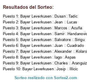 Lista de participantes: Bayer Leverkusen Marc Bartra, Bayer Leverkusen Jonas, Bayer Leverkusen Steve Mandanda, Bayer Leverkusen Shinji Kagawa, Bayer Leverkusen Manuel Lanzini, Bayer Leverkusen Manu Trigueros, Bayer Leverkusen Lucas Leiva, Bayer Leverkusen Domenico Criscito, Bayer Leverkusen Ever Banega, Bayer Leverkusen Medhi Benatia, Bayer Leverkusen Benjamin Verbic, Bayer Leverkusen Younes Belhanda, Bayer Leverkusen Samir Handanovic, Bayer Leverkusen Giuliano, Bayer Leverkusen Filipe Luis, Bayer Leverkusen Iago Aspas, Bayer Leverkusen Ciro Immobile, Bayer Leverkusen Viktor Tsygankov, Bayer Leverkusen Dani García.