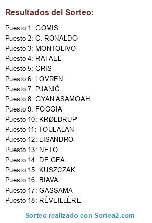 Lista de participantes: DE GEA, NETO, KUSZCZAK, GASSAMA, RAFAEL, RÉVEILLÈRE, LOVREN, BIAVA, CRIS, KRØLDRUP, PJANIĆ, FOGGIA, MONTOLIVO, TOULALAN, GOMIS, GYAN ASAMOAH, LISANDRO, C. RONALDO.
