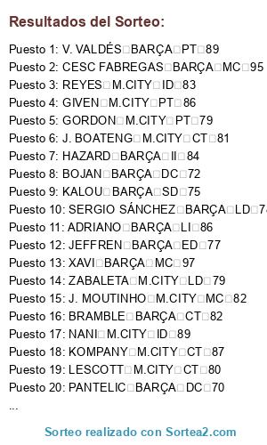 Lista de participantes: CESC FABREGAS BARÇA MC 95, NANI M.CITY ID 89, XAVI BARÇA MC 97, TÉVEZ M.CITY SD 87, TOURÉ YAYA M.CITY MC 86, SILVA M.CITY MP 85, KOMPANY M.CITY CT 87, V. VALDÉS BARÇA PT 89, ADRIANO BARÇA LI 86, J. MOUTINHO M.CITY MC 82, KOLAROV M.CITY LI 83, HAZARD BARÇA II 84, MICAH RICHARDS M.CITY LD 77, LLORENTE M.CITY DC 79, LESCOTT M.CITY CT 80, GIVEN M.CITY PT 86, REYES M.CITY ID 83, BRAMBLE BARÇA CT 82, THIAGO M.CITY MC 81, WILSHERE BARÇA MP 81, GUARÍN BARÇA MCD 79, RANOCCHIA BARÇA CT 82, J. BOATENG M.CITY CT 81, BOJAN BARÇA DC 72, KALOU BARÇA SD 75, ZABALETA M.CITY LD 79, GORDON M.CITY PT 79, JUANFRAN M.CITY ID 77, SERGIO SÁNCHEZ BARÇA LD 78, FEDERICO FAZIO BARÇA CT 76, MEGYERI BARÇA PT 75, J. HOLEBAS BARÇA LI 73, JEFFREN BARÇA ED 77, PANTELIC BARÇA DC 70, OSVALDO BARÇA DC 74.