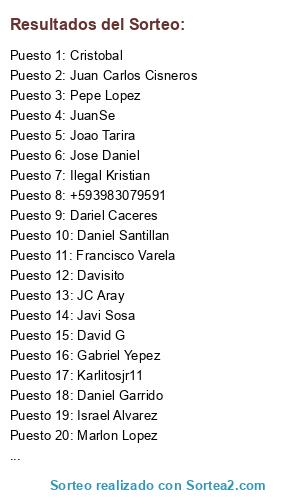 Lista de participantes: Alejo, Ab Jose Rendon, Alexander Hidalgo, Allan Suarez, Andres Altamirano, Andres Roman, Carlos Arana, Daniel Garrido, Daniel Santillan, Diego Guzman, Dariel Caceres, Francisco Vivar, Gabriel Toala, Ilegal Kristian, Javi Sosa, JC Aray, Joao Tarira, John Ruiz, Jonathan Samaniego, Jose Daniel, Juan Carlos Cisneros, Juan Ponce, Marlon Lopez, Miduvi, Neto Sanchez, Oscar Mier, Oswaldo, Ricardo Verdesoto, Romel Beltran, Roy Franco, Sebastian Mendoza, Karlitosjr11, Liber, JaviPando, Cristobal, Carlos Caceres, David G, Sergio Ortega, Teddy Espino, Franklin Romero, Luigui Eduardo, JuanSe, Sebas Ñauta, Pepe Lopez, Gabriel Yepez, Nico Delgado, Julian Miño, Cesar Cedeño, Jhon Arauz, Jorge Chaguay, Jose Quiroz, Guido T, Jose Luis Romero, Estiven Ruiz, Julio Franco Mogro, Francisco Varela, Israel Alvarez, Davisito, Christian Vera, Jose Ramirez, Wacho Mecias, Jose Garcia, +593983079591, +593992914985, +5493513671046.