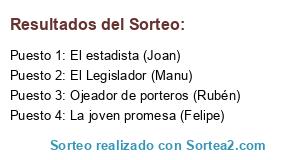 Lista de participantes: Ojeador de porteros (Rubén), El Legislador (Manu), La joven promesa (Felipe), El estadista (Joan).
