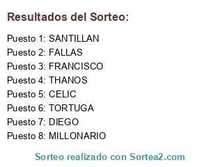 Lista de participantes: TORTUGA, CELIC, FALLAS, FRANCISCO, SANTILLAN, MILLONARIO, THANOS, DIEGO.
