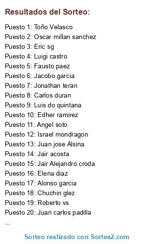 Lista de participantes: Robertito jimenez, Juan carlos padilla, Angel soto, Luigi castro, Toño Velasco, Jose manuel jonkar, Angel fz, Chuchin glez, Fausto paez, Carlos duran, Rodrigo carreon garcia, Juan pablo duarte, Oscar millan sanchez, Jonathan teran, Brayan chavez, Eric sg, Jair acosta, Roberto carlos Lerma, Juan manuel calderón garcia, Alonso garcia, Juan jose Alsina, Isra po, Elena diaz, Fobia cm, Gio reyes, Roberto vs, Jacobo garcia, Luis do quintana, Joaquin lsa mendoza, Jair Alejandro croda, Israel mondragon, Edher ramirez.