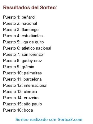 Lista de participantes: são paulo, atletico nacional, boca, nacional, internacional, liga de quito, peñarol, flamengo, cruzeiro, godoy cruz, olimpia, san lorenzo, estudiantes, palmeiras, grêmio, barcelona.