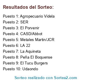 Lista de participantes: Peña El Boquense, La Aquineta, Agropecuario Videla, LA 22, SER, Udaondo, El Porvenir, Metales Martin/JCR, CASD/Abbot, El Tucu Burgers.