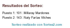 Lista de participantes: 1 Juan Quintana Goytiandia, 2 Margarita Soto, 3 Tiendas Emis, 4 Alejandra Vega, 5 Erika Yañez Jara, 6 Angelica Alvarez, 7 Mario Pacheco, 8 Ricardo Vargas Lopez, 9 Maria Correa Mella, 10 Jessica Ferrada, 11 Aravenacarmen, 12 Jeanette Torres Tapia, 13 LSol MBolivar, 14 Karen Garrido Reyes, 15 Erika Donoso Rojas, 16 Niniza Krstulovic Matte, 17 Seba Briceño Labra, 18 Robinson Astudillo León, 19 Nancy Valenzuela, 20 Gloria Ceron Cañoles, 21 Natalia Lopez, 22 Ana Luisa Venegas Funtealba, 23 Alfredo Peña Acevedo, 24 Lorena Villacura, 25 Brunilda Gutierrez, 26 Diaz Flores Juan, 27 Veronika Portales, 28 Ingrid Perez Rocuant, 29 Mariana Andrea Farias, 30 Carolina Rey, 31 Патрисио Монтечинос, 32 Antonia Barrera Muñoz, 33 Lorena Tobar, 34 Mónica Aqueveque, 35 Iris Richter Campos, 36 Francisca Pedraza Veliz, 37 Berta Vasquez, 38 Alicia Maldonado, 39 Monica Villacura Navarro, 40 Loreto Jimenez, 41 Luz Maria Barrientos, 42 Cecilia Brito Guerra, 43 Danny Osorio Abarca, 44 Maria Velozo, 45 Mari Villa, 46 Erika Lizama Nuñez, 47 Claudia Gonzalez Oyarzun, 48 Gabriela Martinez Millaqueo, 49 Rubi Cordova, 50 Eva Toloza Riquelme, 51 Tiare Zúñiga Rojas, 52 Hector Riquelme Mendez, 53 Jaquelin Contreras Farias, 54 Soledad Flores, 55 Xu Xa Na, 56 Rebeca Orellana Borie, 57 Veronica Martinez, 58 Juan Muñoz Ramirez, 59 Isabel Martinez, 60 Maria Palomera, 61 Tollitaclau Lagos, 62 Maria Jose Monges, 63 Yocelyn Rios Ripetti, 64 Ana Alvarado Durney, 65 Marcela Escobar Labra, 66 Juana Arce Aguilera, 67 Soledad Oses Padilla, 68 Esther Alvarado, 69 Claudia Rodriguez Quiroz, 70 Artemisa Nykol, 71 Angelica Quiroz, 72 Geraldine Correa, 73 Amelia Catalán Albornoz, 74 Mireya Moreno Madriaga, 75 Jessica Figueroa Jorquera, 76 Silvana Aravena, 77 Paula Albina Leiva Ramirez, 78 Cesar Millanao Arancivia, 79 Claudia Traro, 80 Cecilia Rojas Ponce, 81 Rossana Espinoza Bustamante, 82 Francisca Marin, 83 Erica Carvajal, 84 Irene Zamorano, 85 Guillermina Chandia, 86 Grace Trincado, 87 Alejandra Meza Contreras, 88 Manuel Cienfuego, 89 Sabrina Barahona, 90 Marcela Aguilera, 91 Karma Liu, 92 Marina Correa Espinosa, 93 Beatriz Cortes, 94 Cristian Paredes Naranjo, 95 Maria Lorena Baeza, 96 Susana Cifuentes Collao, 97 Erika Espinoza Castro, 98 Erica Áravena Sandoval, 99 Leslie Cordova Gonzalez, 100 Paola Alejandra Tamayo, 101 Millaray Mardones, 102 Yerko Urtubia, 103 Maria Eugenia Jara, 104 Viviana Olmedo Naranjo, 105 Felipe Alegre Jorquera, 106 Elisa Pinto Castro, 107 Emma Florian, 108 Hilda Illanes, 109 Claudia Bascuñán, 110 Maca Yáñez, 111 Cristian Saldias, 112 Marlene Leon Rodriguez, 113 Valentina Figueroa, 114 Carola Salgado Reyes, 115 Johanna Alcantara Carrasco, 116 Lara Stephanie, 117 Lorena Trenfo, 118 Mario Berríos Córdova, 119 Solange Navarrete, 120 Sol Molina Cardenas, 121 Kathy Iturriaga, 122 Claudia Bustos, 123 Zaidita Inostroza Valenzuela, 124 Goretty Matilda Moya, 125 Scarlette Faunes, 126 Nelson Urbina, 127 Eliacim Manriquez, 128 Patricia Painevilo Lincoñir, 129 Magaly Andrea Dìaz Ibañez, 130 Monica Figueroa Jorquera, 131 Erika Cavieres Montenares, 132 Tito Tito, 133 Priscilla Ramirez Rubio, 134 Daisy Donoso, 135 Paulina Vergara Castillo, 136 Tere Fuentes, 137 Linda Barrera, 138 Claudia González Muñoz, 139 Jani Ugarte, 140 Elizabeth Adrián Rojas, 141 Norma Abarca, 142 Elizabeth Berríos Cordova, 143 Naty Farías Vilches, 144 Pamela Carolina Rubio, 145 Patricia Segovia, 146 Veronica González Gálvez, 147 Elizabeth Villanueva, 148 Jacqueline Cifuentes Marechal, 149 Claudia Morales Roa, 150 Karina Morales Roa, 151 Ceci María, 152 Valeska Alejandra Fierro, 153 Alba Tapia, 154 Hector Aravena, 155 Jessica Perez Ortiz, 156 Andrea Carolina, 157 Alejandra Aravena, 158 Jaime Tarifeño, 159 Roxy Segura Trabol, 160 Jessica Carvacho, 161 Jimena Miranda, 162 Katherine Carrasco, 163 Ana Corina Guajardo, 164 Delia Briceño, 165 Fernando Heredia Collao, 166 Jacqueline Zuñiga Pedraza, 167 Cecilia Esther, 168 Teresa Romero, 169 Leonel Pino Aguilera, 170 Agustina Silva, 171 Estrella Plaza Navarro, 172 María Hurtado Loyola, 173 Marioles Wenul.