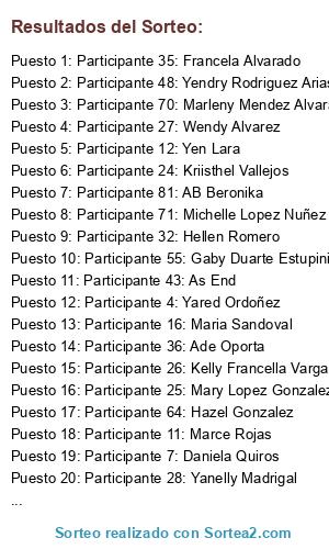 Lista de participantes: Participante 1: Yoconda Ruiz , Participante 2: Rossy Cruz Perez , Participante 3: Joselyn Vargas Elizondo , Participante 4: Yared Ordoñez , Participante 5: Mariam Solano , Participante 6: Monii Alvarez , Participante 7: Daniela Quiros , Participante 8: Ary EU , Participante 9: Suzeth Contreras Mendez , Participante 10: Maria E Mora Ch , Participante 11: Marce Rojas , Participante 12: Yen Lara , Participante 13: Andrea Solano , Participante 14: Ariss Cruz , Participante 15: Ross Ch Ramirez , Participante 16: Maria Sandoval , Participante 17: Cindy Calvo Aguero , Participante 18: Shirley Mondragon , Participante 19: Vero Barahona Ugalde , Participante 20: Tracy Rojas , Participante 21: Brenda Paniagu... , Participante 22: Andry Paniagua López , Participante 23: Jennifer Arias Alvar... , Participante 24: Kriisthel Vallejos , Participante 25: Mary Lopez Gonzalez , Participante 26: Kelly Francella Vargas Suarez , Participante 27: Wendy Alvarez , Participante 28: Yanelly Madrigal , Participante 29: Denisse Paola Ávila , Participante 30: Josette Guerrero Porras , Participante 31: Yendry Gonzalez Mesen , Participante 32: Hellen Romero , Participante 33: Jenifer Cortes , Participante 34: Melanie Sequeira Mairena , Participante 35: Francela Alvarado , Participante 36: Ade Oporta , Participante 37: Nathaly Rojas Cruz , Participante 38: Ale C. Nuñez , Participante 39: Katherine Barrantes , Participante 40: Nico Kiechle , Participante 41: Diana Morera , Participante 42: Angelica Porras Martinez , Participante 43: As End , Participante 44: Kennya Mendez , Participante 45: Sol Marina Vivanco Kassay , Participante 46: Les Sophie Viquez , Participante 47: Mauren Chaves Arias , Participante 48: Yendry Rodriguez Arias , Participante 49: Ariana Peña Lara , Participante 50: Lindsay Ramirez Quesada , Participante 51: Katherine Benavides , Participante 52: Alexa Gonzalez Roldan , Participante 53: Leonela Cruz , Participante 54: Magdalena Varela Pasos , Participante 55: Gaby Duarte Estupinian , Participante 56: Mey Delgado , Participante 57: Valeria Hidalgo Riggioni , Participante 58: Yuliana Elizondo Herrera , Participante 59: Karina Vargas , Participante 60: Adayirena Perez Cruz , Participante 61: Anguie Carrillo , Participante 62: Murillo Ugalde Scarlis , Participante 63: Indra Leon , Participante 64: Hazel Gonzalez , Participante 65: Jossy Madriz , Participante 66: Fressy Nuñez , Participante 67: Brenda Duran Ruiz , Participante 68: Maria Fernanda Duran , Participante 69: Edith Miranda , Participante 70: Marleny Mendez Alvarado , Participante 71: Michelle Lopez Nuñez , Participante 72: Brenda Fonseca Canales , Participante 73: Karol Barrantes , Participante 74: Michii Hernandez , Participante 75: Nathaly Calvo , Participante 76: Valery Carrillo Esquivel , Participante 77: Pamela Alfaro Paniagua , Participante 78: Fabiola Cruz Mendez , Participante 79: Franchesca Umaña , Participante 80: Marita Soto Alvarez , Participante 81: AB Beronika , Participante 82: Arce Cianny , Participante 83: Suzetty C. Zamora , Participante 84: Samantha Castro Jimenez , Participante 85: Karina Paniagua Castro , Participante 86: Amberly Villalobos Vargas , Participante 87: Katty Contrerass , Participante 88: Nany GM , Participante 89: Veronica Gabriela , Participante 90: Isabel Chavarria Cortes , Participante 91: Enid Vargas , Participante 92: Wen Perez , Participante 93: Natalia Alvarez Rojas.