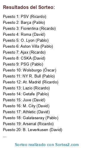 Lista de participantes: PSG (Pablo), Barça (Pablo), M. United (Pablo), O. Lyon (Pablo), Liverpool (Pablo), Marsella (Pablo), Sevilla (Pablo), Galatasaray (Pablo), Aston Villa (Pablo), NY R. Bull (Pablo), Napoles (Pablo), Anzhi (Pablo), Flamengo (Pablo), Levante (Pablo), Getafe (Pablo), Granada (Pablo), B. Dortmund (Ricardo), Arsenal (Ricardo), At. Madrid (Ricardo), Zenit (Ricardo), Valencia (Ricardo), Ajax (Ricardo), Fulham (Ricardo), Swansea (Ricardo), QPR (Ricardo), Udinese (Ricardo), Fiorentina (Ricardo), Lazio (Ricardo), PSV (Ricardo), Deportivo (Ricardo), S. Lisboa (Ricardo), Celtic (Ricardo), R. Madrid (Óscar), Chelsea (Óscar), B. Munich (Óscar), Tottemham (Óscar), Oporto (Óscar), Santos (Óscar), Benfica (Óscar), Osasuna (Óscar), Lille (Óscar), RM Castilla (Óscar), Montpellier (Óscar), W. Bremen (Óscar), Wolsburgo (Óscar), B. Monchedgladbach (Óscar), Valladolid (Óscar), Celta (Óscar), M. City (David), Milan (David), Juve (David), Inter (David), Athletic (David), Roma (David), Schalke 04 (David), Málaga (David), Spartak M. (David), CSKA (David), B. Leverkusen (David), LA Galaxy (David), Betis (David), Newcastle (David), R. Sociedad (David), Internacional Porto A. (David).