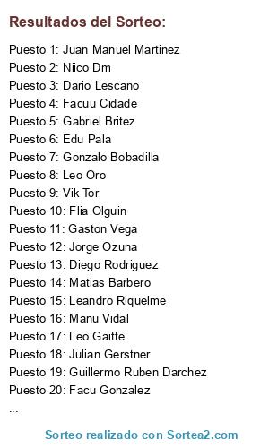 Lista de participantes: Manu Vidal, Leo Gaitte, Federiico Nicolas, Gabriel Britez, Roke Rojo, Guillermo Ruben Darchez, Jorge Ozuna, Exee Comparin, Gonzalo Bobadilla, Edu Pala, Niico Dm, Julian Gerstner, Daniel Pampameo, Vik Tor, Carlos Eduardo Rasgido, Guille Man, Lucas Papatella, Ronald Fernandez, Leandro Riquelme, Gaston Vega, Dario Lescano, Flia Olguin, Facu Gonzalez, Leo Oro, Juan Manuel Martinez, Diego Rodriguez, Facuu Cidade, Garcete Pes, Rodrigo Maldonado, Matias Barbero.
